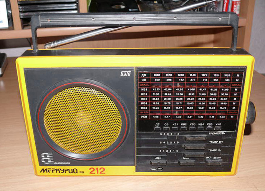 Портативный радиоприёмник *Меркурий РП-212* с 1996 года выпускал Уфимский завод коммутационной аппаратуры. Радиоприёмник рассчитан на приём радиостанций в диапазонах: ДВ, СВ, КВ (5 поддиапазонов 16, 19, 25, 31 и 41 м) и УКВ 65,8...74 МГц. Переключение диапазонов и настройка - электронные. Приёмник имеет бесшумную настройку, систему АПЧ в ЧМ тракте, систему БШН, индикатор включённого диапазона, устройство отключения батарей при питании от сети, телескопическую антенну. В АС установлена широкополосная головка 3ГДШ8-4. Питание от сети, через БП или от 6-ти элементов A-316. Чувствительность в диапазонах: ДВ 1,8, СВ 0,7, KB - 0,25, УКВ - 0,05 мВ/м. Диапазон воспроизводимых частот тракта AM - 150...3150, ЧМ - 150...10000 Гц. Максимальная выходная мощность 2 Вт. Габариты радиоприёмника 262х161х53 мм. Масса 1,2 кг. С 1997 года приёмник стал именоваться *БЭТО РП-212*.