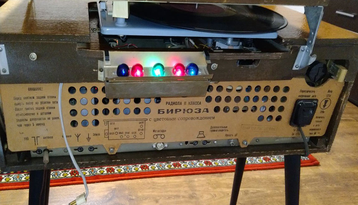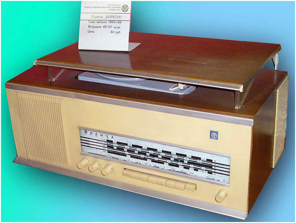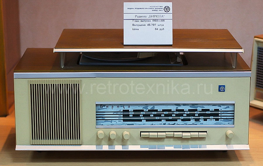 Радиолу *Бирюза* с 1968 года выпускал Муромский завод РИП. Радиола *Бирюза* выпускалась в 2-х вариантах: с цветовым сопровождением радио и музыкальных программ и без него. Радиола рассчитана на приём радиостанций в диапазонах ДВ, СВ, КВ, УКВ и для проигрывания грампластинок. В радиоле установлено ЭПУ типа III-ЭПУ-28, имеющее три скорости вращения диска; 33, 45, 78 об/мин, пьезокерамический звукосниматель и автостоп. АС радиолы состоит из двух громкоговорителей типа 4ГД-28 и 1ГД-28. Избирательность в тракте АМ около 34 дБ. Полоса воспроизводимых звуковых частот тракта АМ - 100...4000 Гц, УКВ ЧМ и грамзаписи - 100...10000 Гц. Номинальная выходная мощность УНЧ 1,5 Вт. Чувствительность в АМ тракте - 150 мкВ, ЧМ - 20 мкВ. Питается радиола от электрической сети 127 или 220 В. Габариты радиолы 634х350х298 мм. Масса 18 кг. По своей конструкции и электрической схеме радиола схожа с радиолой **Гамма-В**, но не имеет экрана для ЦМУ.