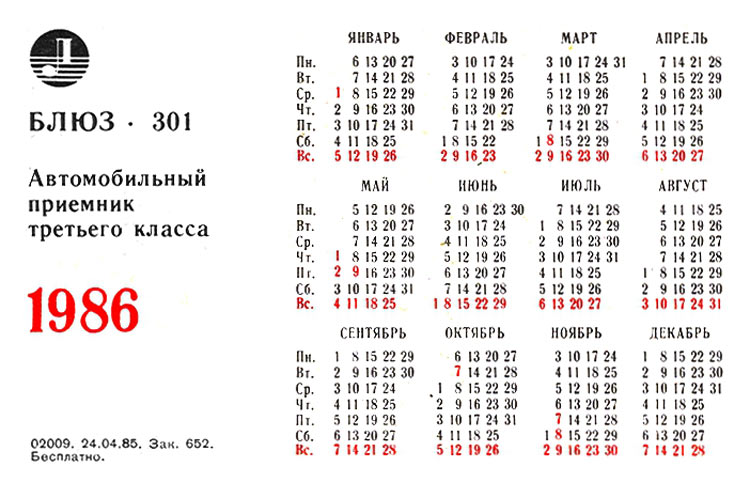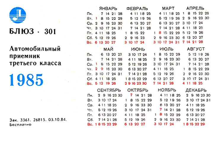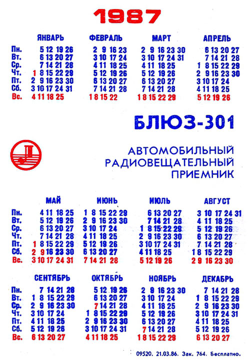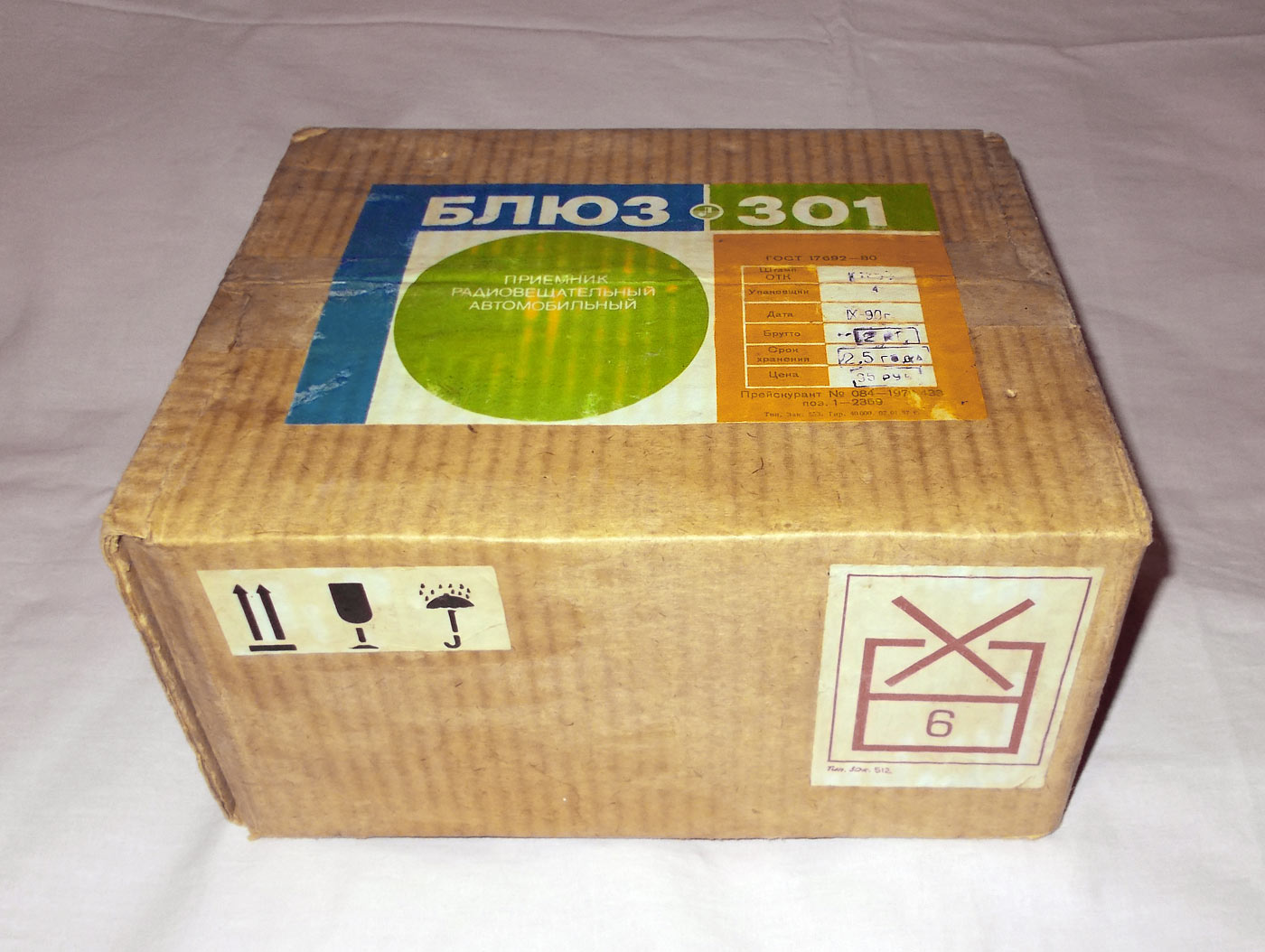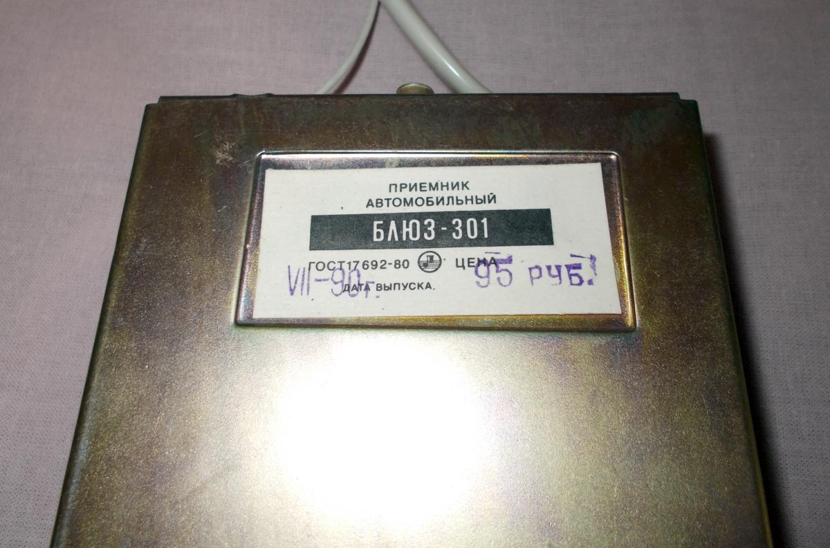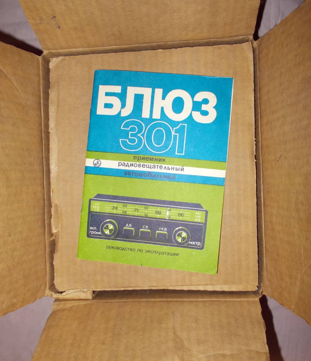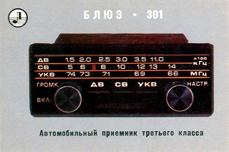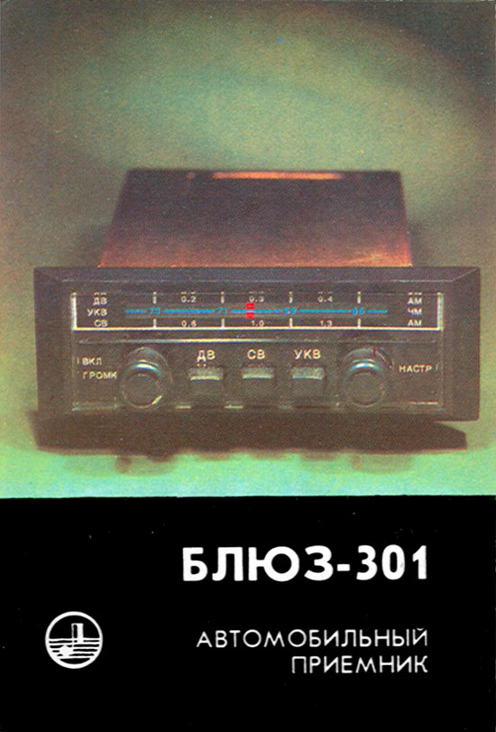 Радиоприёмник автомобильный *Блюз-301* с 1985 года выпускало Ленинградское ПО *Ленинец*. Приёмник предназначен для установки в салонах легковых автомобилей «ВАЗ». Он обеспечивает приём в диапазонах ДВ, СВ и УКВ-ЧМ, имеет плавную настройку на радиостанцию, плавную регулировку громкости, кнопочный переключатель диапазонов. Лицевая часть модели изготовлена из ударопрочного полистирола, а корпус из специальной листовой жести. Чувствительность в диапазонах: ДВ - 220 мкВ, СВ - 60 мкВ, УКВ - 5 мкВ. Диапазон воспроизводимых частот тракта АМ - 100...4000 Гц, тракта ЧМ - 100...10000 Гц. Номинальная выходная мощность 1, максимальная 2,5 Вт. Напряжение питания от 10,8...15,6 В. Габариты РП без ручек и угольников крепления 39х96х157 мм. Вес с громкоговорителем, без упаковки 1,6 кг. Цена 95 рублей.