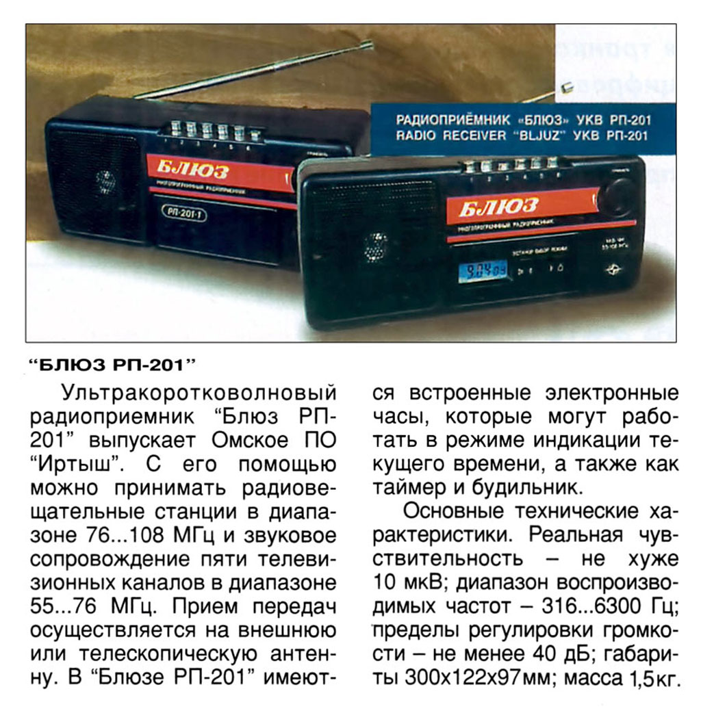 Стационарный транзисторный радиоприёмник *Блюз РП-201* с 1996 года выпускало Омское ПО *Иртыш*. Приёмник предназначен для приёма радиовещательных станций в УКВ диапазоне, а так же звукового сопровождения телевидения с 1 по 5 канал. Приёмник имеет: предварительную настройку на шесть фиксированных частот в любом из двух диапазонов 56...74 или 83...108 МГц; телескопическую антенну; гнездо наружной антенны; индикацию часов; включение приёмника в заданное время; подачу одиночного звукового сигнала так же в заданное время; регулятор громкости будильника и возможность настольного или настенного размещения. Диапазон звуковых частот 316...6300 Гц. Чувствительность 10 мкВ. Диапазон регулировки громкости 40 дб. Питание от сети 220 В. Размеры приёмника 300х122х99 мм. Масса 1,5 кг. Радиоприёмник *Блюз РП-201-1* полностью аналогичен базовому, но не имеет таймерного устройства.
