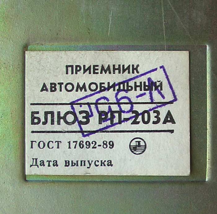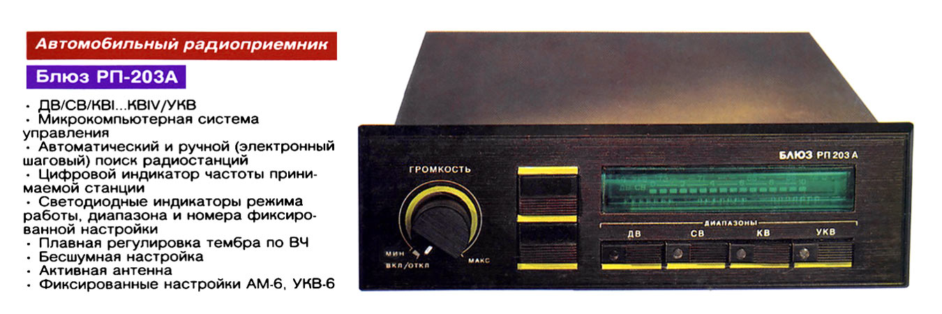 Радиоприёмник автомобильный *Блюз РП-203А* с I-кв 1990 года выпускало Ленинградское ЦНПО *Ленинец*. Радиоприёмник работает в диапазонах ДВ, СВ, КВ (30,6...31,6 м) и УКВ-ЧМ. В нём применена люминисцентная шкала настройки, автомаический поиск станций. Номинальная выходная мощность 5 Вт, максимальная 10 Вт. Диапазон рабочих частот по напряжению на выходе для громкоговорителя в диапазоне УКВ-ЧМ - 40...12500 Гц.