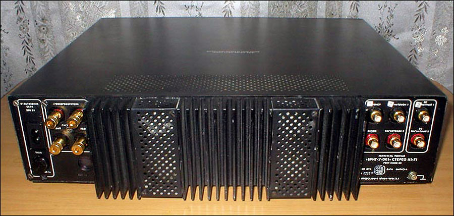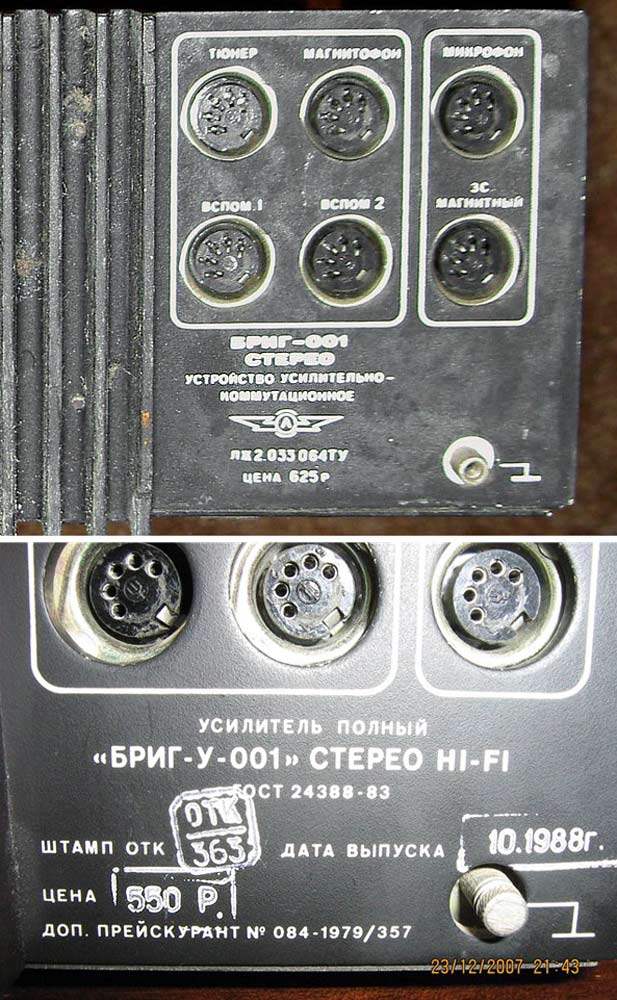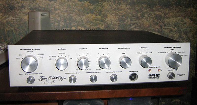 Усилительно коммутационное устройство *Бриг-001-стерео* с 1975 года выпускали Ленинградское объединение *Океанприбор* и Кировский завод *Ладога*. УКУ **Бриг-001-стерео**, позднее **Бриг У-001-стерео** предназначено для высококачественного усиления музыкальных и речевых программ с микрофона, магнитного или пьезоэлектрического звукоснимателя, тюнера, магнитофона и других источников сигналов. В УКУ имеется ступенчатая регулировка громкости и тембра, возможность изменения АЧХ с помощью фильтров ВЧ и НЧ, имеется система мягкого включения, исключающая щелчки при включении или выключении, защита от КЗ в нагрузке, световая индикация сети, перегрузки каналов. К УКУ можно подключить четыре АС с сопротивлением от 4 до 8 Ом и стереотелефоны. УКУ имеет низкий уровень шума, малые искажения, линейность АЧХ. Номинальная выходная мощность на нагрузке 8 ом, 2х50 Вт. Диапазон рабочих частот 20...25.000 Гц. Коэффициент гармоник 0,1 %. КНИ - 0,15 %. Разделение каналов на частоте 1 кГц 50 дБ. Отношение сигнал/взвешенный шум 86 дБ. Потребляемая мощность 150 Вт. Габариты УКУ - 452х372х118 мм. Его масса 15 кг.