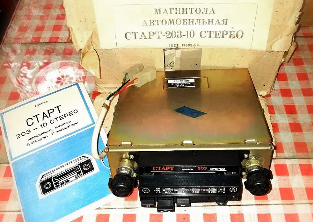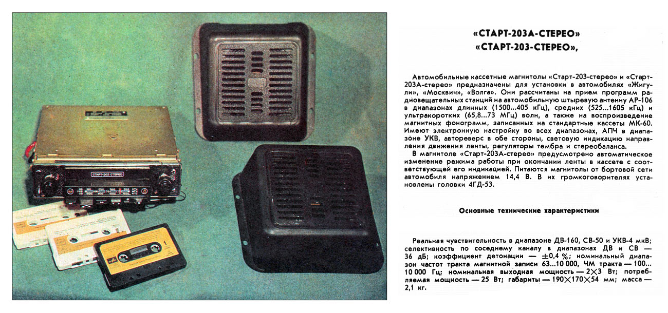 Автомагнитола *Cтарт-203 стерео* с 1985 года выпускал Муромский радиозавод. Автомобильная кассетная магнитола **Старт-203-стерео** выпускалась в нескольких вариантах, буква или цифра после наименования обозначала автомобиль для которого она предназначалась. От буквы и цифры изменялся только способ крепления в автомобиле, основная же конструкция и схема МЛ была неизменной. Магнитола предназначена для установки в автомобили Жигули, Москвич, Волга. Она рассчитана на приём радиостанций на автомобильную штыревую антенну типа **АР-106** в диапазонах ДВ, СВ и УКВ, а так же на воспроизведение фонограмм, записанных на кассетах МК-60. Магнитола имеет электронную настройку, АПЧ в диапазоне УКВ, автореверс, световую индикацию направления движения ленты, регуляторы тембра и стереобаланса. В магнитоле **Старт-203А-стерео** имеется автоматический переход на приём при окончании ленты, с индикацией. В каждой из АС установлены головки 4ГД-53. Для автомобиля ГАЗ-3102 в комплект входило четыре АС с головками 3ГД-42. Чувствительность, мкВ: ДВ 160, СВ 50, УКВ 4. Селективность ДВ, СВ 36 дБ. Коэффициент детонации ± 0,4%. Диапазон рабочих частот звука по тракту магнитной записи 63...10000 Гц, по УКВ-ЧМ тракту 100...10000 Гц. Номинальная выходная мощность 2х3 Вт. Габариты модели 190х170х54 мм. Вес 2,1 кг. Завод одновременно, но в гораздо меньшем количестве выпускал полный аналог магнитолы модель **Былина-203-стерео**.