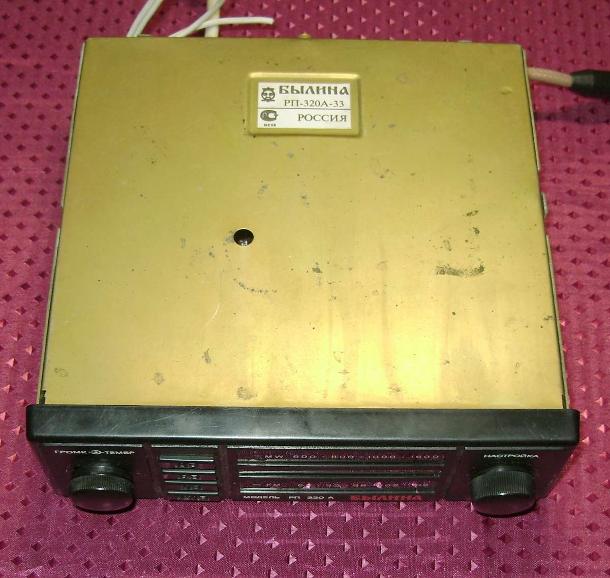 Радиоприёмник автомобильный *Былина РП-320А* выпускал с 1994 года ОАО *Муромский радиозавод*. Радиоприёмник выпускали в нескольких вариантах, обозначавшиеся цифрами, например 33. От варианта зависел диапазон УКВ: 65...74 или 88...108 МГц, а также для какого автомобиля предназначен приёмник. У нас это автомобили ВАЗ 2108,09. Диапазоны ДВ, СВ, КВ (9,5...9,8 МГц) и УКВ. Переключение диапазонов электронное с индикацией. Регулятор тембра по ВЧ трёхпозиционный. Шкала с подсветкой. Подробнее о модели смотрите в инструкции по эксплуатации.