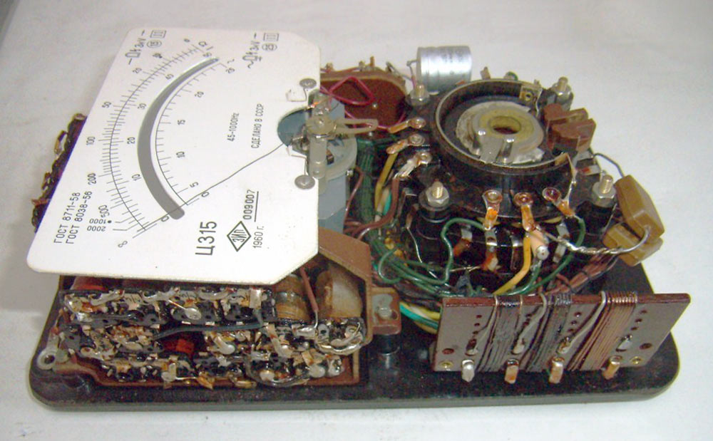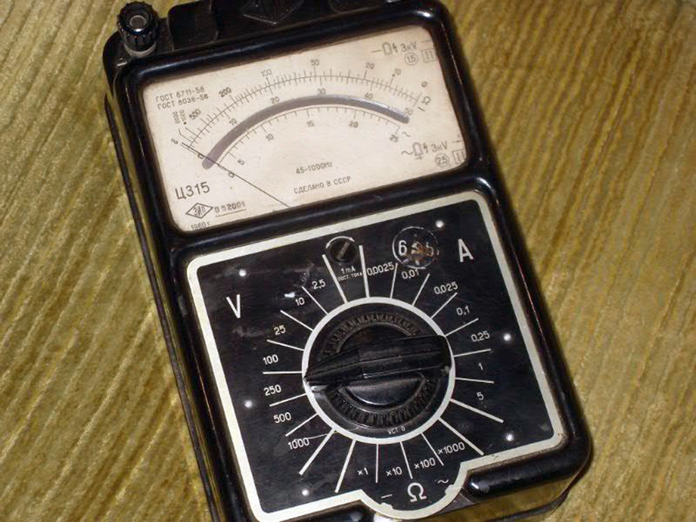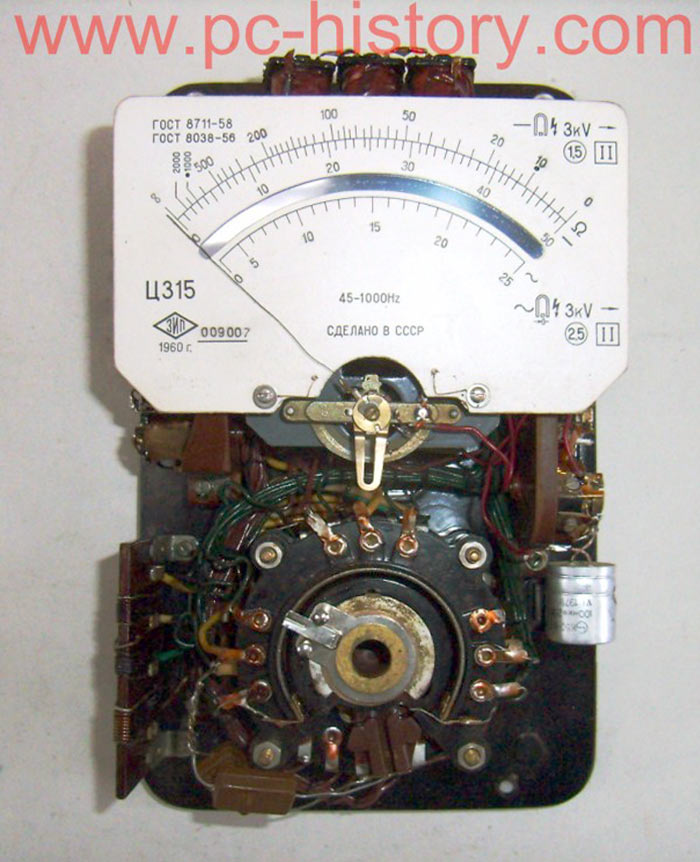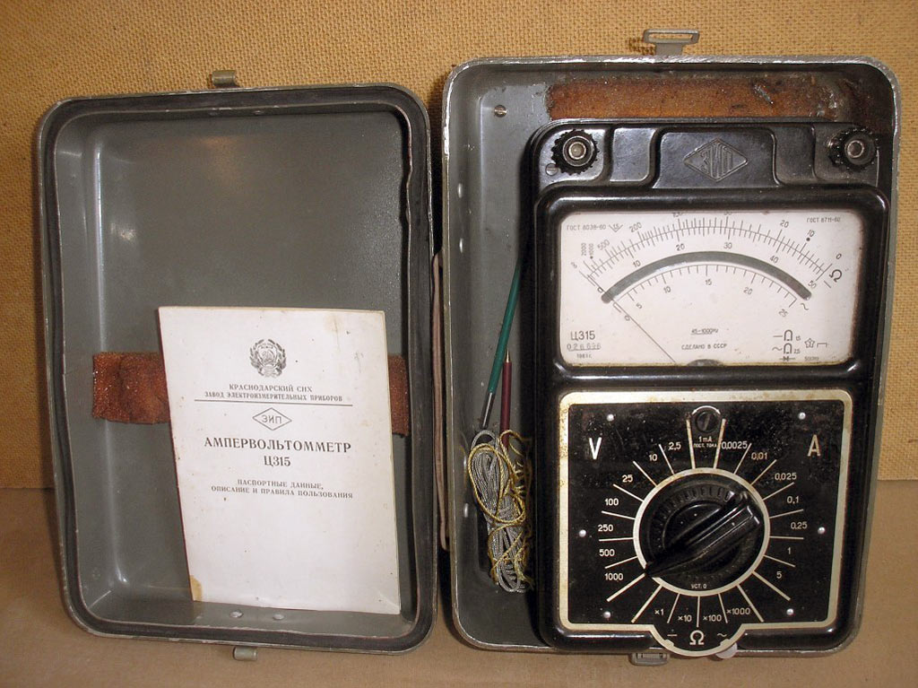 Комбинированный измерительный прибор *Ц-315* с I-кв 1959 года выпускал Краснодарский ЗИП. Комбинированный измерительный прибор **Ц-315** предназначен для измерений значений постоянного или переменного напряжения, тока и сопротивлений. Диапазоны измеряемых напряжений лежат в пределах от 0 до 1000 вольт, силы тока от 0 до 5 ампер, сопротивлений от 0 до 1 мегома, а с внешним питанием в 30...40 В и больших значений, до 10 мегом. Омметр измерительного прибора питается от трёх элементов типа ФБС-0,25.
