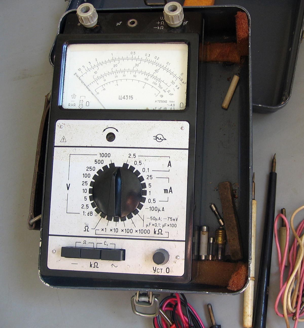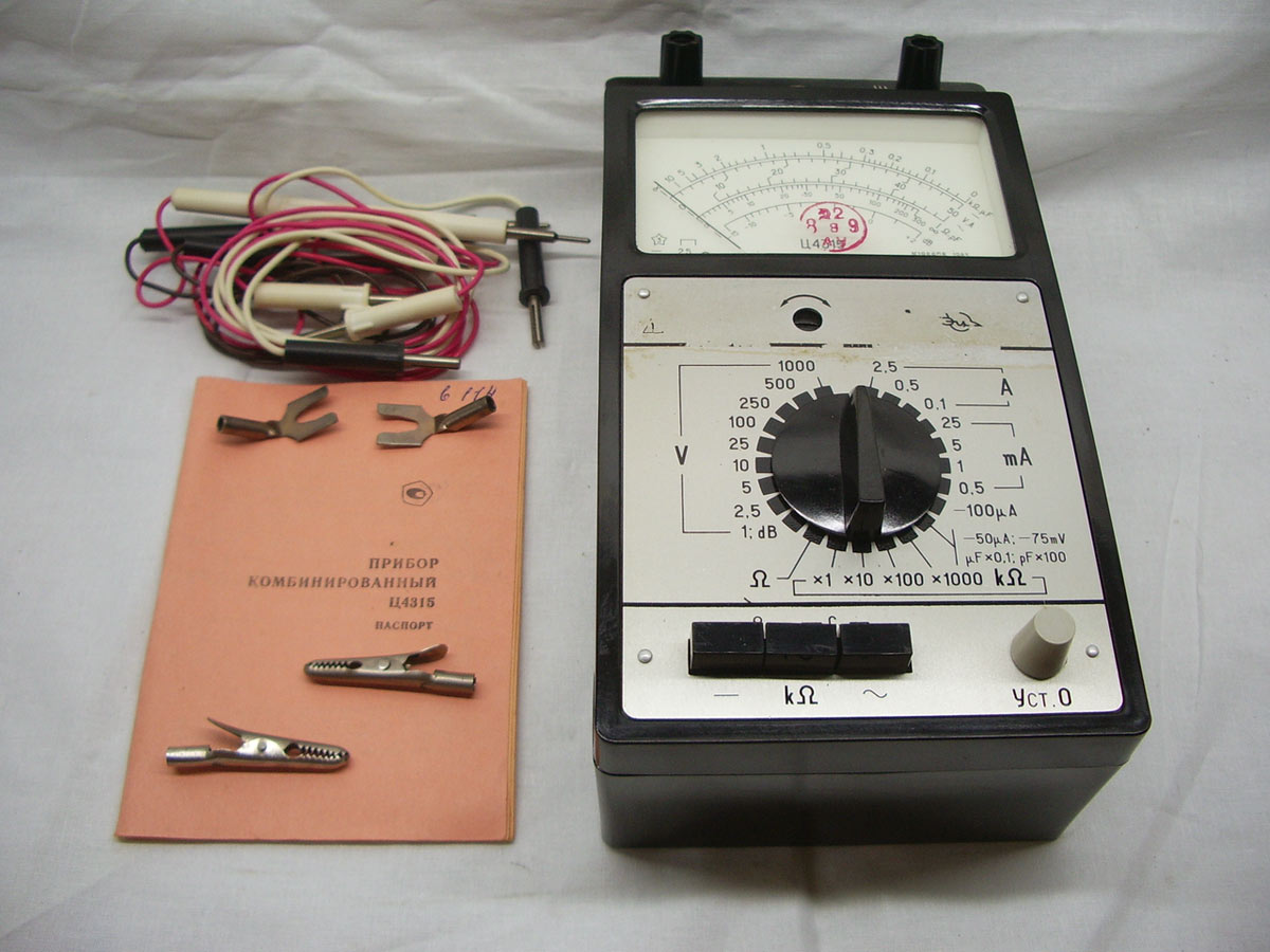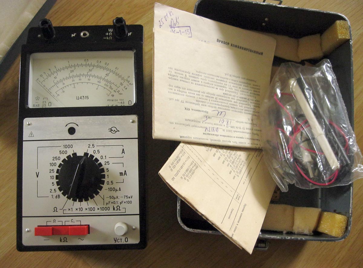 Комбинированный прибор *Ц-4315* с 1978 года выпускал Сарапульский завод им. Орджоникидзе. Предназначен для измерения тока и напряжения в цепях постоянного и переменного тока синусоидальной формы частотой 45...20.000 Гц, сопротивлений переменному току и уровня передачи. Характеристики Входное сопротивление прибора Ц4315 при измерении: постоянного напряжения — 20000 Ом/В; переменного напряжения — 2000 Ом/В. Основная погрешность мультиметра Ц3415 нормируется в диапазоне температур от +15 до +25°С для прибора Ц4315. Рабочий диапазон температур прибора Ц3415 от минус 10 до плюс 40°С, относительная влажность до 80% (при температуре +30°С). Предельные условия транспортирования мультиметра Ц3415 от минус 40 до плюс 60°С, относительная влажность до 95% (при температуре +30°С). Имеется возможность расширения диапазона измерения относительного уровня переменного напряжения. Основная погрешность определяется при нормальных значениях влияющих величин и не превышает: ±2,5% от конечного значения шкалы при измерении на постоянном токе; ±2,5% от длины рабочей части шкал «Ω, pF», «кΩ, pF», равных соответственно 59 и 79 мм при измерении сопротивления.