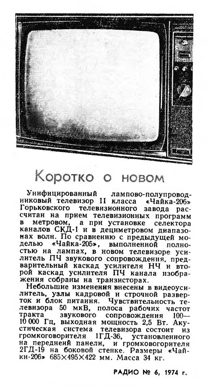 Телевизионный приёмник чёрно-белого изображения *Чайка-206* с 1972 года выпускал Горьковский телевизионный завод имени В.И.Ленина. Унифицированный ч/б телевизор **Чайка-206** выпускался в настольном и напольном вариантах. Футляр отделан деревом ценных пород, передняя панель пластмассой, а правая её часть выполнена решеткой, где расположен ВЧ громкоговоритель. Основной громкоговоритель установлен на левой стенке футляра и закрыт решёткой. Основные ручки для управления находятся справа: ручка настройки ДМВ, переключатель МВ-ДМВ, яркости, контрастности, громкости, ПТК, кнопки включения и выключения. Сзади телевизор закрыт стенкой с отверстиями. Телевизор работает на любом из 12 каналов МВ диапазона и в любом канале ДМВ при установке блока СКД-1. Имеется система АПЧГ для переключения программ без регулировок. АРУ обеспечивает устойчивость изображения. АПЧ и Ф сводит влияние помех до минимума. Имеется возможность записи звука на магнитофон, громкость и тембр при этом на запись не влияют. Кроме того телевизор обеспечивает прослушивание звука головными телефонами с отключенными громкоговорителях. С проводного ПДУ возможна регулировка громкости, яркости, а так же отключение громкоговорителей. Пульт ДУ не входит в комплект телевизора. Питание телевизора осуществляется от электрической сети переменного тока 127 или 220 вольт.