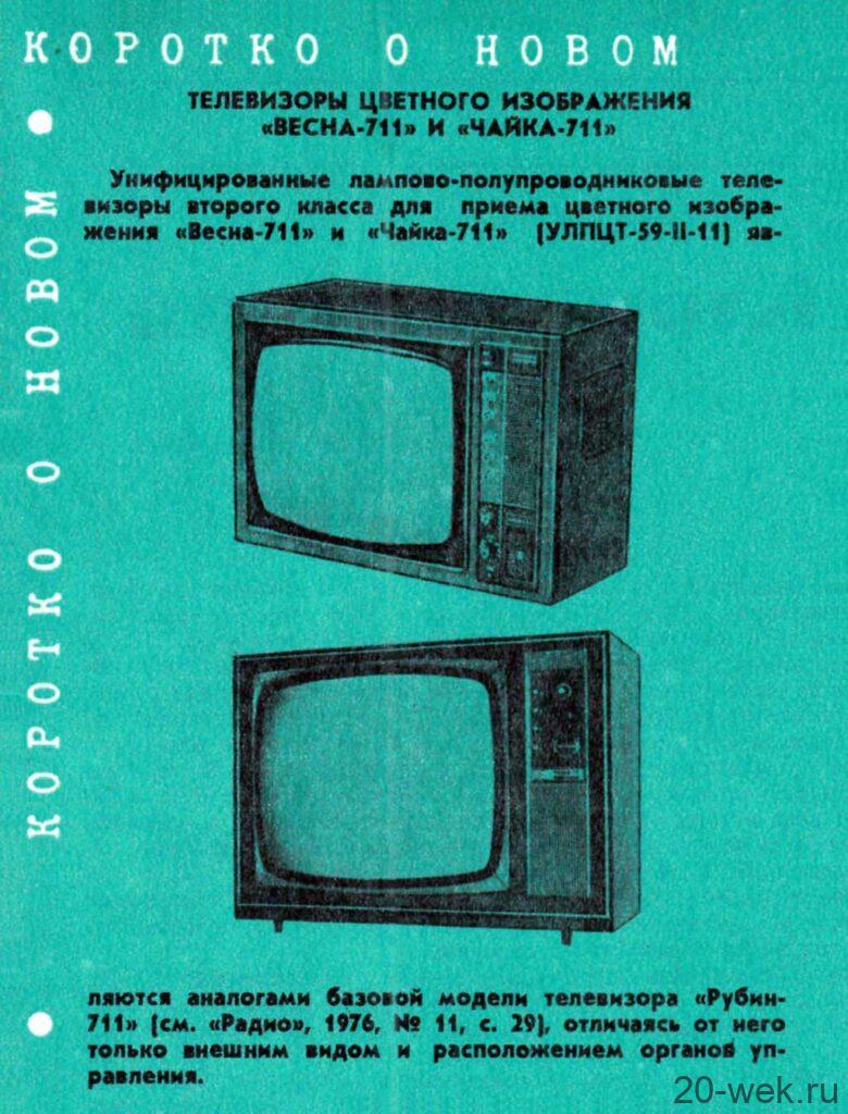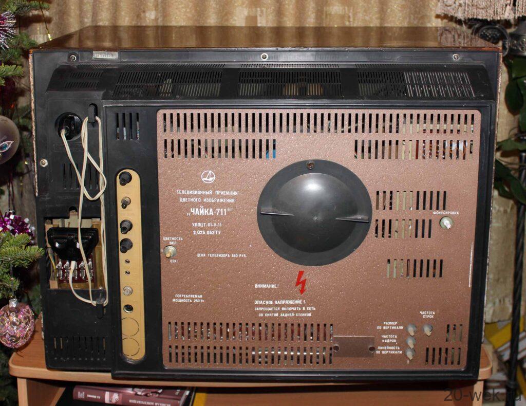 Цветной телевизор "Чайка-711/Д" с начала 1975 года выпускал Горьковский телевизионный завод имени В.И.Ленина. Унифицированный лампово-полупроводниковый цветной телевизор второго класса ''Чайка-711/Д'' (УЛПЦТ-59-II-11/10) предназначен для приёма программ в цветном и чёрно-белом изображении. Телевизор является аналогом модели Рубин-711'', отличаясь лишь оформлением. В телевизоре предусмотрена возможность установки блока СКД для приёма в диапазоне ДМВ, а в телевизоре с индексом "Д" блок СКД уже установлен. Чувствительность телевизора в МВ диапазоне - 50 мкВ. Номинальная выходная мощность канала звукового сопровождения не менее 1,5 Вт. Диапазон воспроизводимых звуковых частот - 80...12500 Гц. Потребляемая от сети мощность - 250 Вт. Габариты телевизора - 529 х 550 х 787 мм. Его масса - 55 кг. Цена - 650 рублей.