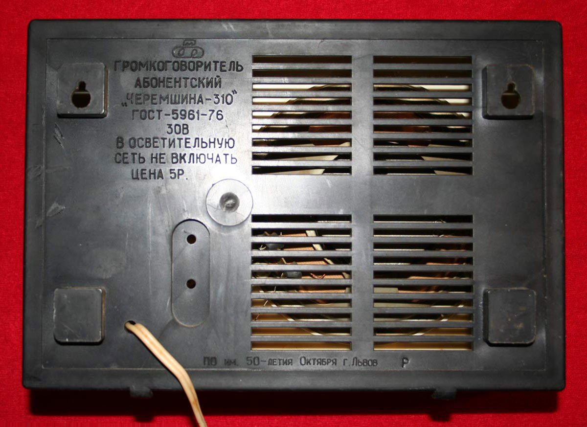Абонентский громкоговоритель "Черемшина-310" предположительно с 1982 года выпускало Львовское ПО имени 50-летия Октября (ранее это был Львовский завод телеграфной аппаратуры). Абонентский громкоговоритель "Черемшина-310" предназначен для воспроизведения низкочастотной программы, передаваемой по местным проводным сетям с напряжением 30 В. В модели применён громкоговоритель 1ГД-30 и малогабаритный переходной трансформатор. Номинальная входная мощность - 0,15 Вт. Среднее звуковое давление - 0,25 Па. Диапазон рабочих звуковых частот 160...5000 Гц. КНИ - 8%. Входное сопротивление 3,6 кОм. Габариты громкоговорителя - 250х166х78 мм. Масса - 1,5 кг. Розничная цена - 5 рублей.