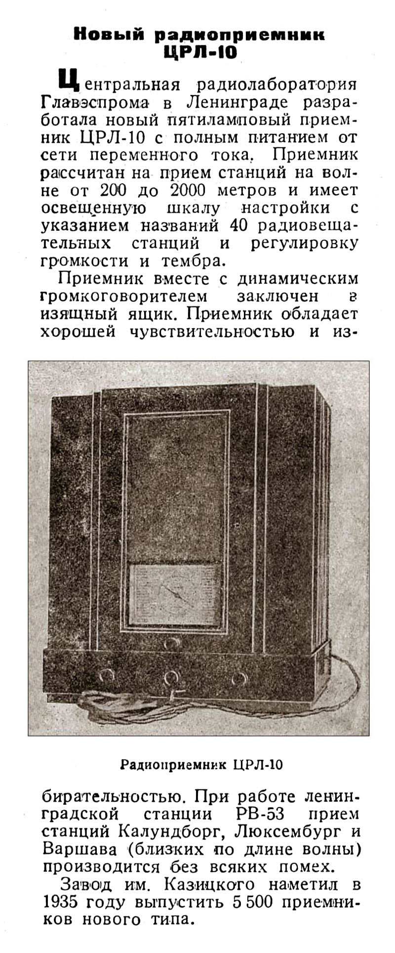Радиоприёмник сетевой ламповый *ЦРЛ-10* и *ЦРЛ-10К* с 1935 и 1936 года выпускал Ленинградский завод имени Козицкого. С осени 1935 года выпускался первый массовый серийный отечественный супергетеродин **ЦРЛ-10** (Центральной Радио-Лаборатории 10-я разработка). Схема радиоприёмника выполнена на 5-ти радиолампах с 4-х вольтовым накалом типов СО-183, СО-182, СО-193, СО-187. В выпрямителе установлена лампа ВО-116. Радиоприёмник *ЦРЛ-10* сетевой, 110, 127, 220 В, работает в диапазонах: ДВ 740...1900 м, и СВ 220...550 м. Чувствительность радиоприёмника 150...500 мкВ. Избирательность по соседнему каналу 24 дБ, по зеркальным каналам 8...12 дБ. ПЧ равна 110 кГц. Номинальная выходная мощность радиоприёмника 1 Вт. Потребляемая от сети мощность 100 Вт. Имеются гнёзда для подключения внешнего звукоснимателя. Регулятор громкости и тембра ВЧ плавные. Верньерное устройство применено с замедлением 10:1. Известно о двух незначительных схемных модернизациях приёмника *ЦРЛ-10*. С 1936 года завод выпускал модернизированный приёмник *ЦРЛ-10К* (Коротковолновый), по конструкции, внешнему виду и электрической схеме аналогичный модели *ЦРЛ-10*, имеющий диапазоны ДВ и СВ, но с добавлением КВ диапазона 19...46 метров. Границы диапазона СВ были скорректированы. К сожалению выпуск обоих приёмников не стал массовым из-за отсутствии современных радиоэлементов и неготовности смежных предприятий наладить их производство. Подробнее о моделях в приведённой ниже документации.