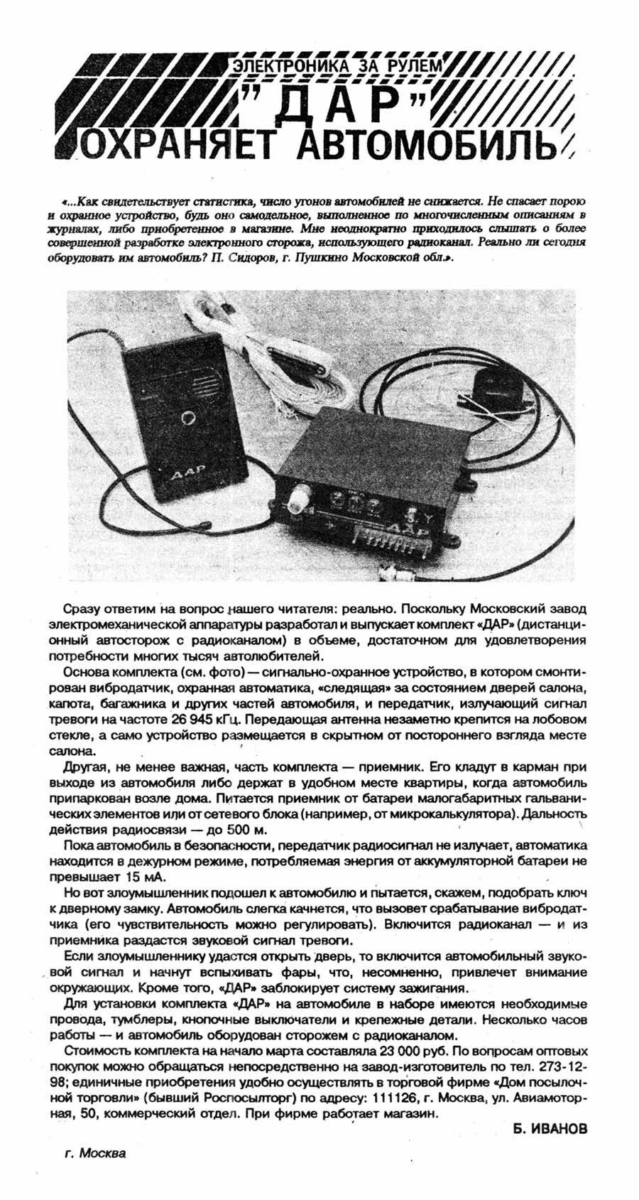 Дистанционный автосторож с радиоканалом *Дар* с 1992 года выпускал Московский завод электромеханической аппаратуры. Подробнее см. ниже.