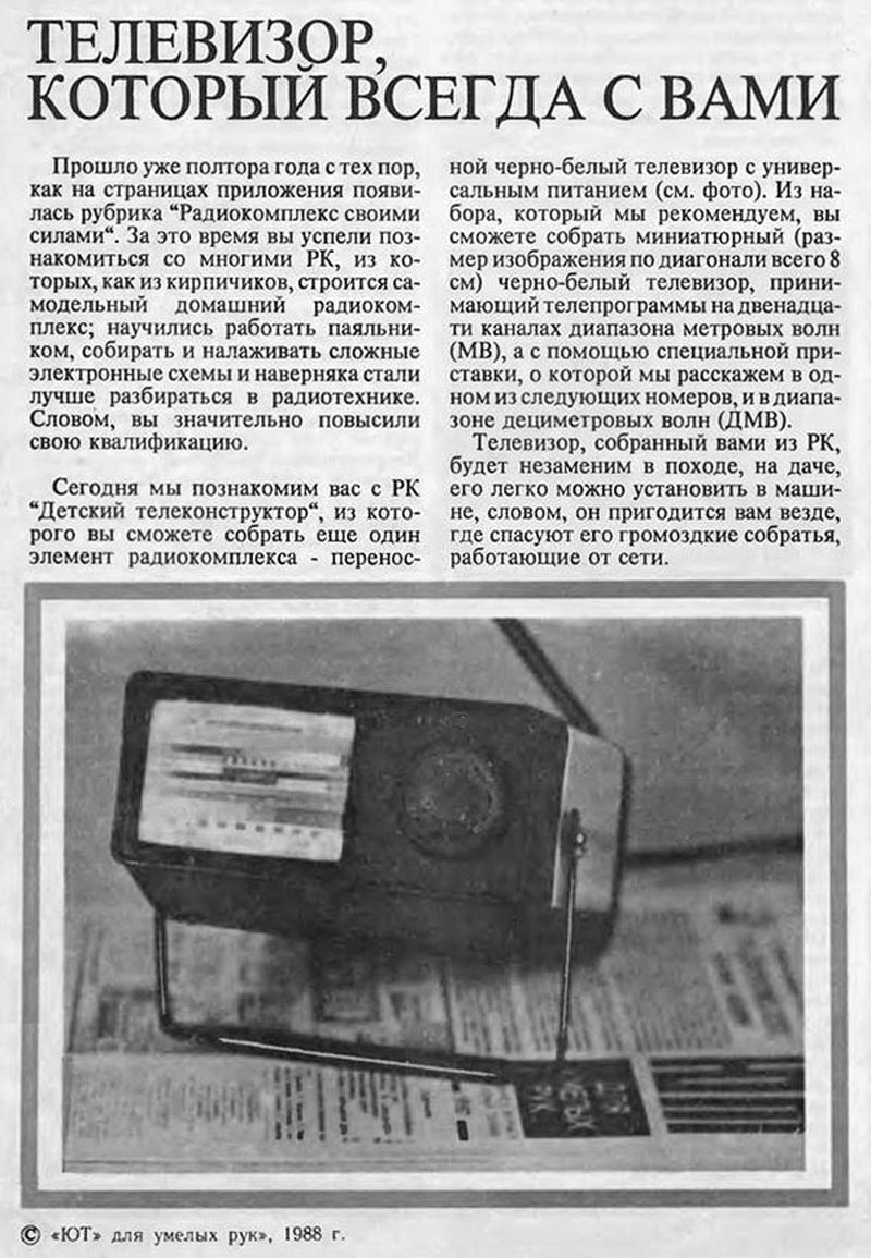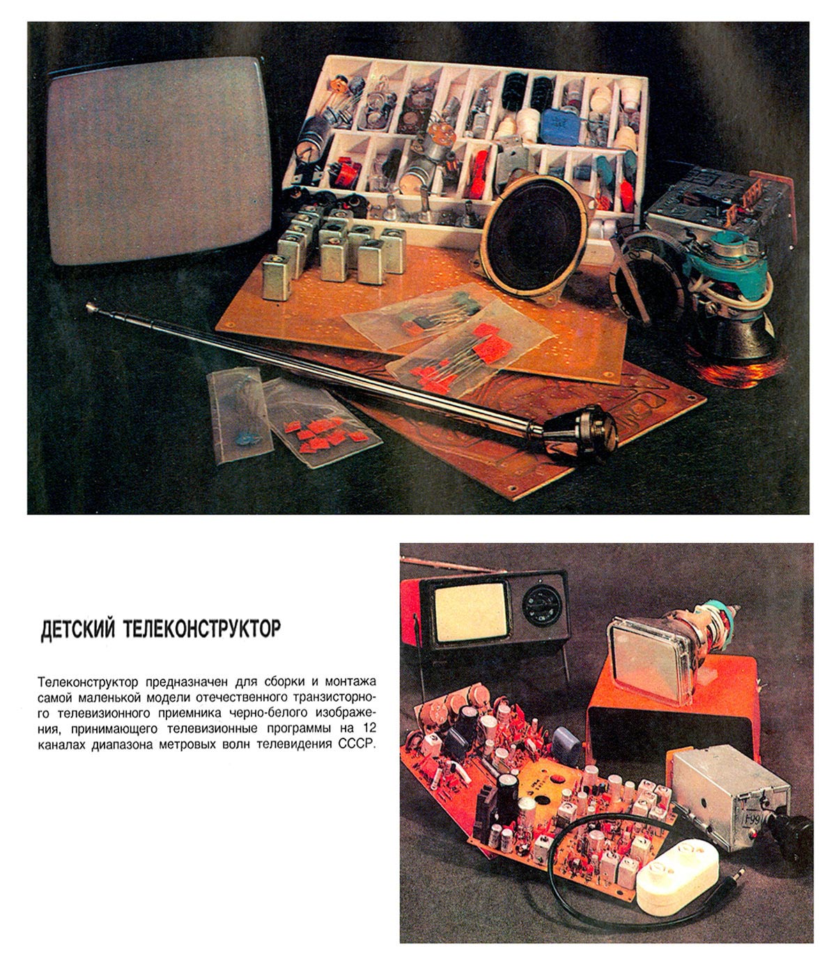 Телевизионный приёмник *Детский телеконструктор* с 1981 года выпускал Ленинградский завод *Магнетон*. Модель выпускалась в 3-х вариантах: полностью собранной и настроенной ценой 102 руб. 50 коп.; с собранными и настроенными платами ценой 100 рублей и в виде набора деталей, узлов и компонентов из которых можно было собрать телевизор, работающий в диапазоне МВ. Чувствительность 20 мкВ. Номинальная выходная мощность 100 мВт. Питание от сети выносным БП или от аккумулятора. Потребляемая мощность 10 и 4 Вт соответственно. Габариты телевизора 130х75х200 мм. Масса 1,5 кг. С 1987 года в телеконструкторе ПТК заменён на электронный с диапазонами 1-5 и 6-12 каналы. Телеконструкторы выпускались с наименованиями *Юному радиолюбителю* и *Модель телеприёмника*, партия телеконструкторов именовалась как *Электроника*.