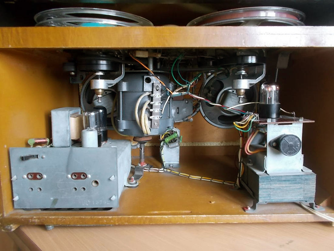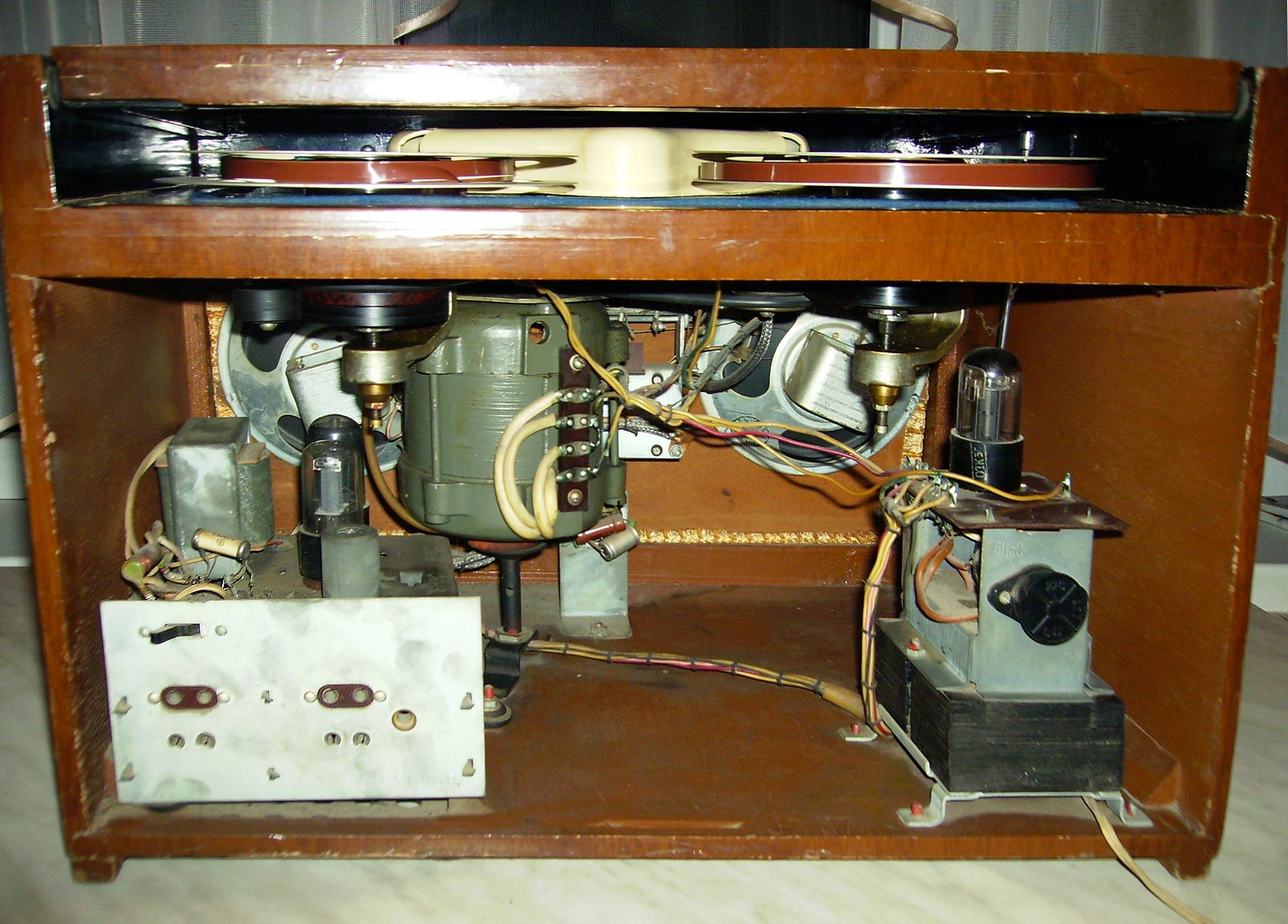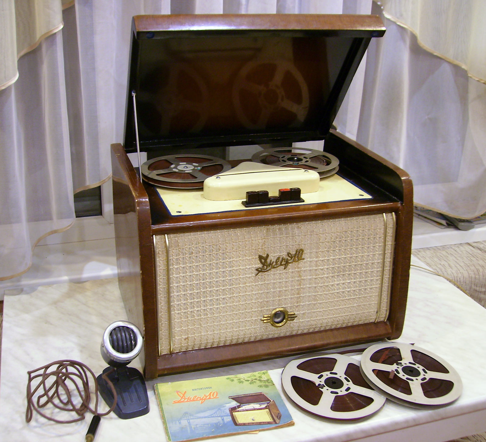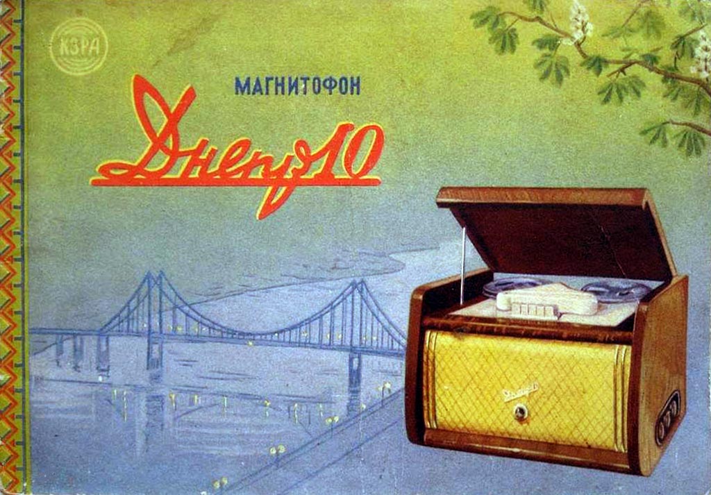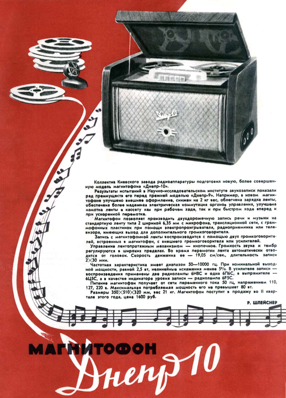 Настольный магнитофон *Днепр-10* с 1958 года выпускал Киевский завод радиоаппаратуры. Магнитофон создан на базе предыдущей модели **Днепр-9** и по конструкции и внешнему оформлению практически совпадает с ним. Магнитофон предназначен для записи и прослушивания двухдорожечных фонограмм на скорости протяжки магнитной ленты 19,05 см/сек. Ёмкость катушек с магнитной лентой типа 1 или СН - 350 метров. Время звучания или записи 30 минут на каждой дорожке. Магнитофон *Днепр-10* имеет ускоренную перемотку магнитной ленты в обе стороны. Диапазон записываемых и воспроизводимых звуковых частот на указанных типах лент 50...10000 Гц. Коэффициент нелинейных искажений на выходе громкоговорителей 5%. Номинальная выходная мощность 2,5, максимальная 6 Вт. Питание от сети 127/220 В. Потребляемая мощность 100 Вт. Габариты магнитофона 510х350х320 мм. Масса 28 кг.