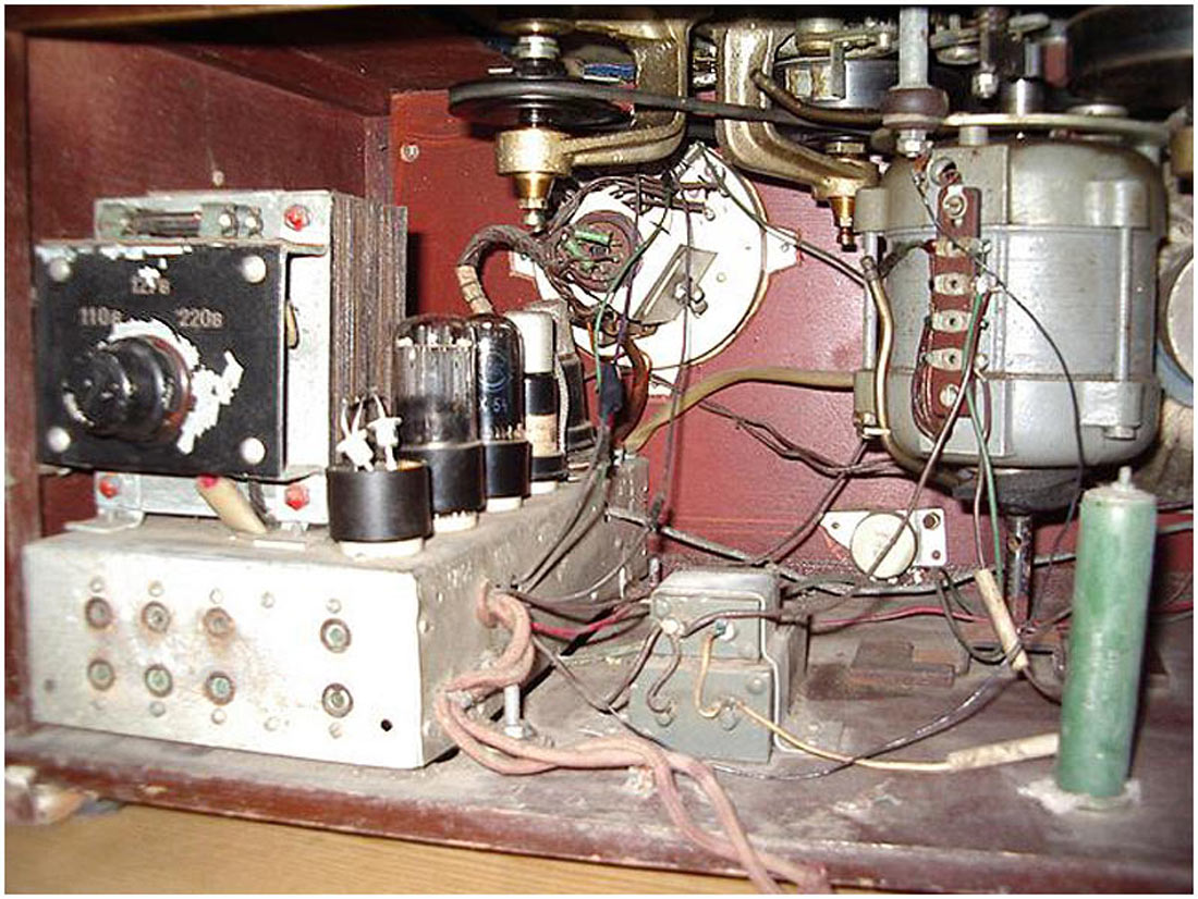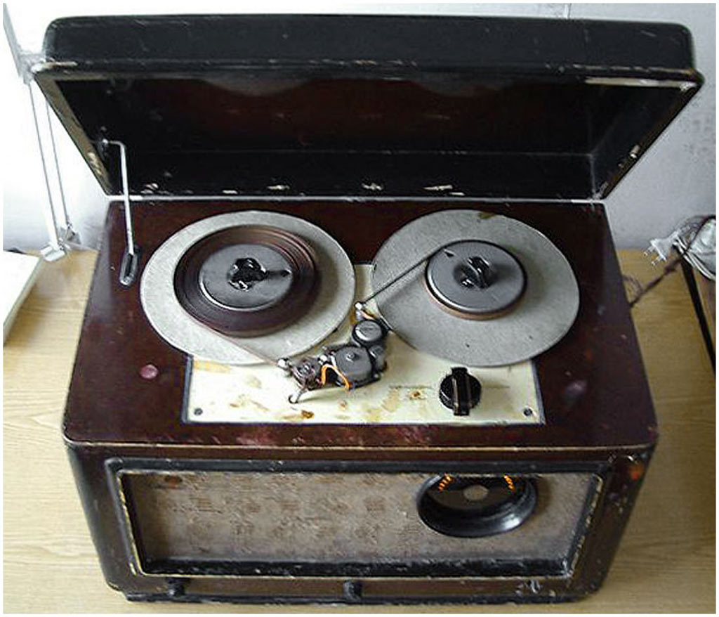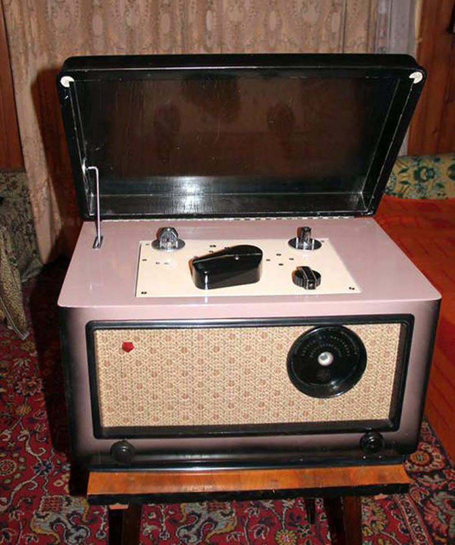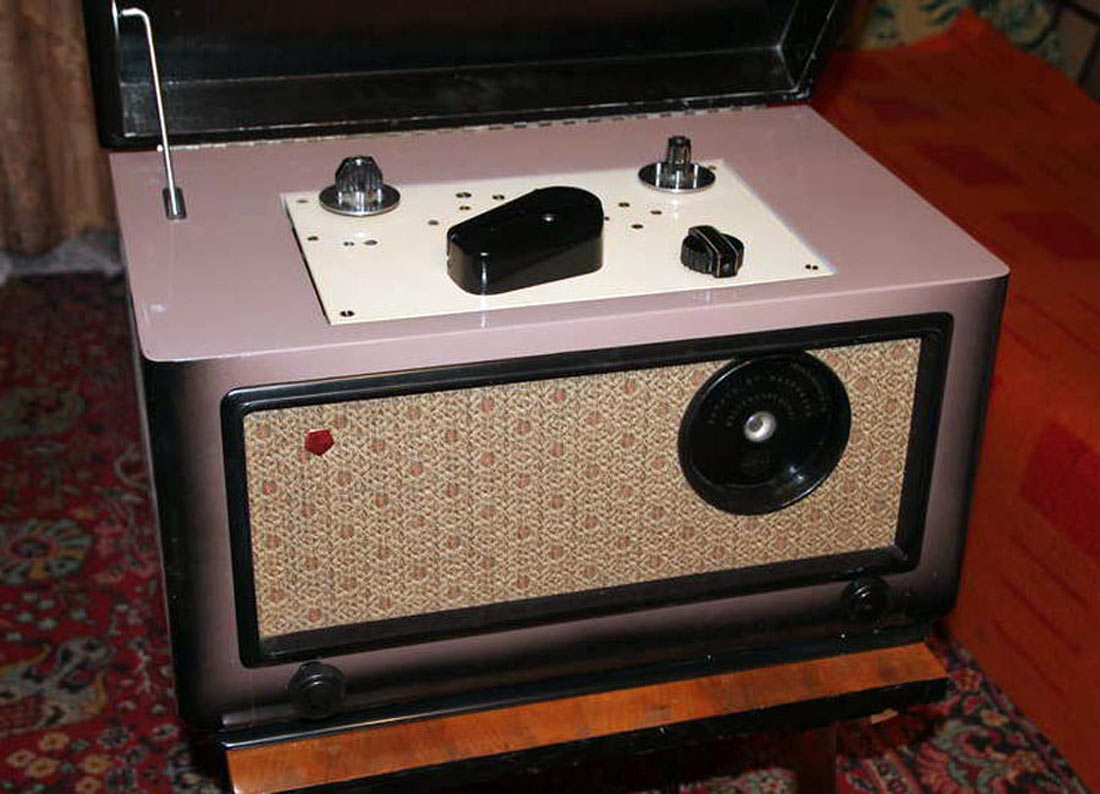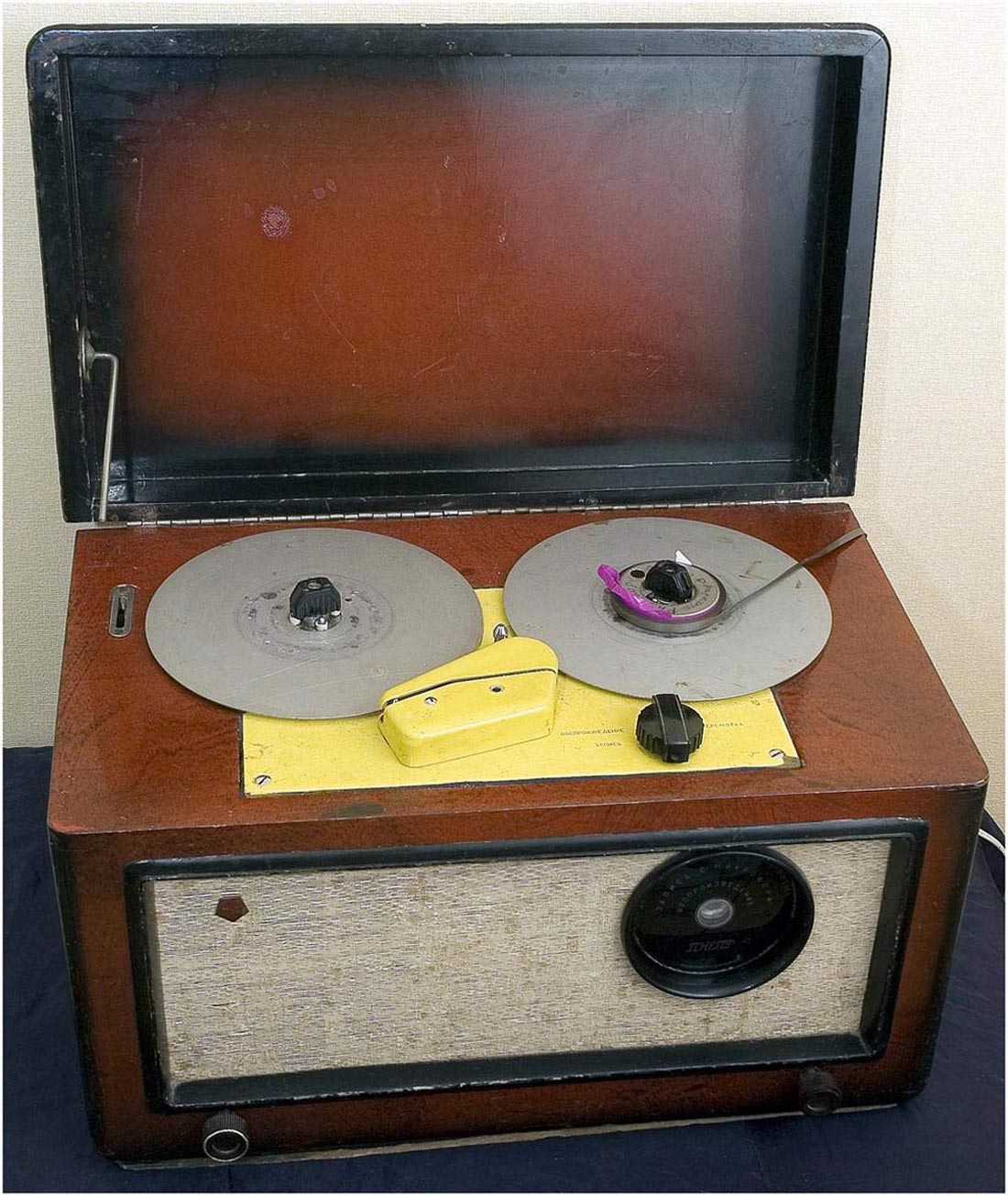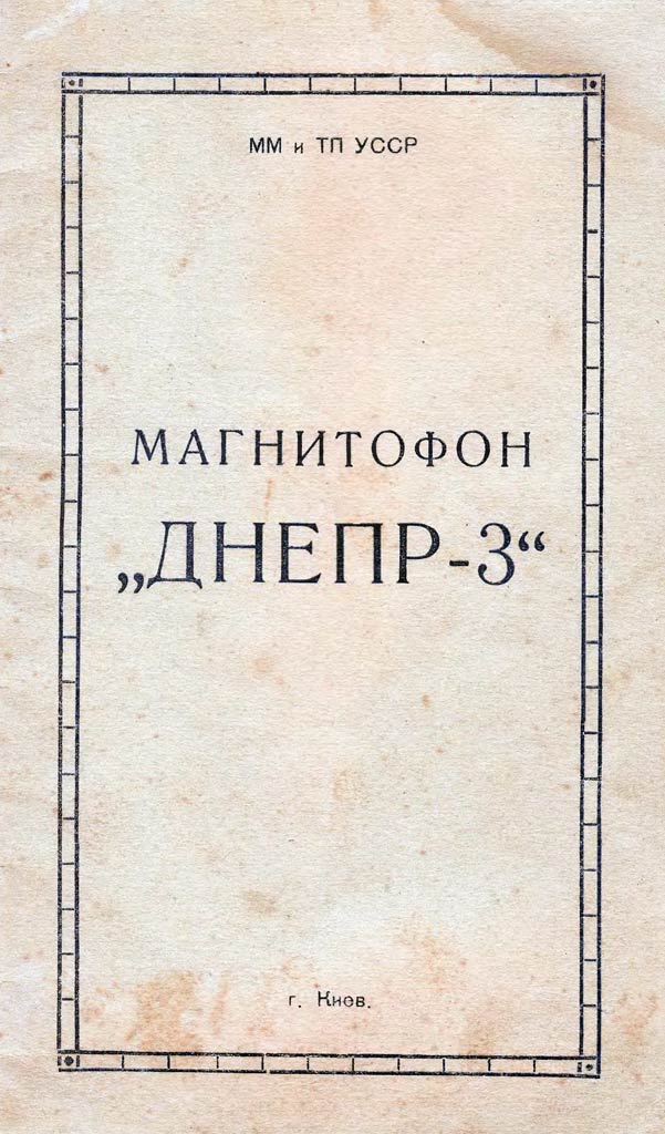 Сетевой катушечный ламповый магнитофон *Днепр-3* с 1952 года выпускал Киевский музкомбинат. Он предназначен для однодорожечной записи или воспроизведения звуковых фонограмм на ферромагнитной ленте. Запись производится с радиотрансляционной проводной сети, микрофона или звукоснимателя. В магнитофоне имеется ускоренная перемотка ленты в одном направлении. Скорость движения ленты 19,05 см/сек. Время записи, при ёмкости катушек 500 метров 44 минуты. Выходная номинальная мощность 3 Вт. Чувствительность с микрофона 2 мВ, 200 мВ от звукоснимателя и 30 В от радиолинии. Диапазон частот записи 100...5000 Гц. Относительный уровень шумов и помех -35 дБ. КНИ 5%. Питание аппарата осуществляется от электросети 110, 127 или 220 В. Размер аппарата 518х315х330 мм. Вес 28 кг. Магнитофон собран в декоративно оформленном под ценные породы деревянном ящике, с поднимающейся крышкой, под которой находится панель с ЛПМ. На панели расположены подкатушники, ручка управления родом работы, блок головок, закрытый съёмной крышкой. Блок состоит из универсальной и стирающей головок, прижимного ролика, направляющих стоек и ведущего вала. На передней панели находятся регулятор уровня записи, громкости и шкала с подсветкой, указывающая род работ. Громкоговоритель укреплен на передней панели слева и закрыт радиотканью. На задней стенке аппарата расположены разьёмы микрофона, звукоснимателя, радиолинии и головных телефонов, а так же колодка переключения напряжения сети и сетевой шнур. Футляр сзади закрывается картонной крышкой с отверстиями.