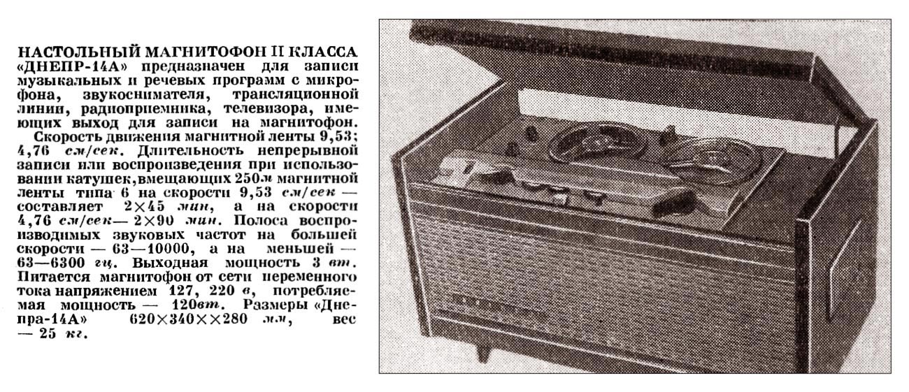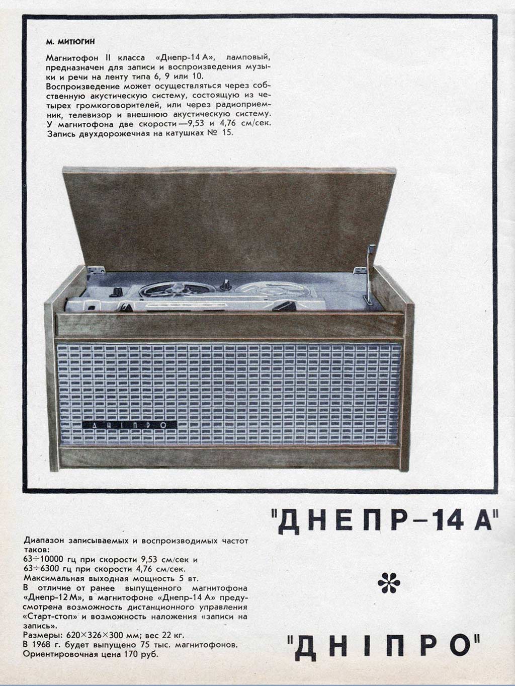Магнитофон *Днiпро-14А* с осени 1968 года установочной партией около 200 экземпляров выпущен Киевским заводом *Маяк*. Планировали выпустить 75 тысяч магнитофонов, но по разного рода причинам этого не случилось. С 1969 года начался уже массовый выпуск магнитофона. Магнитофон *Днiпро-14А* рассчитан на двухдорожечную запись с микрофона, звукоснимателя, радиоприёмника, телевизора, другого магнитофона или радиолинии. Скорость движения магнитной ленты 9,53 см/сек и 4,76 см/сек при девиации 0,3 % и 0,4% соответственно. Длительность записи с катушками № 15 вмещающих 250 метров магнитной ленты типа 6 на большей скорости 2 х 44 минуты, на меньшей 2 х 88 минут. Номинальная выходная мощность около 3 Вт, максимальная более 6 Вт. Диапазон звуковых частот воспроизводимых громкоговорителями на большей скорости - 63...10000 Гц, на меньшей - 63...6300 Гц. Напряжение на линейном выходе 0,25 В. Имеется раздельная регулировка тембров НЧ и ВЧ. В магнитофоне имеется шкала расхода ленты, кнопка наложения записи, дистанционный пуск ЛПМ, переключатель сигналов при записи, кнопка паузы. В ЛПМ стоит три двигателя. Схема выполнена на семи радиолампах, включая оптический индикатор. В АС установлено два громкоговорителя типа 2-ГД-19 спереди и два типа 1ГД-19 по бокам. Питание от электрической сети 127 или 220 В. Габариты модели 620х320х305 мм. Вес 25 кг.