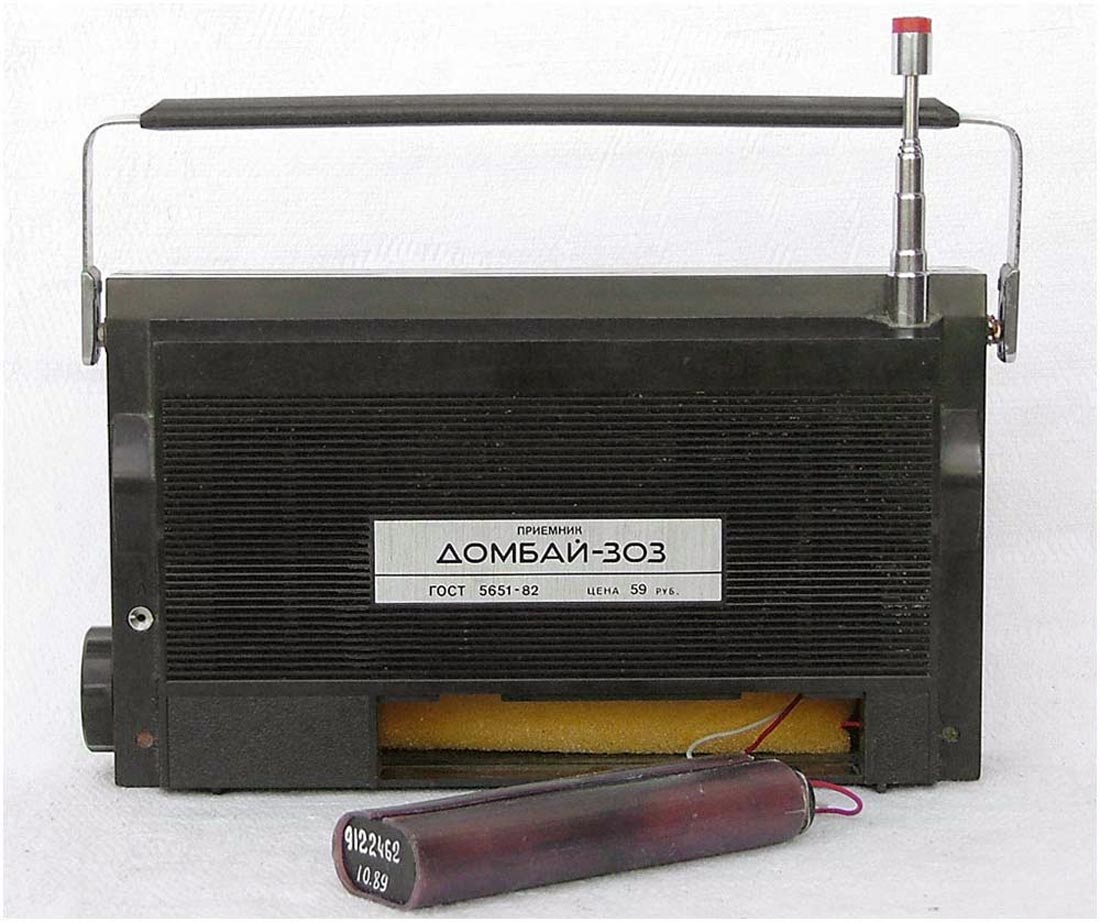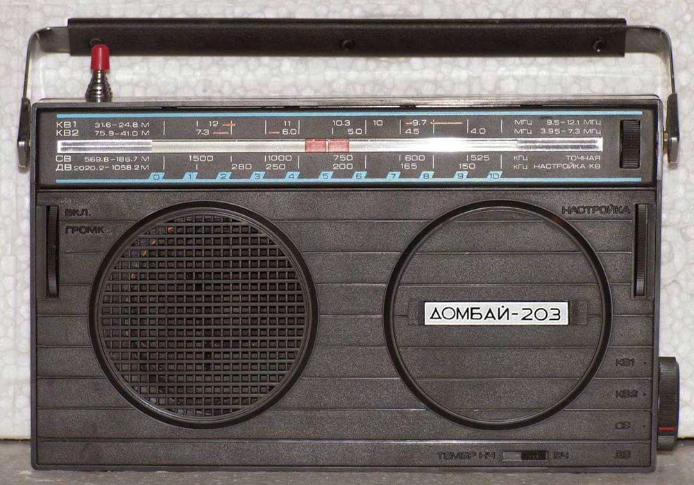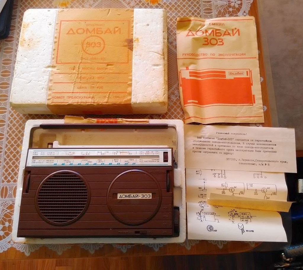 Портативный радиоприёмник *Домбай-303* с 1982 года выпускал Черкесский радиозавод *Полет*. Приёмник выпускался на основе модели **Россия-303**. Первые приёмники не отличались от базового, затем было изменено их оформление и применена более современная элементная база. Приёмник рассчитан на приём в диапазонах ДВ, СВ и двух поддиапазонах КВ. Имеется ступенчатая регулировка тембра ВЧ, точная подстройка частоты в поддиапазонах КВ. Работает приёмник на громкоговоритель 0,5ГД-30. Питание от четырёх элементов А-316. Чувствительность в диапазонах ДВ - 2,1мВ/м, СВ - 1,2 мВм, поддиапазонах КВ - 450 мкВ. Избирательность по соседнему каналу 36 дБ. Номинальная выходная мощность 0,2 Вт. Диапазон воспроизводимых частот 250...3550 Гц. Габариты приёмника 215х195х65 мм. Масса 1,5 кг. С 1985 года завод выпускал радиоприёмник **Домбай-303-1**. С 1986 года приёмник *Домбай-203* (*Домбай РП-203*), а с 1987 года *Домбай РП-203-1*. Новые модели не отличались друг от друга по конструкции и схеме, а вот оформление было самым разным, в том числе и в цветовой гамме. С 1986 года в наименовании радиоприёмников добавились буквы РП, *Домбай РП-203* и *Домбай РП-203-1*, что было связано с новым ГОСТом. Статья на сайте Li-ne.ru Домбай РП-203Россия-303 (выпуска 1974г)Россия-303 (выпуска 1985г)Россия-303 (выпуска 1987г)