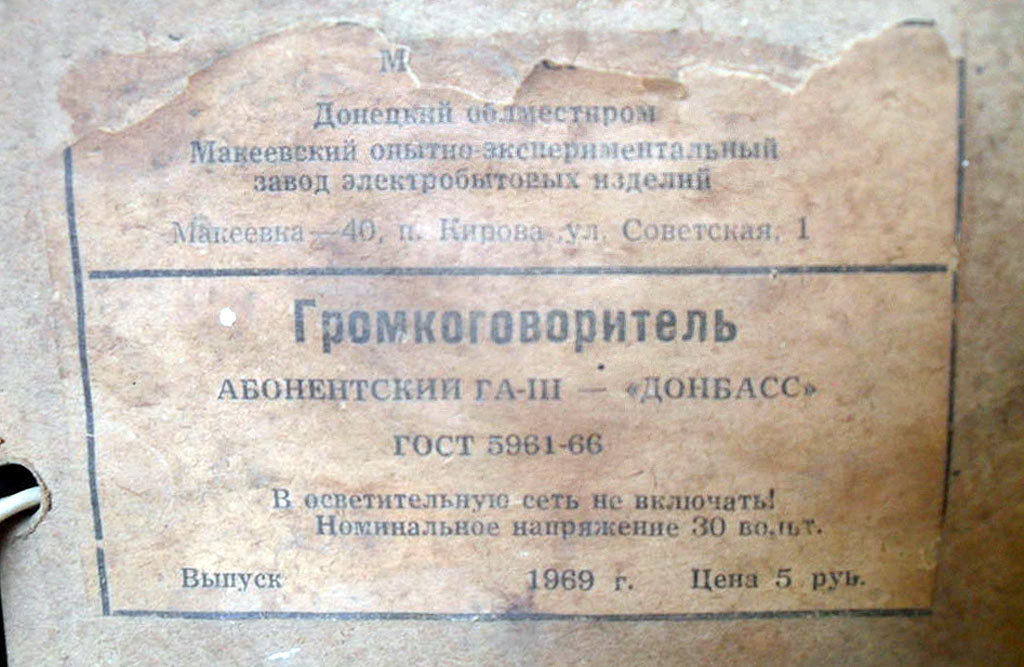 Абонентский громкоговоритель "Донбасс" предположительно с 1969 года выпускал Макеевский завод электробытовых изделий "Импульс" и ещё один неустановленный завод. Громкоговоритель предназначен для воспроизведения радиопрограммы проводного трансляционного вещания, с напряжением в линии 30 В. Диапазон воспроизводимых частот звука - 160..5000 Гц. Габариты громкоговорителя 260х150х74 мм. Масса 1,1 кг.