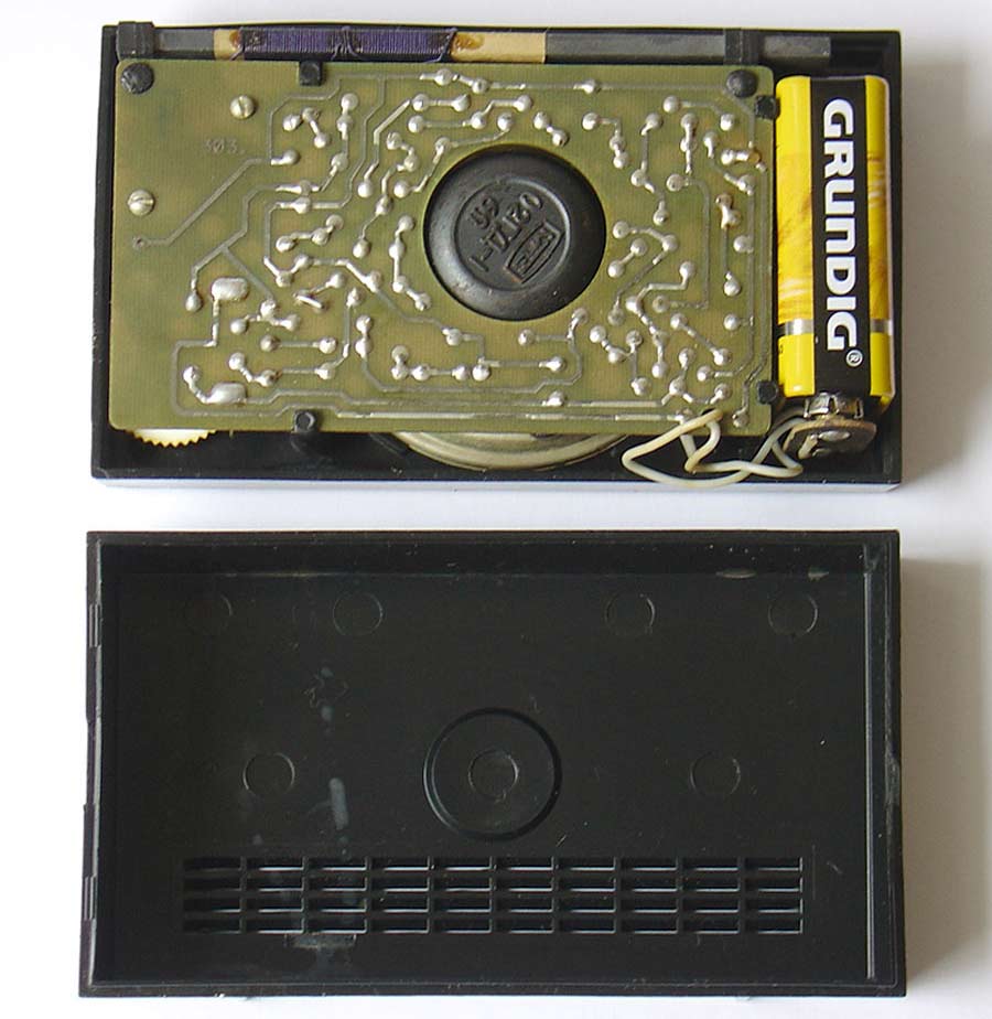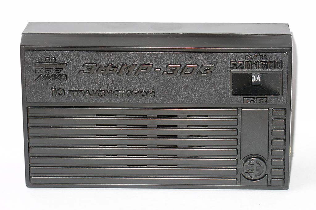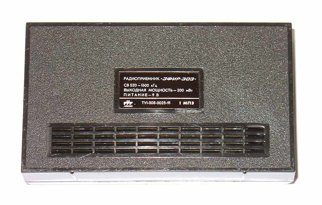 Радиоприёмник *Эфир-303* из радиоконструктора с начала 1991 года выпускал Первый Московский приборостроительный завод. Детский радиоприёмник игрушка **Эфир-303** предназначен для начинающих радиолюбителей и детей в возрасте от 10 лет. Приёмник представляет собой набор радиодеталей и компонентов для сборки действующего радиоприёмника прямого усиления. Цена набора РК 11 рублей. Завод выпускал и собранный радиоприёмник (на фото). Его цена 13 рублей. По конструкциии построению электрической схемы и техническим параметрам приёмник схож с другими моделями этого же завода серии **Юность КП**, но электрическая схема не совпадает ни с одной.