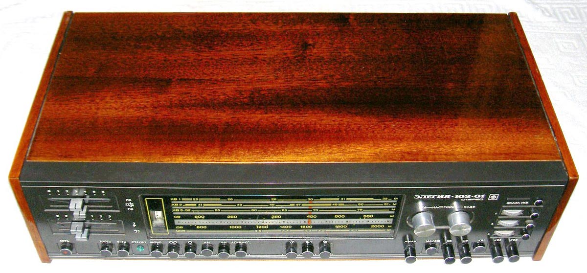 Стационарная транзисторная радиола *Элегия-102-01-стерео* с 1984 года выпускалась Муромским заводом РИП. Радиола **Элегия-102-01-стерео** является модернизацией предыдущей модели этого же завода **Элегия-102-стерео**. Все изменения коснулись в основном лишь внешнего оформления радиолы. Радиола состоит из 4-х отдельных блоков: радиоприёмника, проигрывателя и двух АС. Блоки радиолы можно расположить в наиболее удобном сочетании. Радиоприёмник работает в диапазонах: ДВ, СВ, КВ и УКВ. В УКВ диапазоне можно принимать и стереопрограммы. Имеется фиксированная настройка на три радиостанции в УКВ-ЧМ диапазоне. 3-х скоростное ЭПУ способно воспроизводить моно и стереопластинки. Имеется возможность для подключения магнитофона и стереотелефонов. Чувствительность в диапазонах: АМ - 150 мкВ, ЧМ - 5 мкВ. Номинальная выходная мощность - 2х6 Вт. Максимальная - 2х20 Вт. Питание осуществляется от сети переменного тока 50 Гц, 220 или 127 вольт. Потребляемая мощность при приёме - 45 Вт, при работе ЭПУ - 55 Вт. Полоса звуковых частот в АМ диапазонах - 63...4000 Гц, ЧМ 63...12500 Гц. Габариты приёмника 624х318х171 мм, ЭПУ 316х409х170 мм. Общий вес 30 кг.
