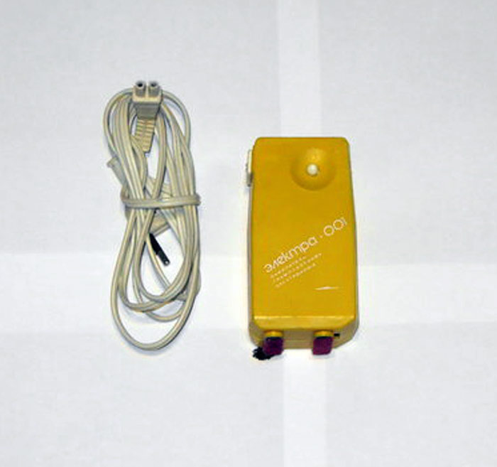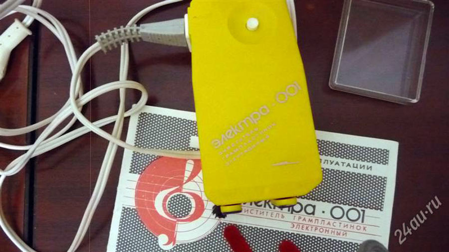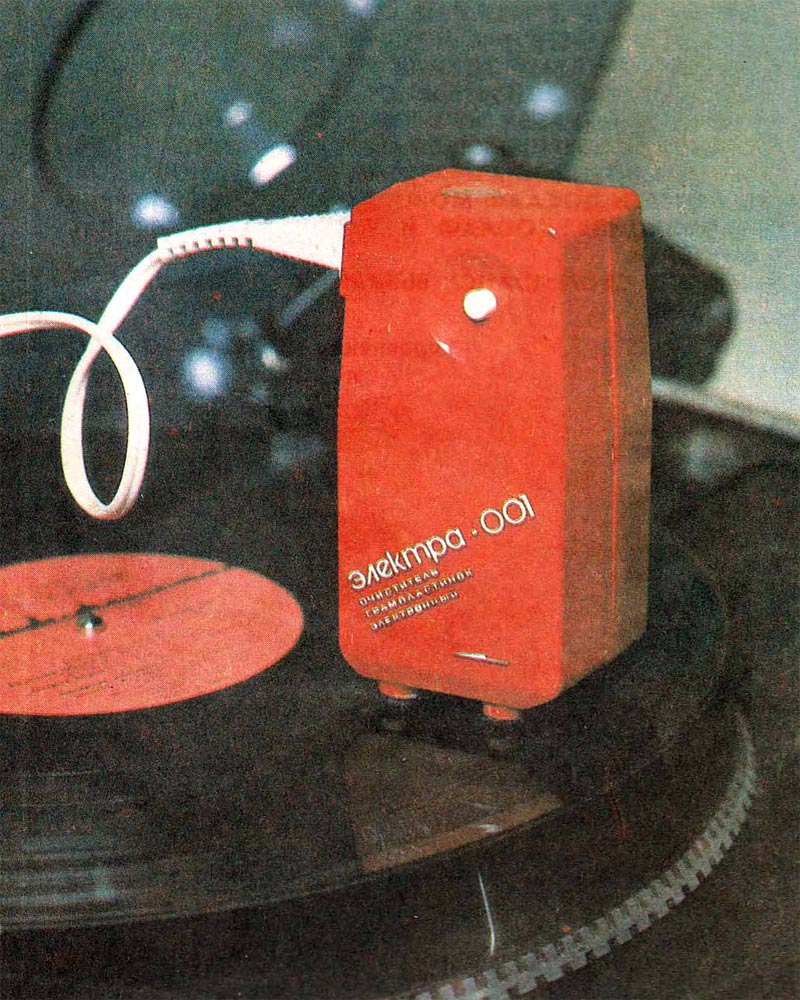 Электронный очиститель грампластинок *Электра-001* выпускался с 1990 года Рязанским радиозаводом. Прибор предназначен для работы с электропроигрывающими устройствами. С его помощью можно удалить пыль и снять статический заряд электричества с грампластинок. Питается прибор от сети напряжением 220 В. Потребляемая им мощность не превышает 0,5 Вт. Время очистки одной стороны пластинки не более 20 секунд. Габариты очистителя - 110х60х45 мм. Масса - 0,25 кг. Цена 11 рублей.