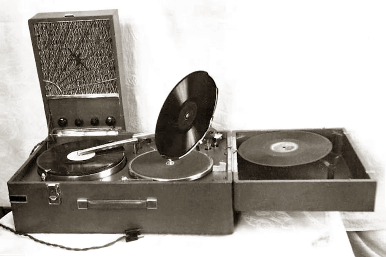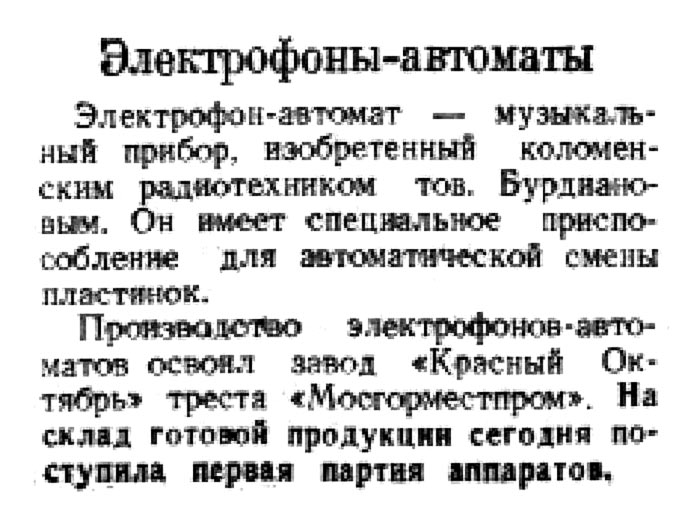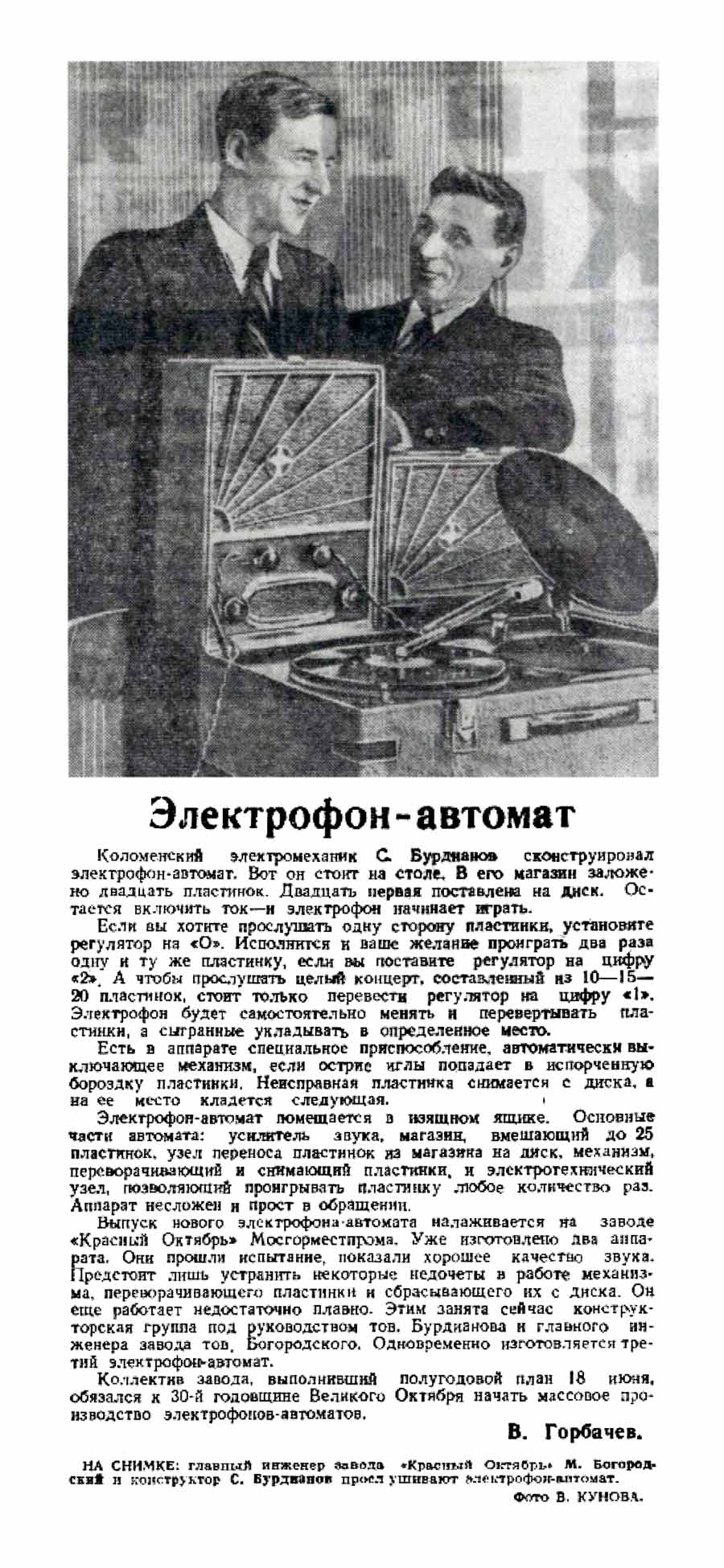 Электрофон - автомат с 1948 года выпускался на Московским радиозаводом *Красный Октябрь*. Более подробно о модели в вырезках из газеты.
