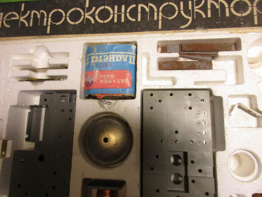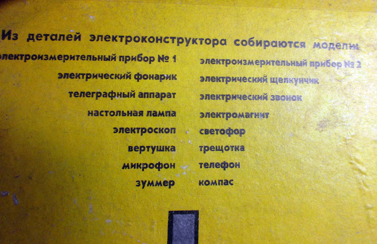 *Электроконструктор* выпускался предположительно с 1978 года. Из деталей конструктора собирались 16 действующих электрических моделей, таких как; электрический фонарь, настольная лампа, светофор, компас, электроскоп, электромагнит, электроизмерительный прибор №1 и №2, телеграфный аппарат, электрический щелкунчик, трещотка, зуммер, вертушка, телефон, микрофон, электрический звонок. ЭК выпускали в 2 вариантах оформления.