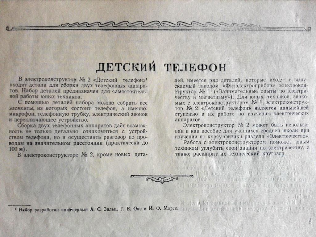 Электроконструктор №2 *Детский телефон* выпускался возможно с 1951 года Московским заводом *Физэлектроприбор*. Конструктор выпускался более 15 лет.