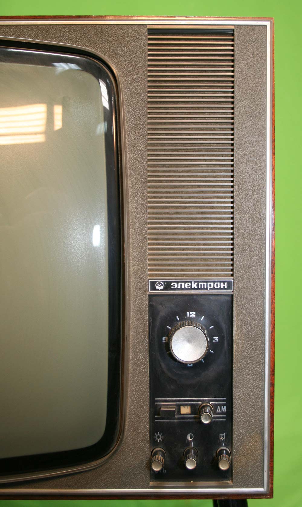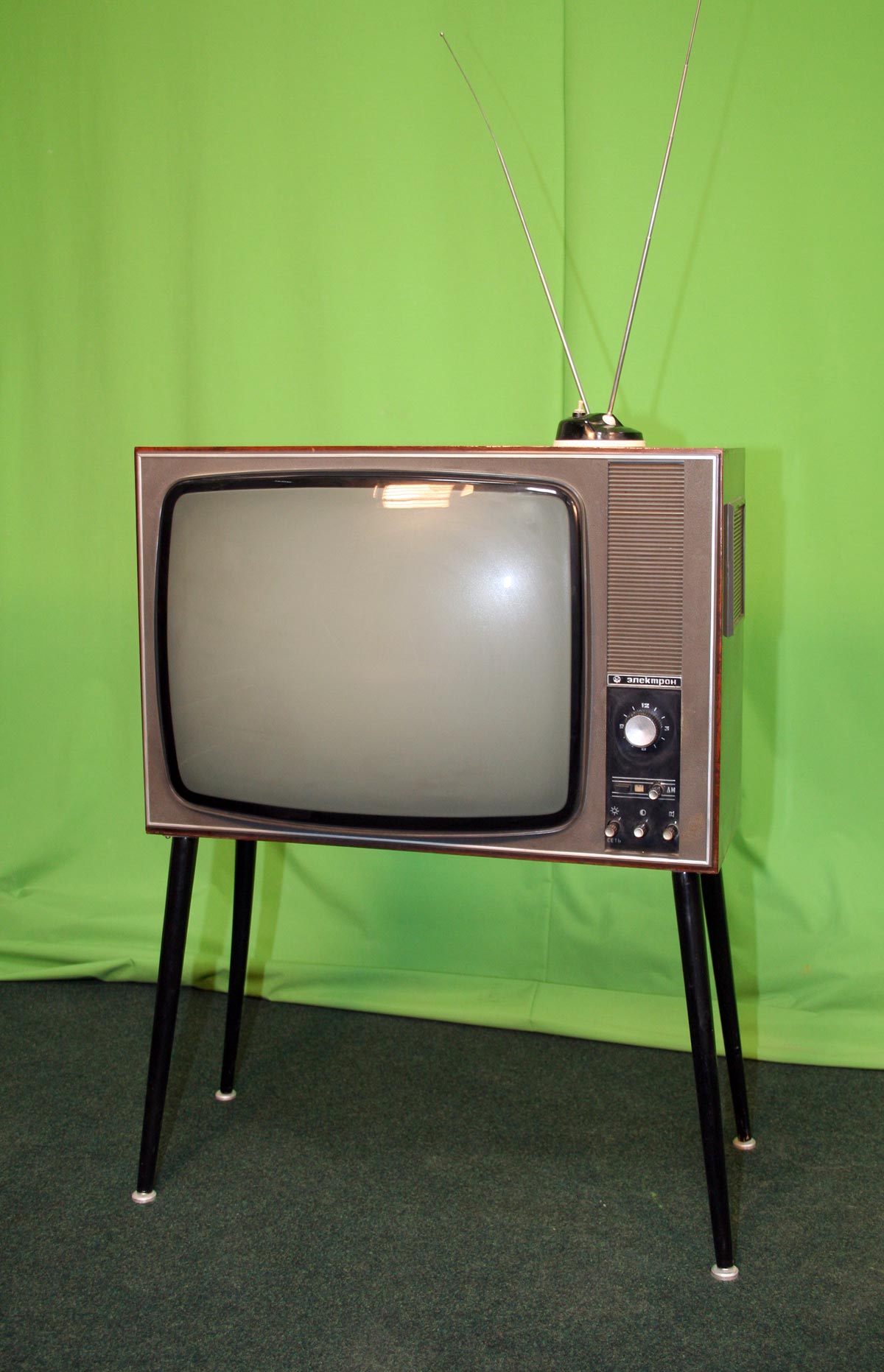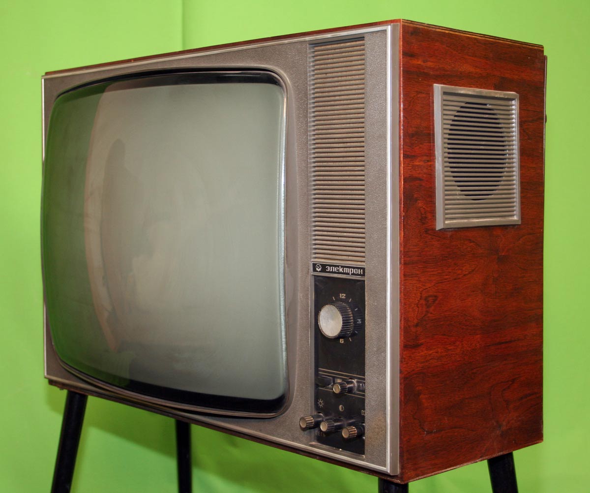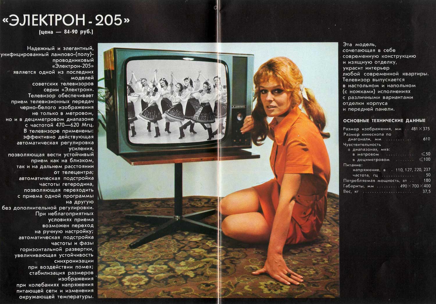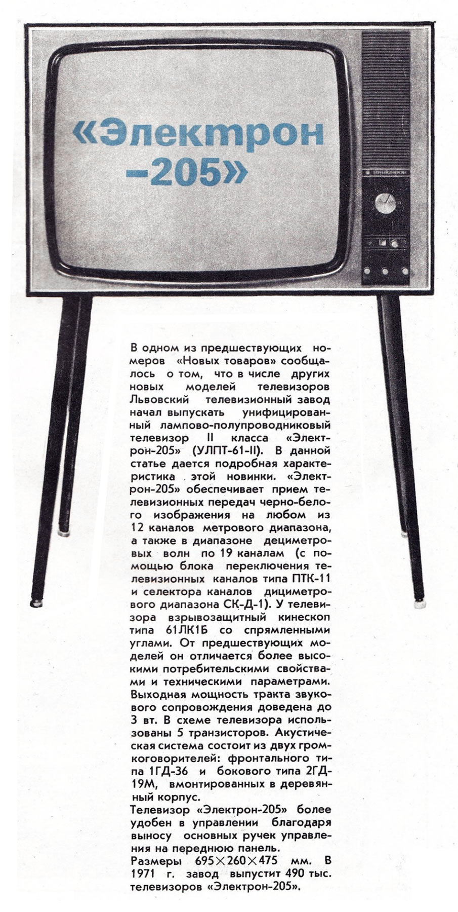 Телевизионный приёмник чёрно-белого изображения *Электрон-205/Д* с 1970 года выпускал Львовский телевизионный завод. Унифицированный телевизор 2 класса **Электрон-205/Д** (тип УЛПТ-61-II-12/11) предназначен для приёма программ телестудий, работающих на любом из 12-ти каналов метрового диапазона, телевизор с индексом **Д** и на любом из 19-ти каналов дециметрового диапазона. В телевизоре применён кинескоп 61ЛК1Б со спрямленными углами. Размер видимого изображения 481х375 мм. Чувствительность модели в диапазоне МВ - 50 мкВ, в ДМВ - 100 мкВ. АС телевизора состоит из двух громкоговорителей, фронтального 1ГД-36 и бокового 2ГД-19М. Номинальная выходная мощность канала звукового сопровождения 1,5 Вт, максимальная 3 Вт. Диапазон звуковых частот - 100...10000 Гц. Питание от сети 110, 127, 220 В. Потребляемая мощность 180 Вт. Размеры телевизора 695х260х475 мм. Вес 37,5 кг. Цена 380 рублей.