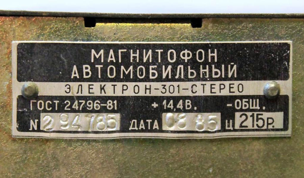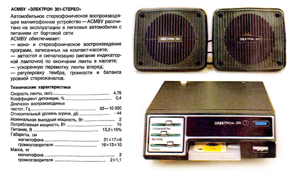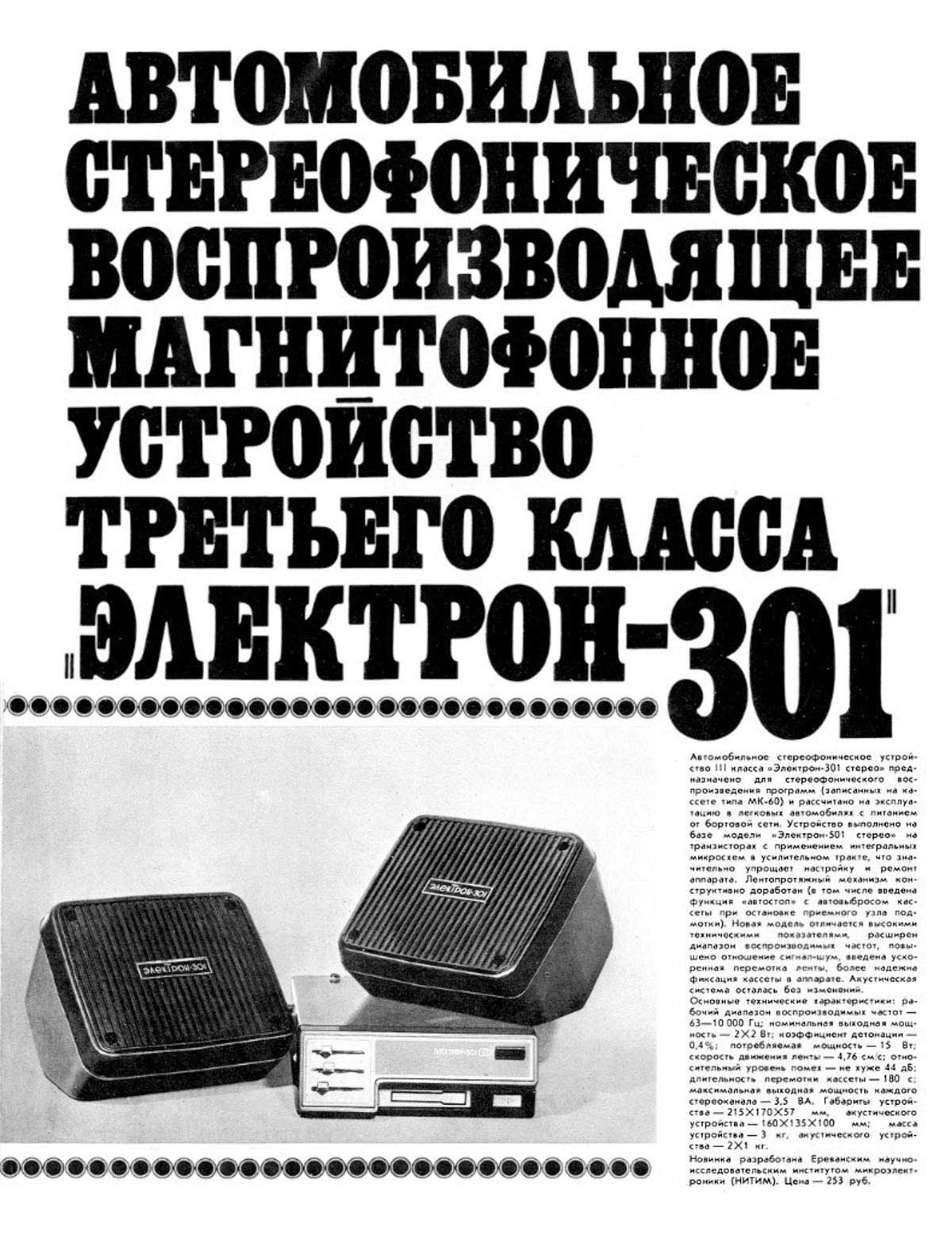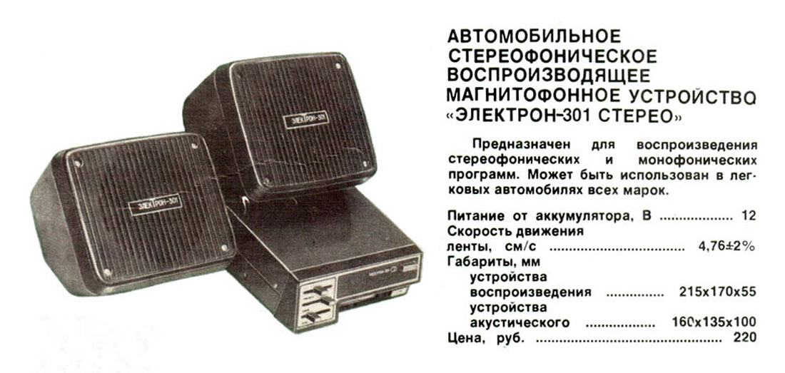 Автомобильное стереофоническое воспроизводящее магнитофонное устройство (АСВМУ) *Электрон-301-стерео* с 1980 года выпускал Завод НПО *Ани*, Ереван. АСВМУ рассчитано на эксплуатацию в легковых автомобилях. От выпрямителя с напряжением 13,2 вольт его можно использовать и в доме. Скорость магнитной ленты 4,76 см/сек. Коэффициент детонации ±0,35%. Рабочий диапазон частот звука 63...10000 Гц. Номинальная выходная мощность 2х2 Вт, потребляемая 16 Вт. Относительный уровень шумов -46 дБ. Размеры устройства 205x172x58 мм. Размеры одной акустической системы 166x125x101 мм. Вес устройства 2 кг. Одной АС - 1,5 кг. Цена АСВМУ 215 рублей.