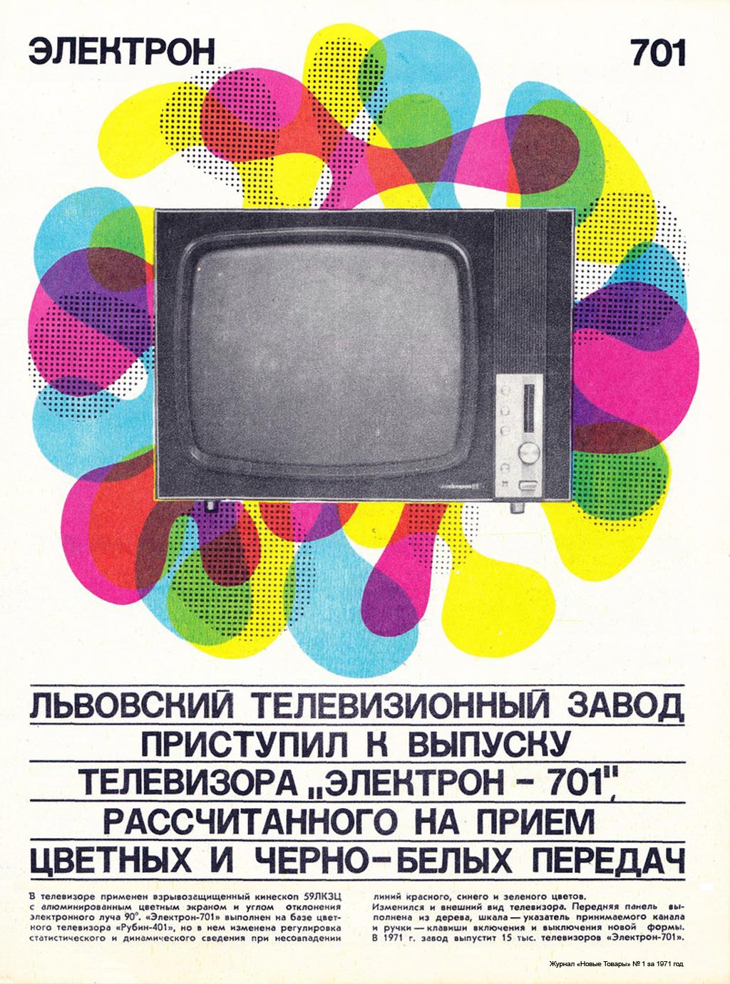 Цветной телевизор *Электрон-701* с 1970 года выпускал Львовский телевизионный завод. *Электрон-701* - это лампово-полупроводниковый телевизор 2-го класса (ЛППЦТ-59-II) с диагональю экрана 59 см. Он рассчитан на приём ч/б и цветных программ в любом из 12 телевизионных каналов. Приём в цвете осуществляется по стандартной системе цветного телевидения СЕКАМ. Телевизор *Электрон-701* создан на базе модели *Рубин 401-1*, поэтому почти все характеристики телевизоров схожи. Отличаются они внешним оформлением и размерами футляра. Телевизор *Электрон-701* выпускался в настольном варианте в футляре облицованном ценными породами. Оправа экрана и декоративные решетки выполнены из пластмасс. Питание осуществляется от сети переменного тока. В телевизоре используется цветной масочный кинескоп 59ЛКЗЦ, 21 радиолампа, 15 транзисторов и 56 диодов. Переключение каналов фиксированное, с помощью барабанного переключателя, входящего в блок ПТК-11ДС. Чувствительность телевизора - 50 мкВ. Чёткость изображения по вертикали и горизонтали - 450 строк. Номинальная выходная мощность 1,5 Вт. Потребляемая мощность 350 Вт. В телевизоре имеются системы АРУ, АПЧГ, АПЧ и Ф, автоматическое включение и выключение блока цветности, автоматическое размагничивание кинескопа, автоматическая стабилизация напряжения второго анода кинескопа и размеров изображения. Телевизор выполнен по функционально-блочному принципу. Монтаж блоков печатный. Все блоки и печатные платы собраны на вертикальном поворачивающемся шасси, что обеспечивает удобство при осмотре и ремонте. Габариты модели 553х553х753 мм. Масса 60 кг. Опытный в рекламе и реальный телевизоры отличались оформлением.