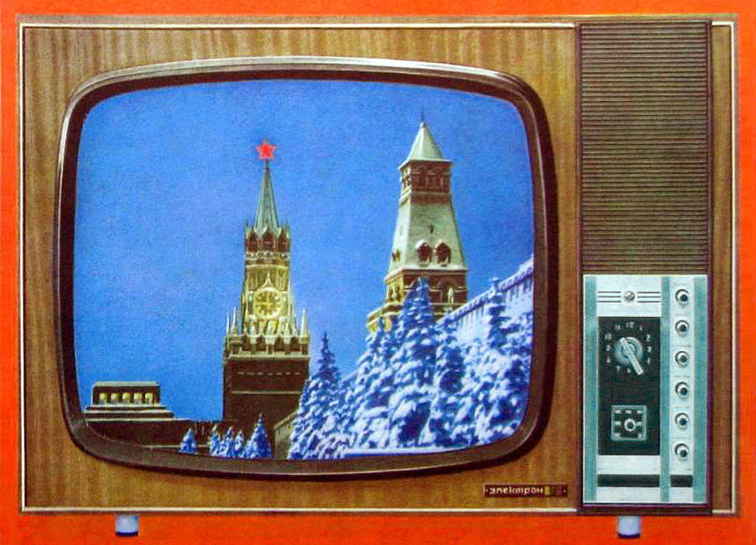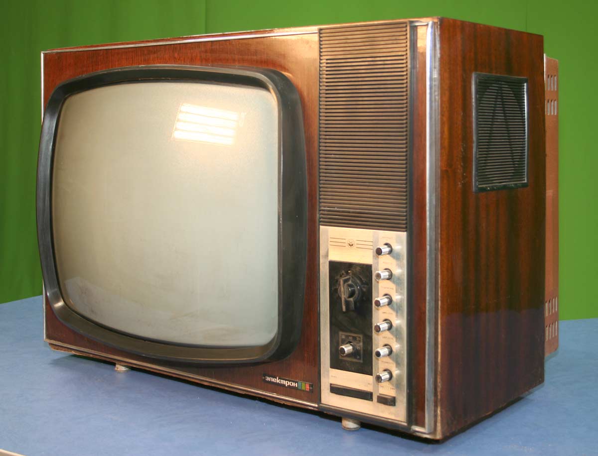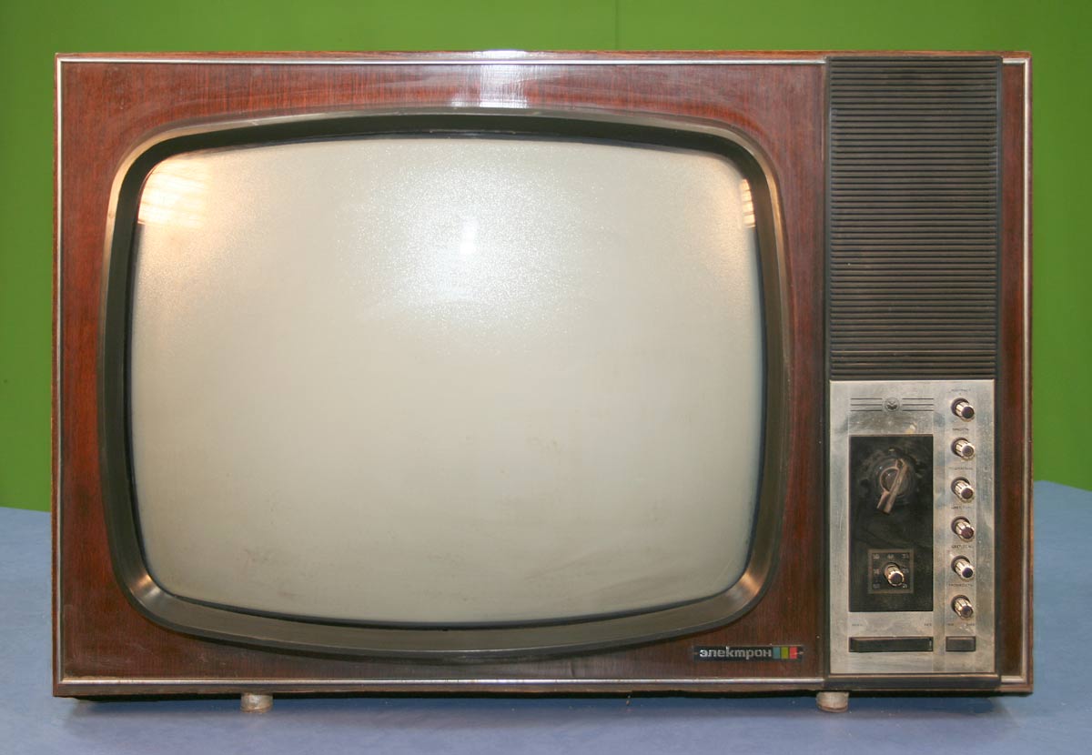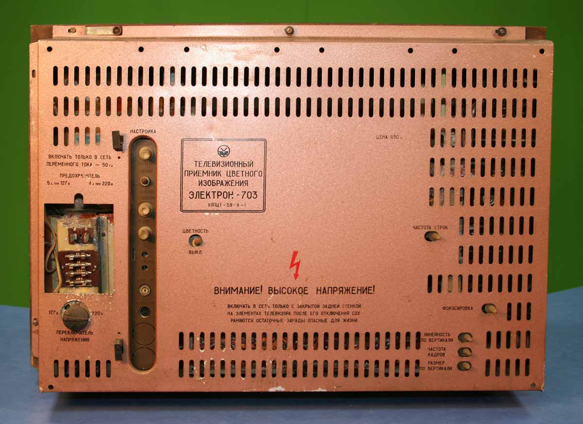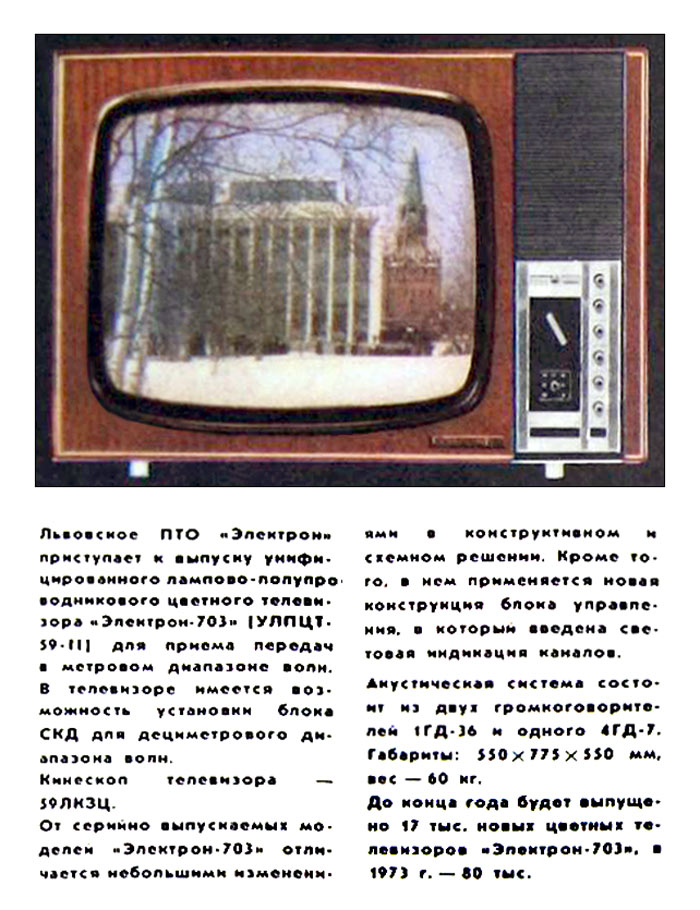 Унифицированный цветной телевизор *Электрон-703/Д* (тип УЛПЦТ-59-II-1) с 1972 года выпускал Львовский телевизионный завод. Телевизор работает в МВ и ДМВ диапазоне (после установки СКД-1), а в модели с индексом **Д** блок уже установлен. Высокая чувствительность с АРУ позволяет вести устойчивый приём на удалении от студии. Система АПЧГ исключает подстройки при переключении каналов. Для правильного воспроизведения цвета ручки насыщенности и контрастности сдвоены. Ручки под-насыщенности и цветового тона позволяют изменять цветовую насыщенность и окраску картинки. При приёме ч/б изображения автоматически отключаются режекторные фильтры. Уменьшение влияния помех достигается схемой АПЧ и Ф. В ТВ имеется автоматическое поддержание размеров изображения и напряжения на втором аноде кинескопа при небольших колебаниях напряжения в сети, а также автоматическое размагничивание кинескопа при включении. Применена подсветка номера канала шкалы ДМВ диапазона. Телевизор собран из законченных блоков, соединённых разъёмами. Есть гнёзда для подключения магнитофона на запись звука, прослушивание его на головные телефоны при отключенной АС и возможность установки проводного ПДУ. Габариты аппарата 775х550х550 мм. Вес 65 кг. Выпускался телевизор в настольном исполнении в деревянном футляре, облицованном ценными породами дерева.
