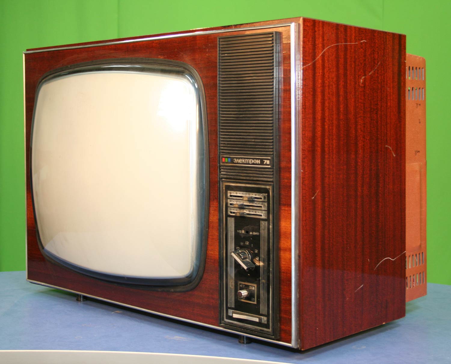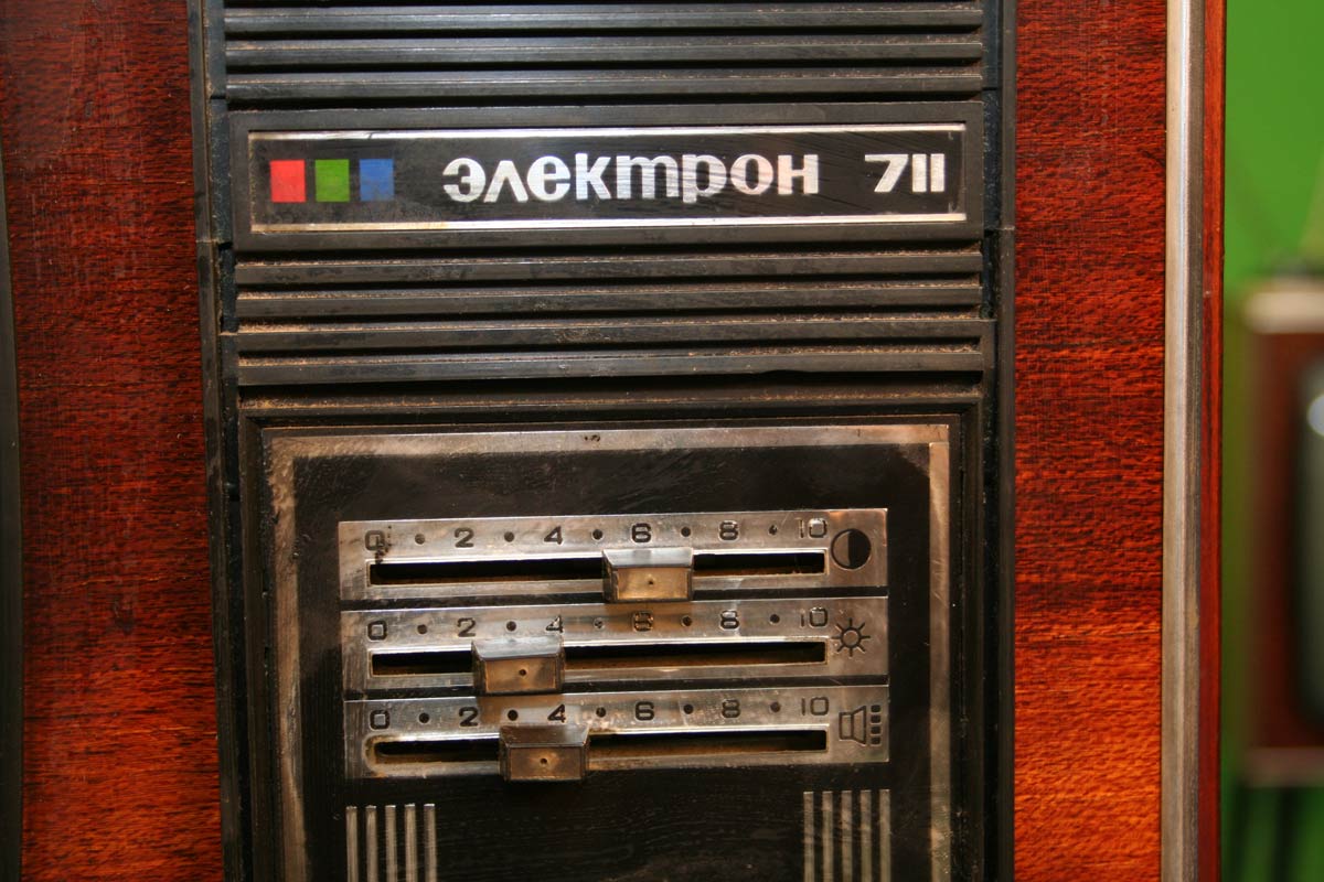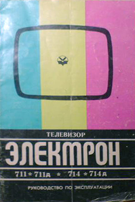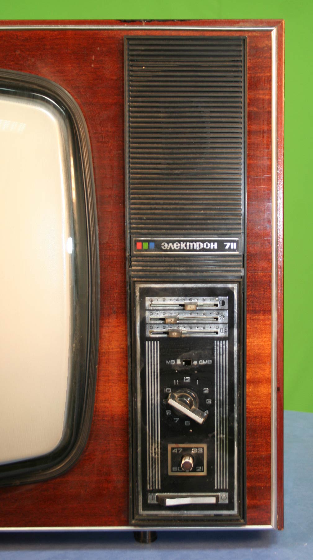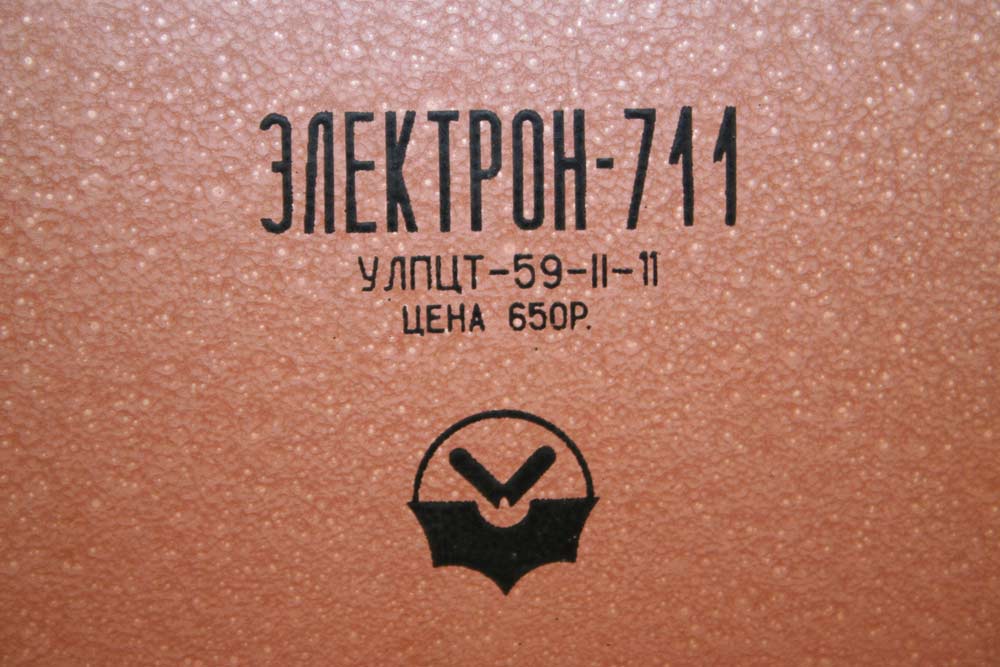 Телевизионный приёмник цветного изображения *Электрон-711/Д* с начала 1975 года выпускало Львовское ПО *Электрон*. Унифицированный стационарный лампово-полупроводниковый цветной телевизор 2 класса **Электрон-711** (УЛПЦТ-59-II-11/10) на кинескопе 59ЛКЗЦ с размером изображения 475x375 мм, предназначен для приёма телевизионных программ в цветном и чёрно-белом изображении. В телевизоре имеется возможность установки блока СКД для приёма в диапазоне ДМВ, а в телевизоре с индексом *Д* блок СКД уже установлен. Чувствительность телевизора в МВ диапазоне - 50 мкВ. Номинальная выходная мощность усилителя - 1,5 Вт. Диапазон воспроизводимых частот - 80...12500 Гц. Потребляемая мощность 260 Вт. Вес ТВ 57 кг, габариты - 535 х 550 х 790 мм. Цена 650 рублей. Корпус облицован ценными породами дерева.