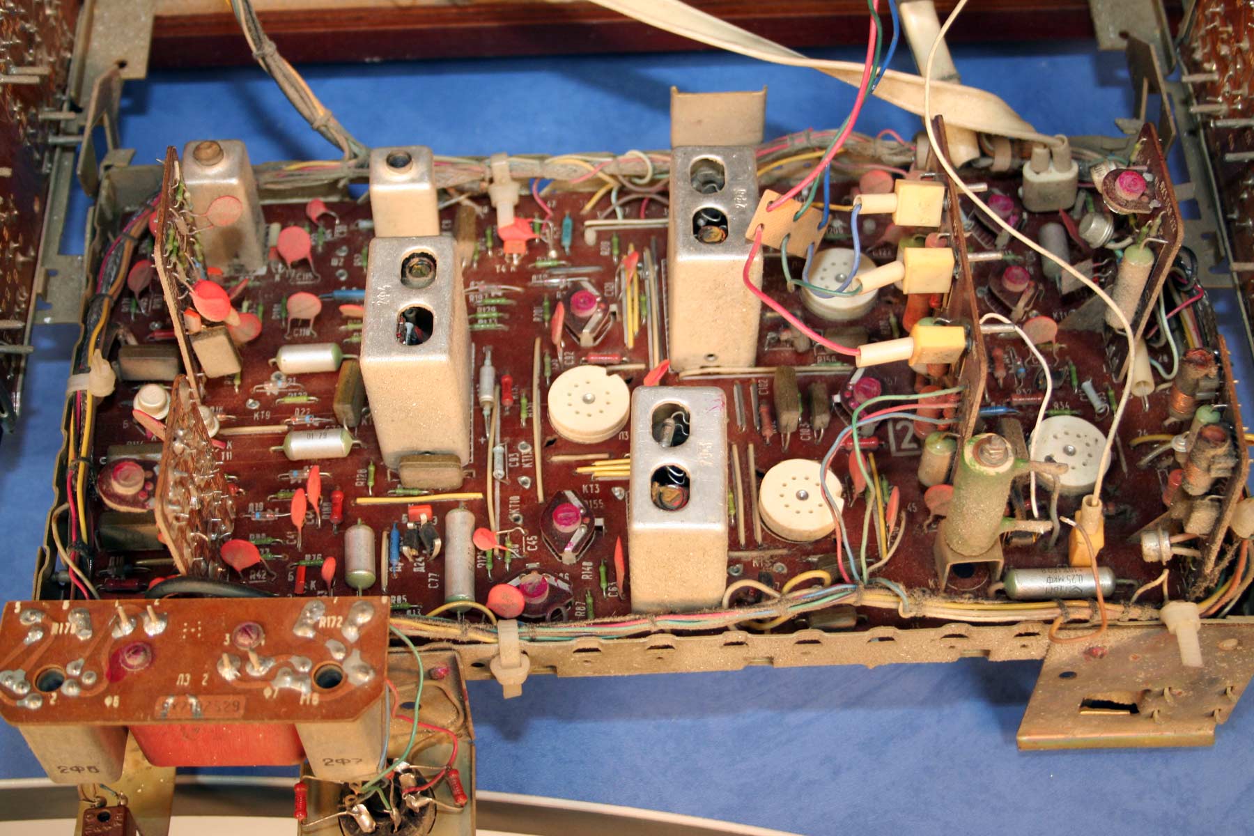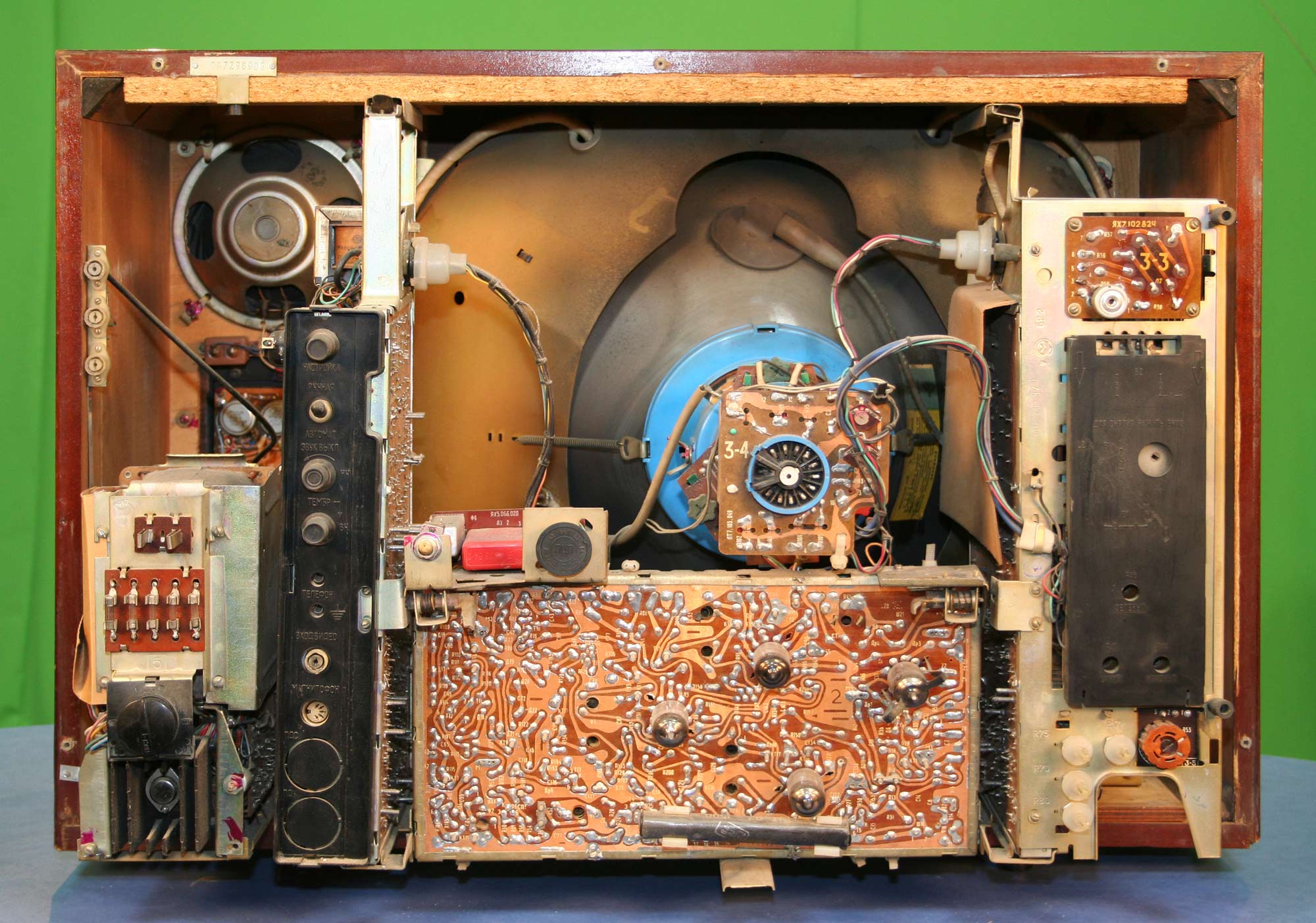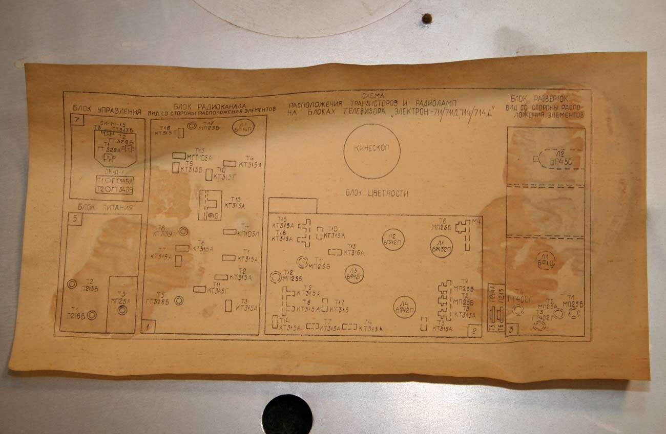 Телевизионный приёмник цветного изображения *Электрон-711/Д* с начала 1975 года выпускало Львовское ПО *Электрон*. Унифицированный стационарный лампово-полупроводниковый цветной телевизор 2 класса **Электрон-711** (УЛПЦТ-59-II-11/10) на кинескопе 59ЛКЗЦ с размером изображения 475x375 мм, предназначен для приёма телевизионных программ в цветном и чёрно-белом изображении. В телевизоре имеется возможность установки блока СКД для приёма в диапазоне ДМВ, а в телевизоре с индексом *Д* блок СКД уже установлен. Чувствительность телевизора в МВ диапазоне - 50 мкВ. Номинальная выходная мощность усилителя - 1,5 Вт. Диапазон воспроизводимых частот - 80...12500 Гц. Потребляемая мощность 260 Вт. Вес ТВ 57 кг, габариты - 535 х 550 х 790 мм. Цена 650 рублей. Корпус облицован ценными породами дерева.