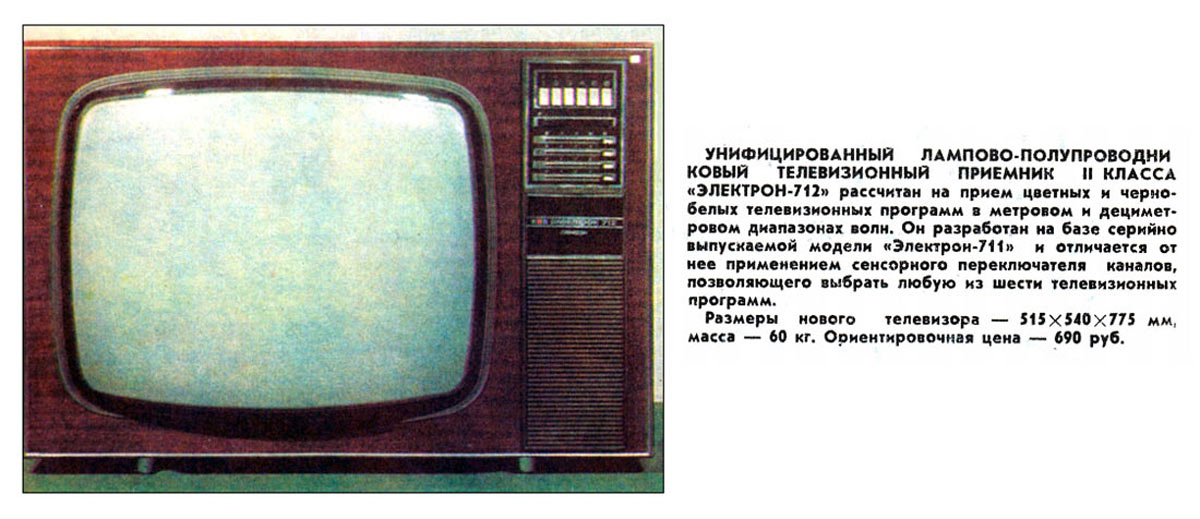 Унифицированные цветные телевизоры 2 класса *Электрон-712* и *Электрон-718* с 1976 года выпускал Львовский телевизионный завод. ТВ рассчитаны на приём цветных и ч/б передач в диапазонах МВ и ДМВ. Модели разработаны на базе ТВ **Электрон-711**, имеют общую схему, конструкцию и оформление, отличаясь от базового сенсорным переключением каналов и размером кинескопа. В телевизоре **Электрон-712** применён кинескоп 59ЛК3Ц, **Электрон-718** 61ЛК3Ц (4Ц). Габариты любой модели 515х540х775 мм. Масса 60 кг. Цена ТВ 725 и 755 рублей.