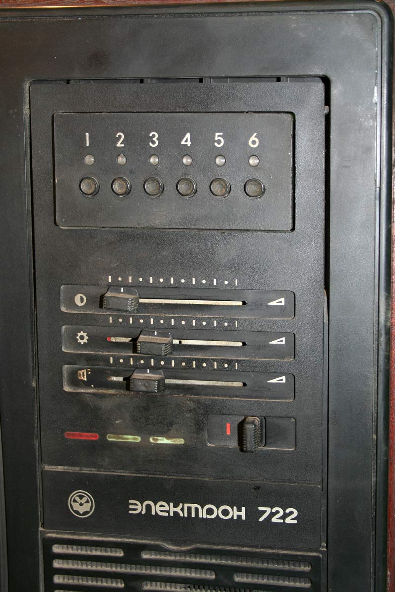 Телевизионный приёмник цветного изображения *Электрон-722/Д* с I-кв 1979 года выпускал Львовский телевизионный завод. Унифицированный лампово-полупроводниковый цветной телевизор 2-го класса **Электрон-722/Д** предназначен для приёма программ телевизионных станций в МВ, а с индексом **Д** и в ДМВ диапазоне волн. Телевизор выполнен на основе унифицированной модели УЛПЦТ-61-II-13. В телевизоре используется ряд новых узлов: сенсорный блок выбора программ СВП-4, блоки радиоканала БРК-З, цветности БЦ-З и селекторов каналов в МВ (блок СКМ-23) и ДМВ (блок СКД-22) диапазонах. В небольшой партии телевизоров использованы другие селекторы. Тракт звукового сопровождения ТВ работает на две встроенные динамические головки 2ГД-36 и 3ГД-38Е. Номинальная выходная мощность 2,5 Вт. Диапазон воспроизводимых частот - 63...12500 Гц. Габариты модели 775х560х650 мм, его вес без упаковки 66 кг. Розничная цена телевизора 755 рублей, телевизора с индексом **Д** - 780 рублей.