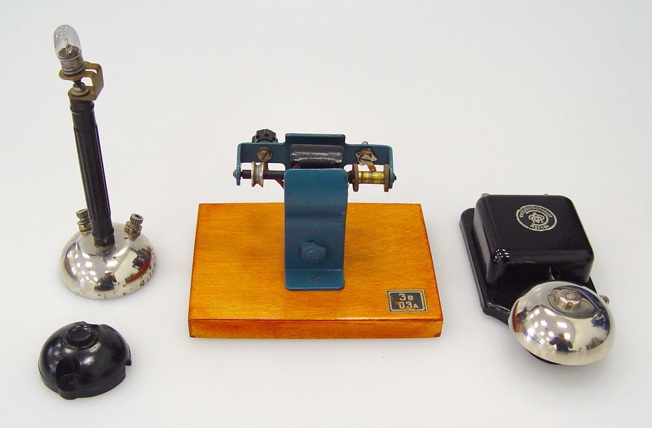 Набор по электротехнике №1 выпускался с 1949 года Московским заводом *Физэлектроприбор*. Набор предназначен для демонстрации нескольких электрических устройств, таких как настольная лампа, выключатель, электрический звонок и электродвигатель. Фото с сайта https://collectionerus.ru/.