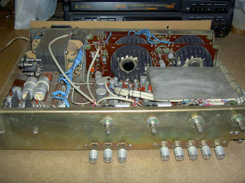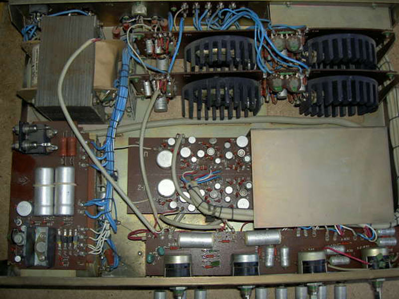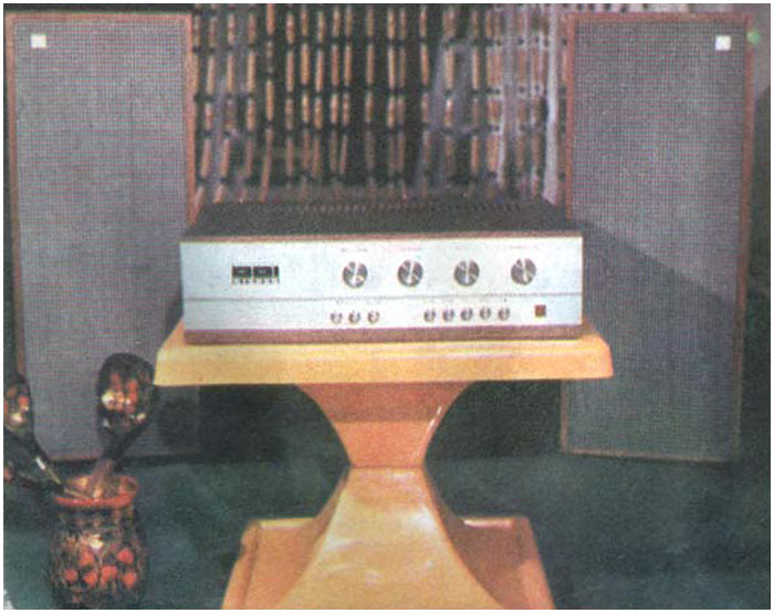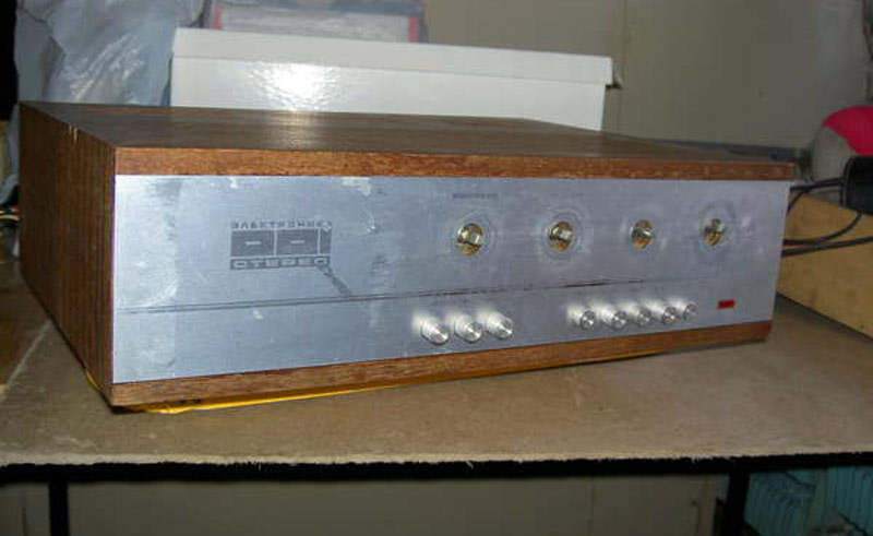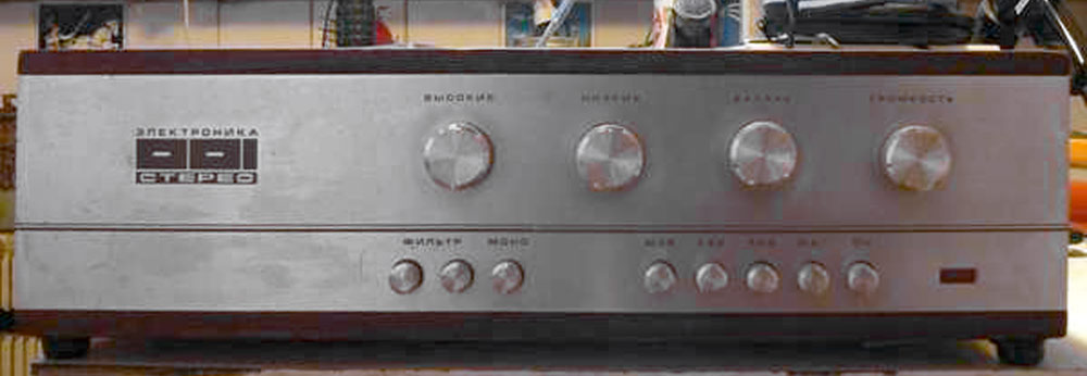 Стереофонический усилитель *Электроника-001-стерео* выпускался с 1974 года. Усилитель *Электроника-001-стерео* предназначен для усиления сигналов от ламповых и транзисторных радиоприемников, магнитофонов, электропроигрывателей с пьезокерамическими или электромагнитными звукоснимателями, а также от электромузыкальных инструментов. Следует отметить такие особенности этого усилителя как использование низкоомного входа с дополнительными коррекцией и усилением для подключения электромагнитного звукоснимателя, а также применение нестабилизированного выпрямителя со средней точкой, позволившего избавиться от выходных разделительных и габаритных конденсаторов большой емкости. В комплекте две акустические системы, в каждой из которых установлено два низкочастотных громкоговорителя 4ГД.28, один среднечастотный 4ГД-8Е и один высокочастотный ЗГД-31. Технические параметры усилителя: Номинальная выходная мощность усилителя - 15 Вт, максимальная 35 Вт. Рабочий диапазон воспроизводимых звуковых частот, при КНИ около 1% - 20...20000 Гц. Электрическое сопротивление акустических систем 8 Ом. Габариты усилителя - 430х321х124 мм. Габариты одной акустической системы - 600х310х240 мм. Масса усилителя 9 кг. Масса одной акустической системы 12 кг. Розничная цена усилителя с двумя акустическими системами 620 рублей.
