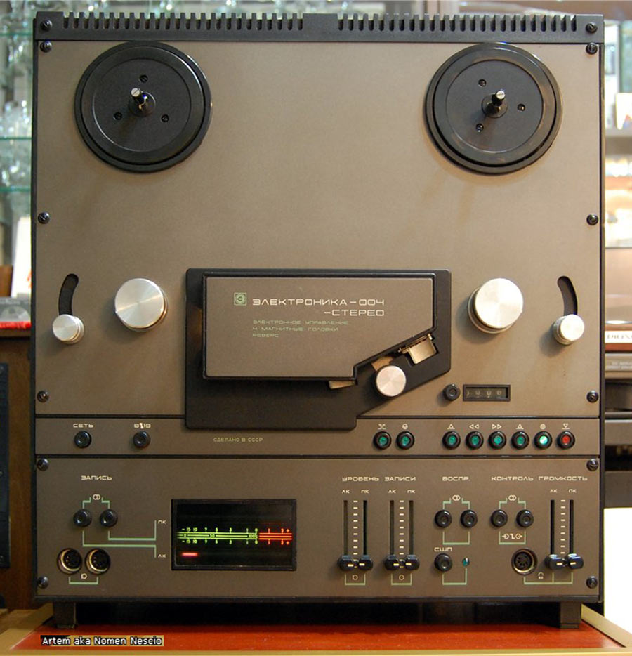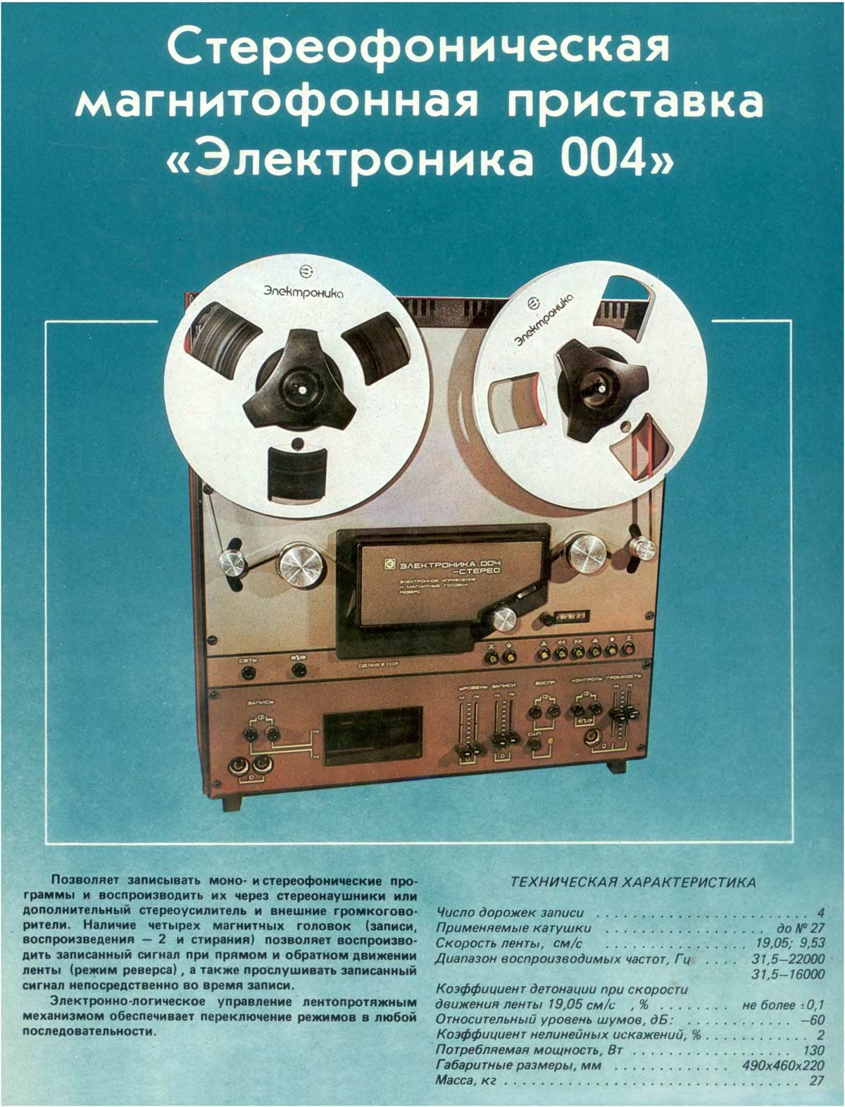 Магнитофон-приставка *Электроника-004* с 1983 года выпускал Фрязинский завод *Рений* в составе НПО *Исток*. Реверсивный 4-х дорожечный двухскоростной стереофонический МП высшей группы сложности, предназначенный для высококачественной записи речевых и музыкальных программ на ленту А4409-6Б с последующим или одновременным их воспроизведением через внешний, стереоусилитель с АС и на головные стереотелефоны. Скорость движения ленты 19,05; 9,53 см/с. Рабочий диапазон частот на линейном выходе: на скорости 19,05 см/с не уже 31,5...22000 Гц, на скорости 9,53 см/с; не уже 31,5...16000 Гц. Потребляемая мощность 130 Вт. Габариты МП 495x458x220 мм. Масса 27 кг. Позднее Киевский завод *Генератор* и Саратовский экспериментальный завод прецизионного оборудования выпускали аналогичные МП с названиями *Электроника-004К* и *Электроника-004С*. Фрязинский завод *Рений* с 1984 года на базе МП *Электроника-004* выпускал многоканальный регистратор оперативной диспетчерской связи с наименованием *Электроника-004Д*.