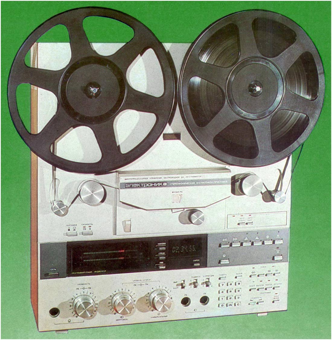 Стереофоническая катушечная магнитофонная приставка *Электроника-007* в начале 1987 года была подготовлена к выпуску Фрязинским заводом *Рений*. В МП с помощью восьмиразрядной разрядной микро ЭВМ реализовано свыше 70 функций, основными из которых являются: программирование воспроизведения фонограмм по электронному счетчику или по их порядковым номерам с возможностью повторения программ; автопоиск; возможность обзора записанных на ленте фонограмм; возможность коррекции АЧХ и уровня тока подмагничивания в зависимости от типа магнитной ленты; автовыключение магнитофона от сети; отображение информации на многоцветном дисплее. В МП имеется корректировка фазовых искажений при воспроизведении и полуавтоматическая регулировка уровня записи, улучшающие качество фонограмм. Пульт дистанционного управления на инфракрасных лучах позволяет на расстоянии до 8 метров пода вать команды, реализующие более 25 режимов работы, включая и программирование воспроизведения. Скорость движения магнитной ленты 19,05 см/с и 9,53 см/с. Диапазон записываемых или воспроизводимых частот на скорости 19,05 см/с 20...25000 Гц. Коэффициент детонации на скорости 19,05 см/с ±0,08%. Уровень шумов и помех -62 дБ. КНИ 1,2%. Относительный уровень стирания -70 дБ. Габаритные размеры магнитофонной приставки - 495x440x240 мм. Её масса 24 кг.