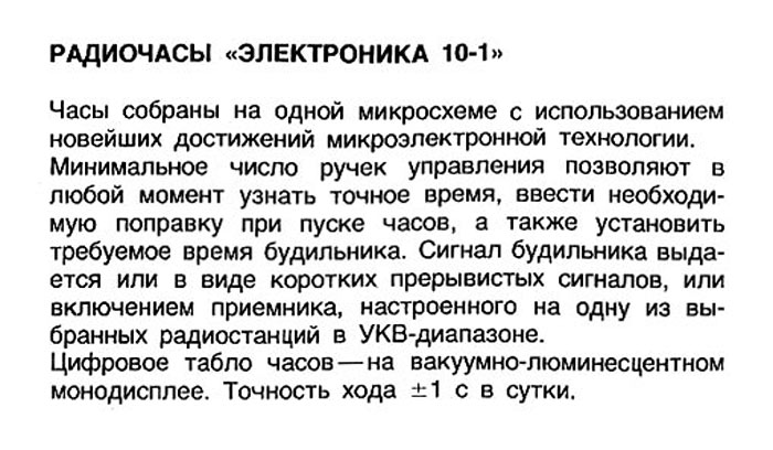 Радиочасы *Электроника 10-1* подготовлены к выпуску с 1986 года. Рекламный проспект. Информации о серийном производстве не найдено.