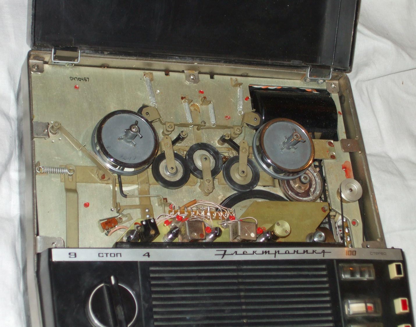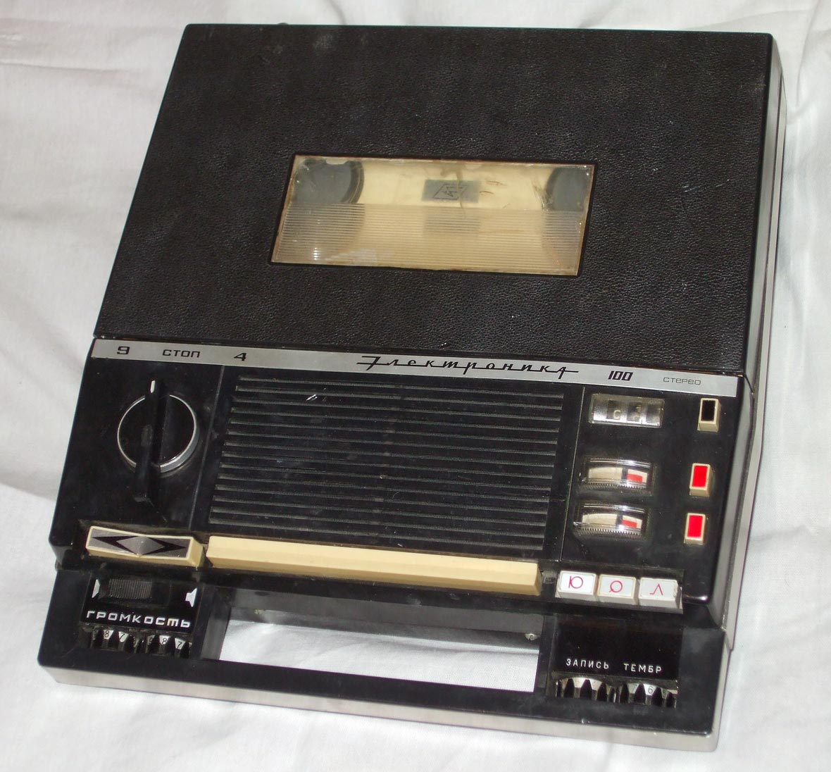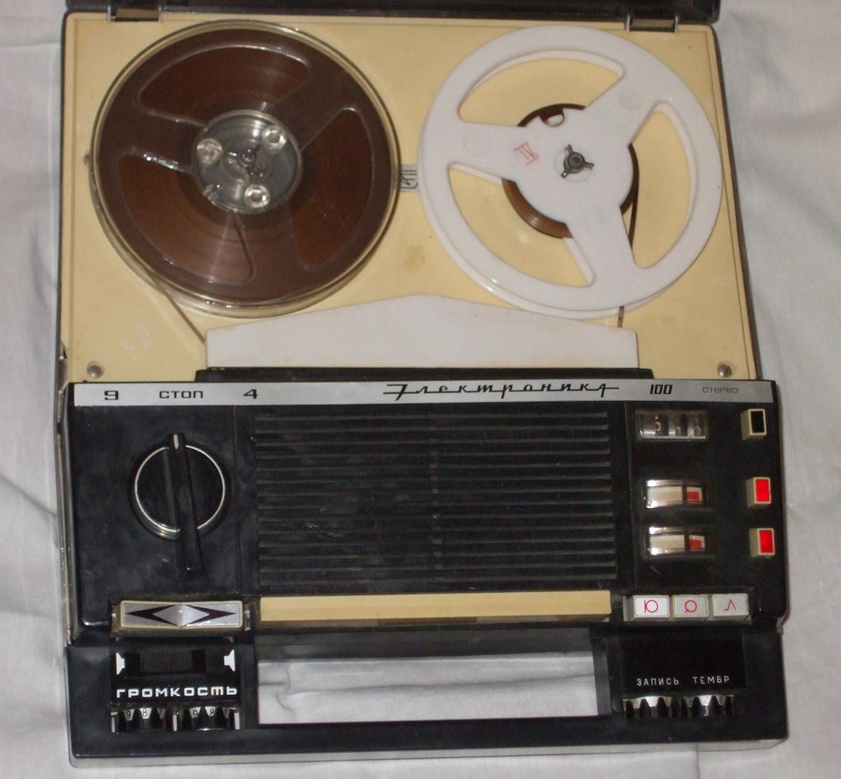 Переносной катушечный магнитофон *Электроника-100-стерео* с 1970 года выпускал Учкекенский завод *Элия*. Магнитофон выпущен малой серией к 100-летию со дня рождения В.И.Ленина. Предназначен для записи и последующего воспроизведения звуковых фонограмм. Скорости протяжки ленты 4,76 и 9,53 см/сек. Первая скорость 4,76 см/сек предназначена для записи речи. Магнитофон имеет функции: записи моно или стереофонических фонограмм; записи фонограмм в режиме моно на любую из 4 дорожек; записи одновременно на 2 дорожки; прослушивание фонограммы в процессе записи; одновременной записи на одну и прослушивание другой дорожки в моно режиме; ускоренную перемотку ленты в обе стороны. В магнитофоне имеется регулировка тембра ВЧ. Диапазон записывемых и воспроизводимых частот (на линейном выходе) не уже: на скорости 4,76 см/сек - 80...6000 Гц; 9,53 см/сек - 50...14000 Гц. Диапазон частот по звуковому давлению на собственных АС на большей скорости 100...10000 Гц. В модели имеется контрольный громкоговоритель, который воспроизводит полосу частот 200...8000 Гц. Номинальная выходная мощность на внешние АС - 1 Вт, на громкоговоритель 0,25 Вт. Питание от батарей А-373 или от выносного стабилизированного БП.