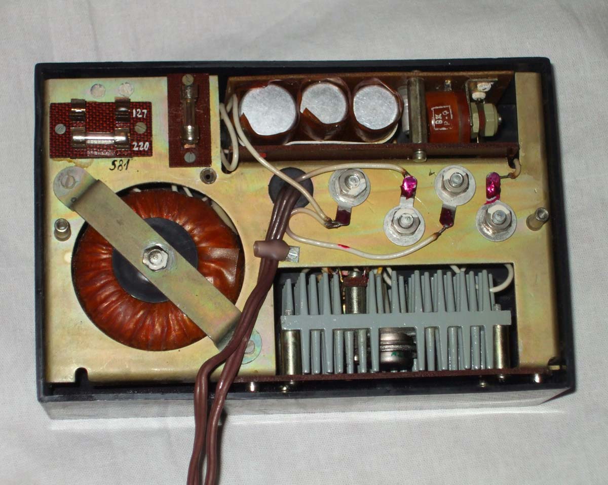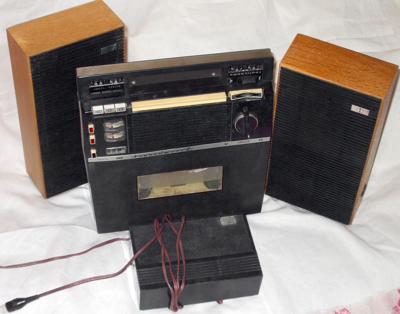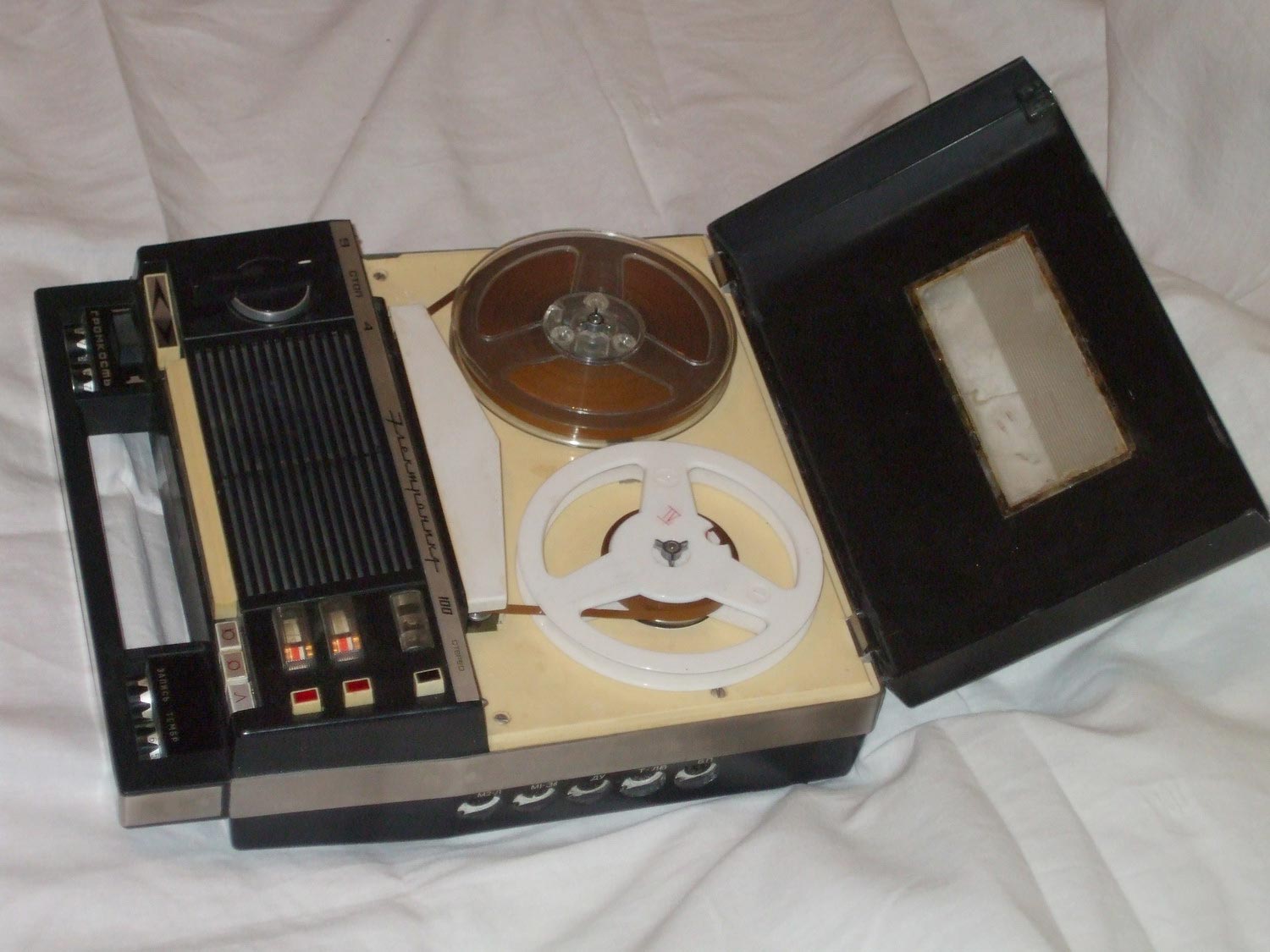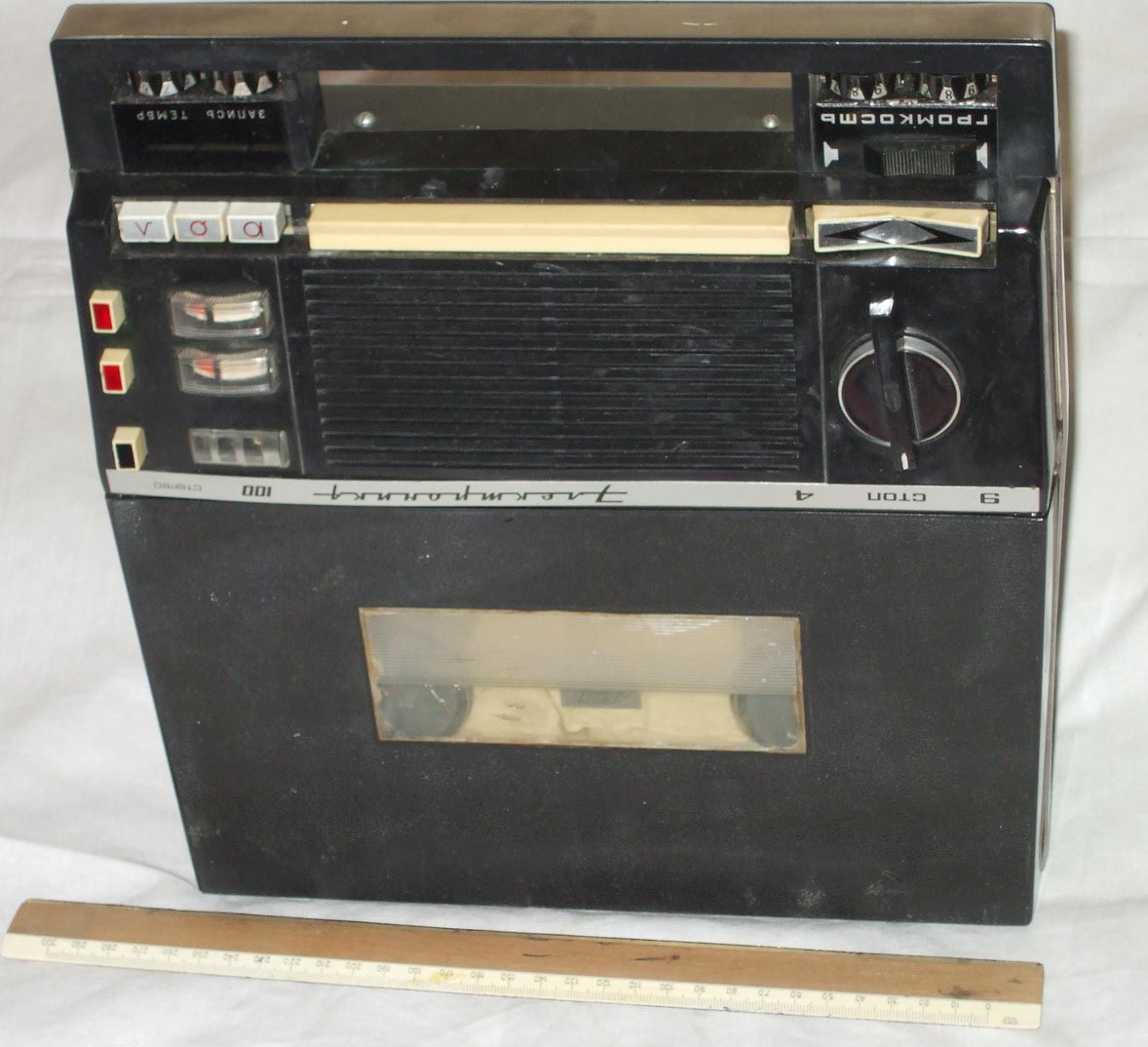 Переносной катушечный магнитофон *Электроника-100-стерео* с 1970 года выпускал Учкекенский завод *Элия*. Магнитофон выпущен малой серией к 100-летию со дня рождения В.И.Ленина. Предназначен для записи и последующего воспроизведения звуковых фонограмм. Скорости протяжки ленты 4,76 и 9,53 см/сек. Первая скорость 4,76 см/сек предназначена для записи речи. Магнитофон имеет функции: записи моно или стереофонических фонограмм; записи фонограмм в режиме моно на любую из 4 дорожек; записи одновременно на 2 дорожки; прослушивание фонограммы в процессе записи; одновременной записи на одну и прослушивание другой дорожки в моно режиме; ускоренную перемотку ленты в обе стороны. В магнитофоне имеется регулировка тембра ВЧ. Диапазон записывемых и воспроизводимых частот (на линейном выходе) не уже: на скорости 4,76 см/сек - 80...6000 Гц; 9,53 см/сек - 50...14000 Гц. Диапазон частот по звуковому давлению на собственных АС на большей скорости 100...10000 Гц. В модели имеется контрольный громкоговоритель, который воспроизводит полосу частот 200...8000 Гц. Номинальная выходная мощность на внешние АС - 1 Вт, на громкоговоритель 0,25 Вт. Питание от батарей А-373 или от выносного стабилизированного БП.