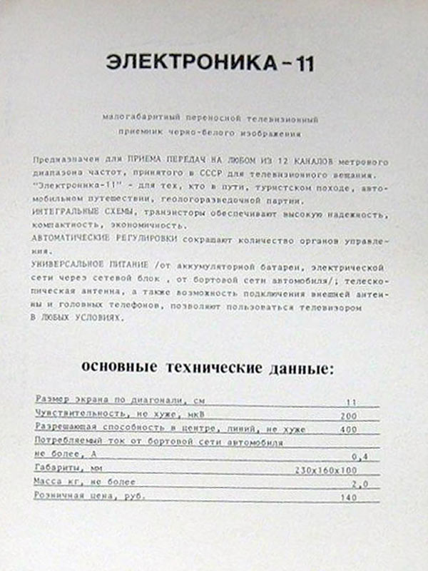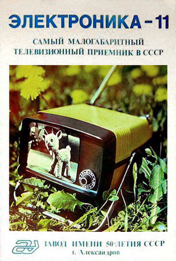 Телевизионный приёмник чёрно-белого изображения *Электроника-11* с 1977 года выпускал Александровский завод имени 50-летия СССР. Телевизор создан на базе опытного телевизора *Электроника* в небольшом количестве выпущенным этим же заводом в 1975 году и практически, кроме оформления его повторяет. В свою очередь уже телевизор *Электроника-11* стал основой для выпуска с 1982 года телевизора *Электроника-450*. *Электроника-11* - это малогабаритный телевизор для приёма телевизионных программ в диапазоне МВ. В телевизоре применён кинескоп 11ЛК1Б с размером диагонали экрана 11 см. Чувствительность с телескопической антенной 200 мкВ, при подключении внешней около 50 мкВ. Разрешающая способность в центре экрана 400 линий. Номинальная выходная мощность 50 мВт. Диапазон воспроизводимых частот звука - 300...5000 Гц. Питание ТВ осуществляется от сети переменного тока через выносной блок питания или от аккумуляторов. Потребляемая мощность 10 и 6 Вт соответственно. Габариты телевизора - 100 х 160 х 230 мм. Его масса 2 кг.