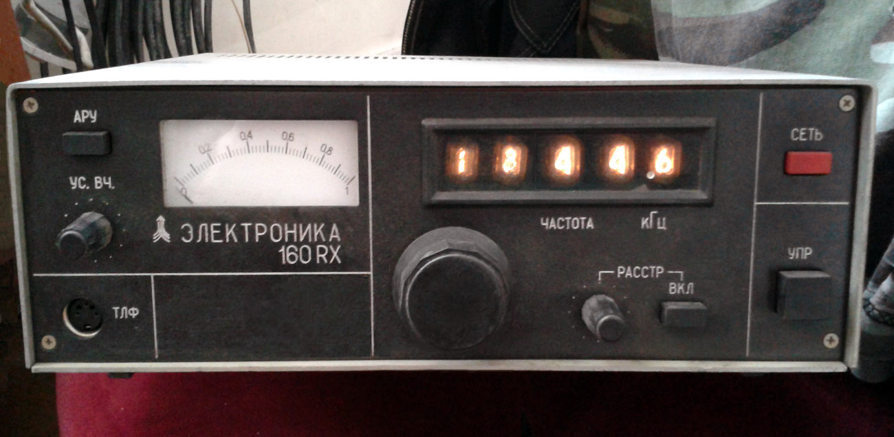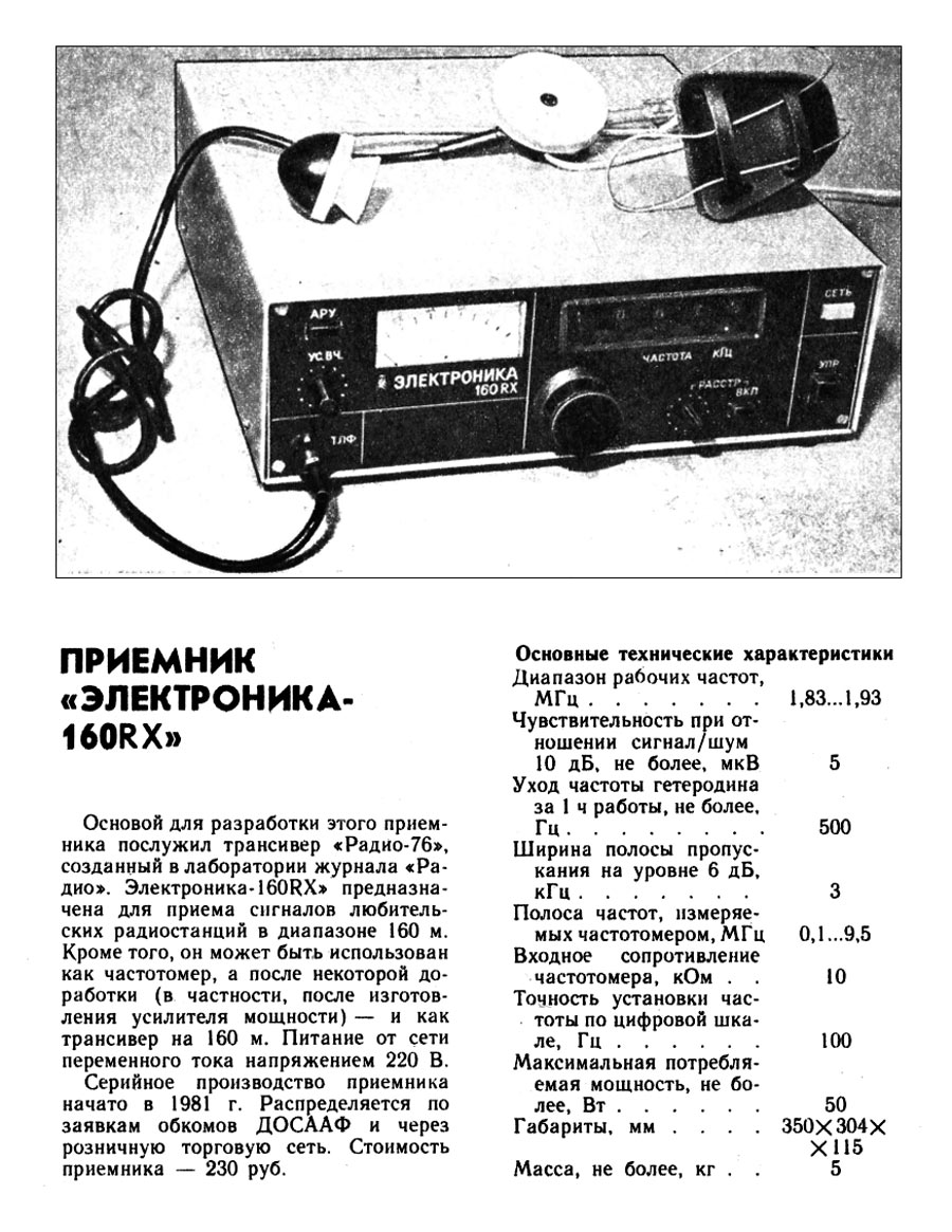 Любительский радиоприёмник *Электроника-160 RX* выпускался с 1981 года Ульяновским радиоламповым заводом. Основой для разработки приёмника послужил трансивер *Радио-76*, созданный в лаборатории журнала *Радио*. Радиоприёмник **Электроника-160 RX** предназначен для приёма сигналов любительских радиостанций в диапазоне 160 метров. Кроме того, он может быть использован как частотомер, а после после изготовления усилителя мощности и как трансивер на диапазон 160 метров. Питание радиоприёмника осуществляется от сети переменного тока. Диапазон рабочих частот 1,83...1,93 МГц. Чувствительность при отношении сигнал/шум 10 дБ - 5 мкВ. Уход частоты гетеродина за 1 час работы ~ 500 Гц. Ширина полосы пропускания на уровне 6 дБ - 3 кГц. Полоса частот, измеряемых частотомером 0,1...9,5 МГц. Входное сопротивление частотомера 10 кОм. Точность установки частоты по цифровой шкале 100 Гц. Потребляемая мощность 50 Вт. Габариты приёмника 350х304х115 мм. Масса 5 кг. Цена 230 рублей. Приёмник распределялся по заявкам обкомов ДОСААФ или реализовывался через торговую розничную сеть.