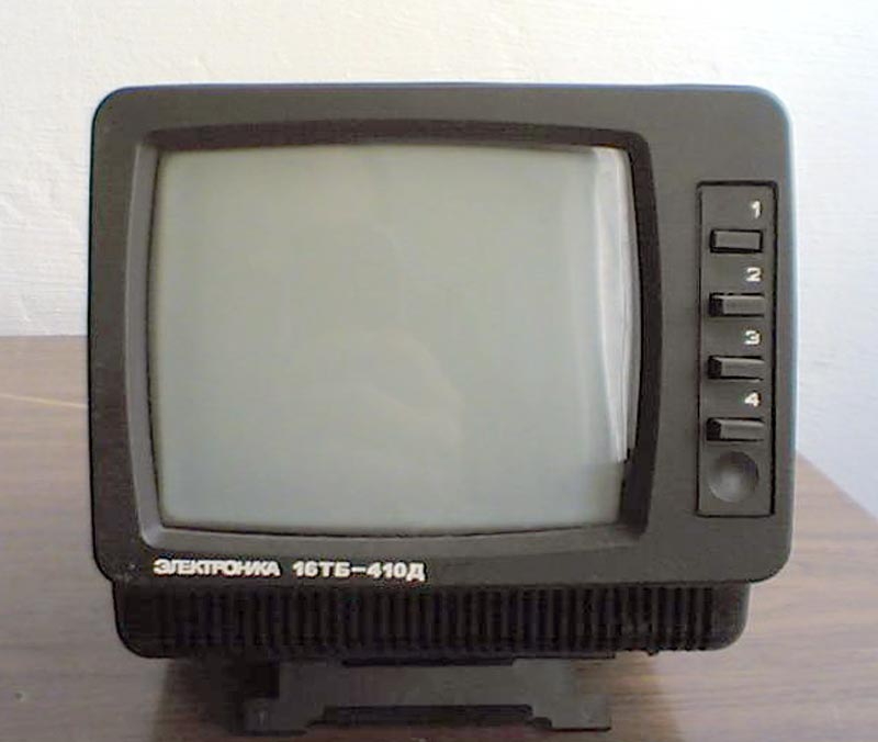 Телевизионный приёмник чёрно-белого изображения *Электроника 16ТБ-410Д* с начала 1988 года выпускал Раховский завод Конденсатор. *Электроника 16ТБ-410Д* - малогабаритный переносной транзисторный телевизор с интегральными схемами. В ТВ применён кинескоп 16ЛК-1Б с диагональю экрана 16 см и с углом отклонения электронного луча 90°. Телевизор обеспечивает приём передач на любом канале MB и ДМВ диапазона; прослушивание звука головными телефонами c отключенной АС. АРУ делает изображение устойчивым. Влияние помех минимально с системой АПЧ и Ф. Чувствительность модели в MB диапазоне 40, ДМВ 70 мкВ. Разрешающая способность в центре экрана по горизонтали 350 линий. Номинальная выходная мощность канала звука 0,25 Вт. Диапазон воспроизводимых звуковых частот 200..5000 Гц. Напряжение питания, при котором телевизор работоспособен: от электросети переменного тока через выносной блок питания 198...242 В, от источника постоянного тока с напряжением 12,5...15,8 В. Потребляемая ТВ мощность от сети 18 Вт, от источника постоянного тока 12 Вт.
