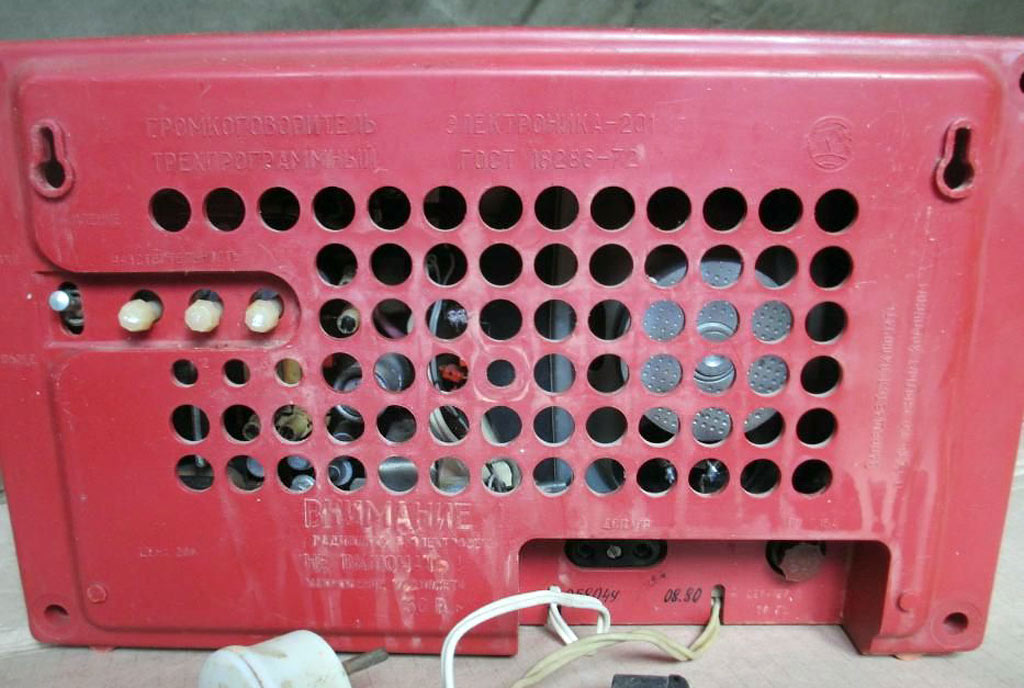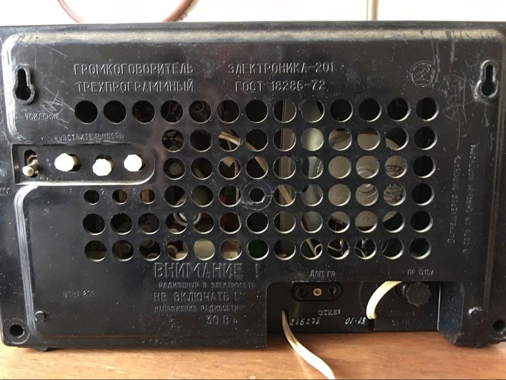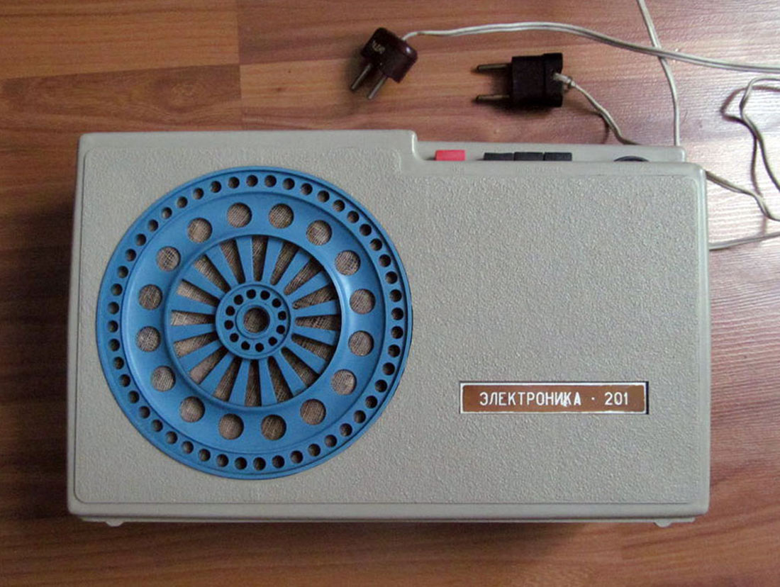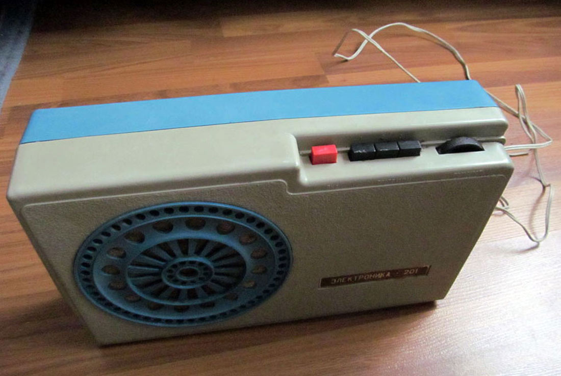 Приёмник трёхпрограммный *Электроника-201* с 1978 года выпускал Ставропольский завод *Изумруд*. ПТ предназначен для работы от радиосети трехпрограммного проводного вещания с напряжением 30 вольт. ПТ позволяет воспроизводить передачи первой программы по дополнительному НЧ каналу без усиления. Диапазон воспроизводимых частот низкочастотной программы 100...10000 Гц. Номинальная выходная мощность 200 мВт. Питание от электрической сети 220 В. Потребляемая мощность 4 Вт. Габариты ПТ - 310х190х83 мм. Вес 3 кг.