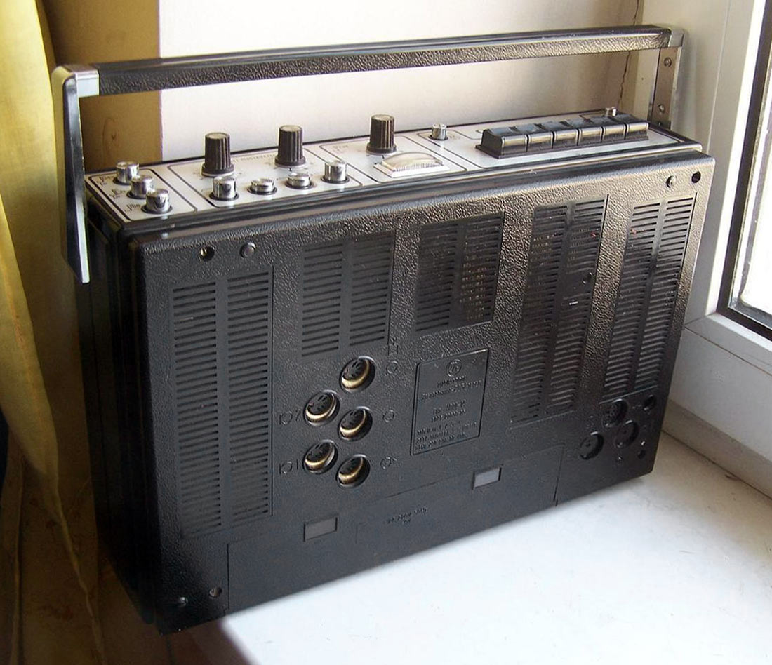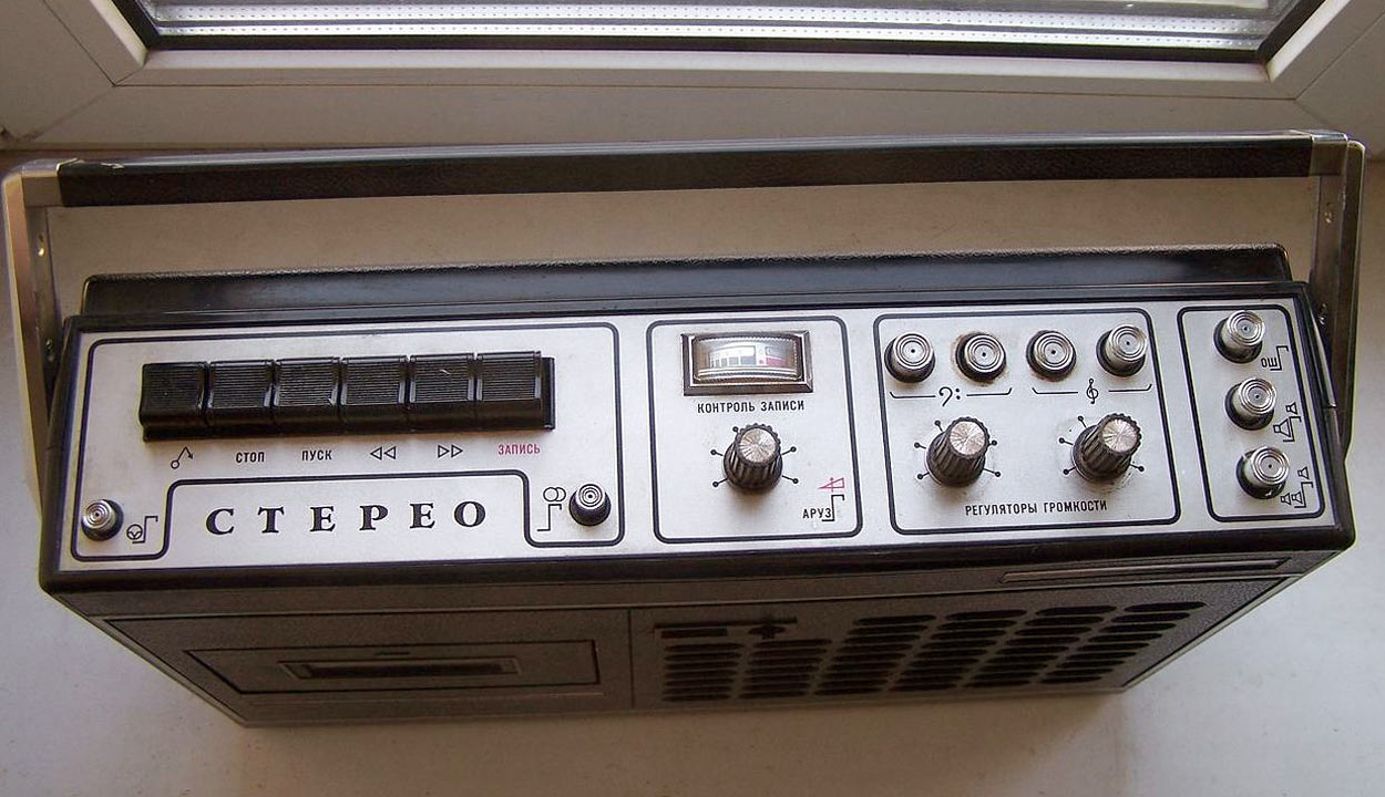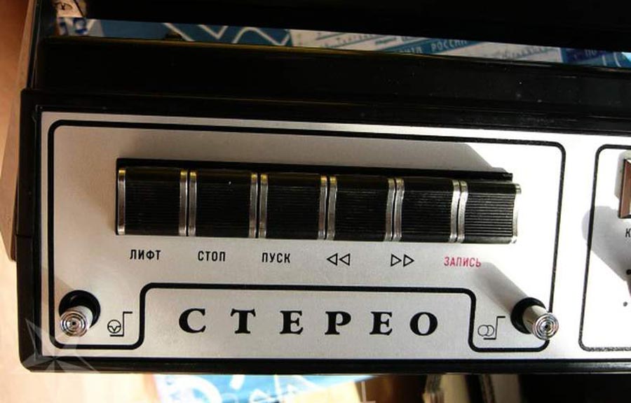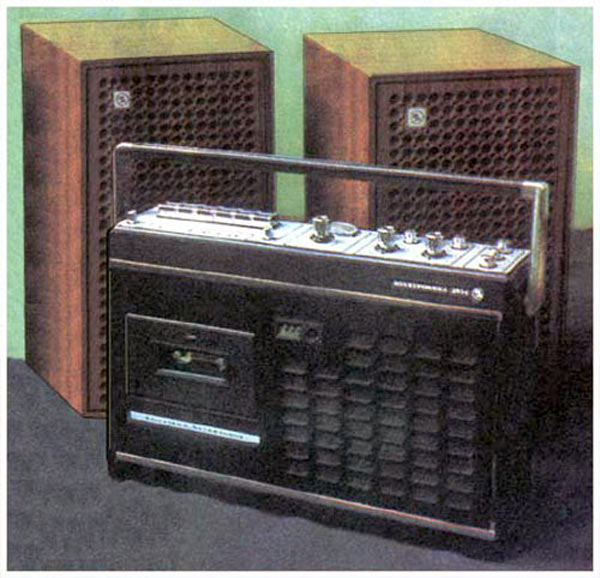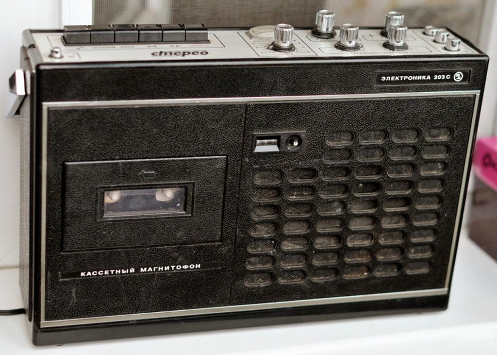 Стереофонический кассетный магнитофон *Электроника-203-стерео* с 1980 года выпускал Зеленоградский завод ТочМаш. Магнитофон рассчитан на запись или воспроизведение фонограмм с кассет типа МК-60. Магнитофон имеет динамический шумоподавитель, отключаемую систему АРУЗ, автостоп при окончании ленты в кассете, счётчик расхода магнитной ленты. Магнитофон может работать на встроенный громкоговоритель типа 2ГД-40 или на выносные АС, в каждой из которых установлено две головки 6ГД-6 и ЗГД-31. Питается магнитофон от шести элементов А-373 или от электрической сети через блок питания БП-203, вставляемый в отсек питания. Номинальная выходная мощность на громкоговоритель - 1 Вт, на внешние АС - 2х2 Вт. Рабочий диапазон звуковых частот на линейном выходе 63...12500 Гц, на собственном громкоговорителе 100...1000 Гц, на АС - 75...12500 Гц. Коэффициент детонации ± 0,3%. Габариты магнитофона - 305х390х108 мм. Вес с АС - 4,5 кг. Цена с АС 360 рублей. Первая партия магнитофонов выпускалась с кнопками тембров, которые впоследствии заменены регуляторами на сопротивлениях.