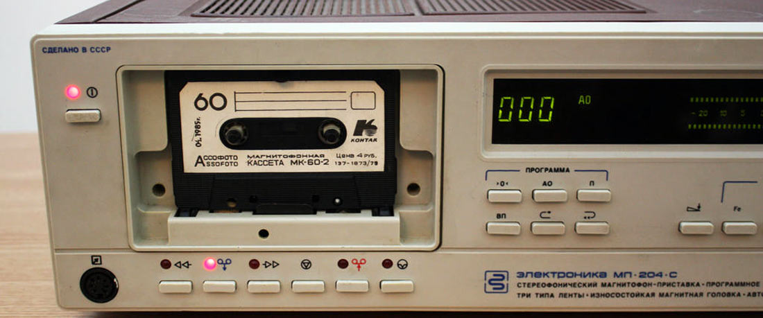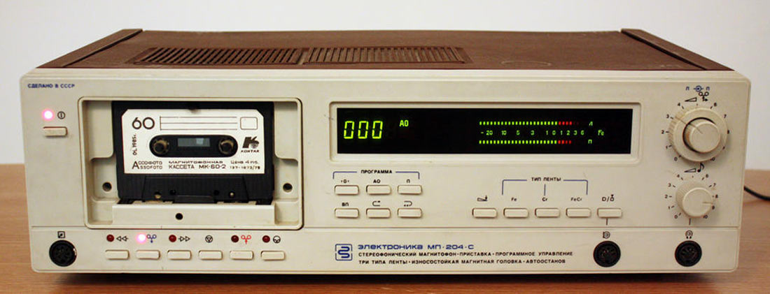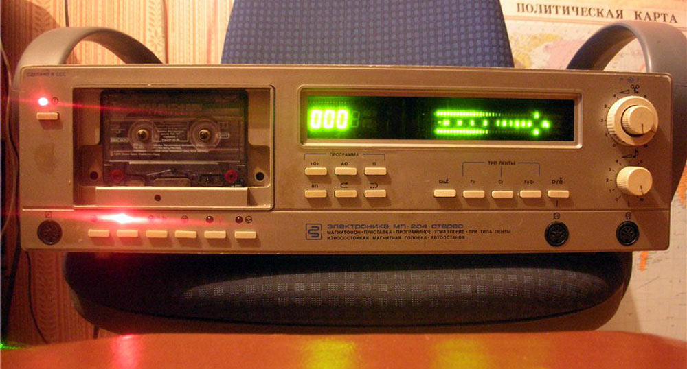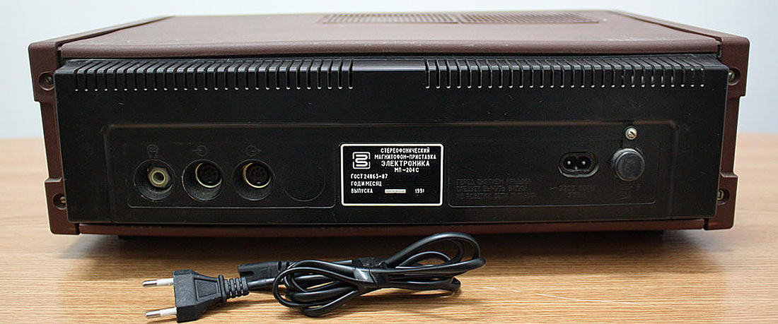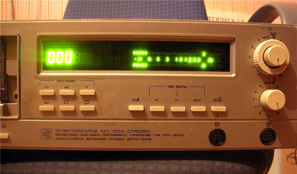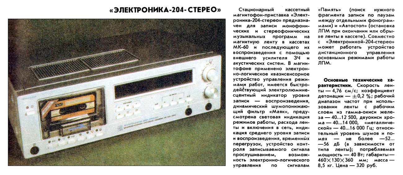 Магнитофон-приставку *Электроника-204-стерео* с 1987 года выпускал Полтавский завод специального технологического оборудования. МП предназначена для записи моно или стереофонических фонограмм на магнитную ленту в кассетах МК и последующего их воспроизведения с помощью внешнего усилителя и АС. В приставке применено электронно-логическое квазисенсорное устройство управления режимами работ, электролюминесцентный индикатор уровня записи и воспроизведения, шумопонижающий фильтр *Маяк*. Есть световая индикация режимов работы, расхода ленты, включения, индикация среднего уровня записи и воспроизведения, перегрузок, контроль записываемого сигнала прослушиванием, электронно-логическое управление ЛПМ по сигналам **Память** (поиск фрагмента записи по паузам между фонограммами) и **Автостоп** (останов ЛПМ по окончании и обрыве ленты). Совместно с МП может работать устройство ДУ основными режимами работы. Скорость движения ленты 4,76 см/с. Коэффициент детонации ±0,2%. Диапазон частот звука при использовании ленты из гамма-окиси железа - 40...12500 Гц, двуокиси хрома - 40...14000 Гц, металлической - 40...16000 Гц. Относительный уровень шумов и помех -54 дБ. Потребляемая мощность 40 Вт. Габариты МП 460х130х360 мм. Масса 8,5 кг. Цена 320 рублей. С 1989 года МП именовался как **Электроника МП-204-cтерео**.