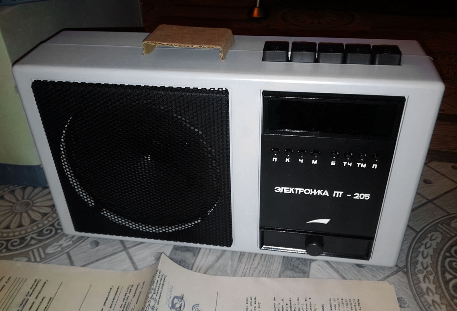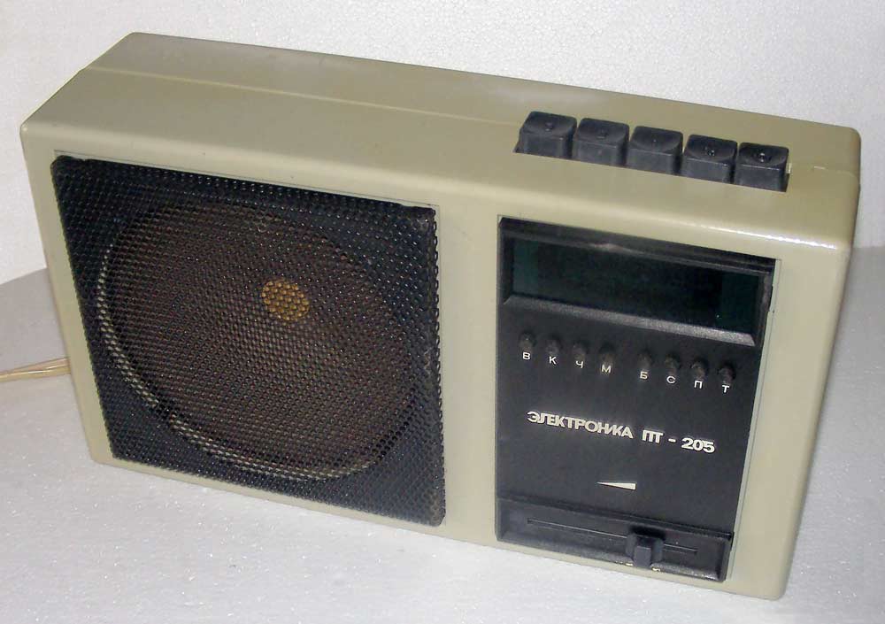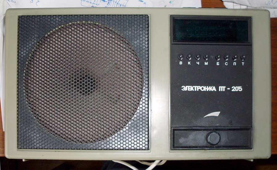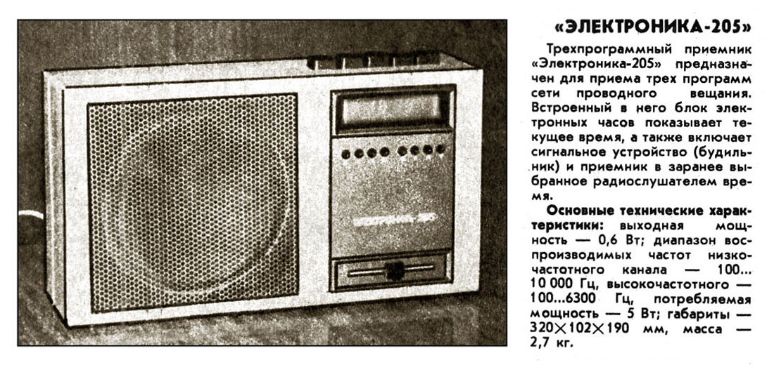 Приёмник трёхпрограммный *Электроника-205* с 1985 года выпускал Богородицкий завод *Ресурс*. Приёмник проводного вещания **Электроника ПТ-205** (с 1987 года *Электроника ПТ-205*) предназначен для работы в уплотнённых радиосетях. ПТ имеет: электронные часы с будильником и таймером; возможность автоматического включения программ. При отсутствии напряжения в сети обеспечивается приём первой НЧ программы по НЧ каналу. Имеется резервное питание часов ПТ от элемента **Крона**. ПТ выпускали как с ползунковыми регуляторами уровня громкости, так и с угловыми. Напряжение сети проводного радиовещания 30 В. Номинальная выходная мощность 0,5 Вт. Диапазон воспроизводимых звуковых частот по каналам РЧ - 160...6300 Гц, по НЧ каналу 100...12500 Гц. Потребляемая мощность 4 Вт. Габариты ПТ - 320 х 195 х 105 мм. Масса 2,4 кг.