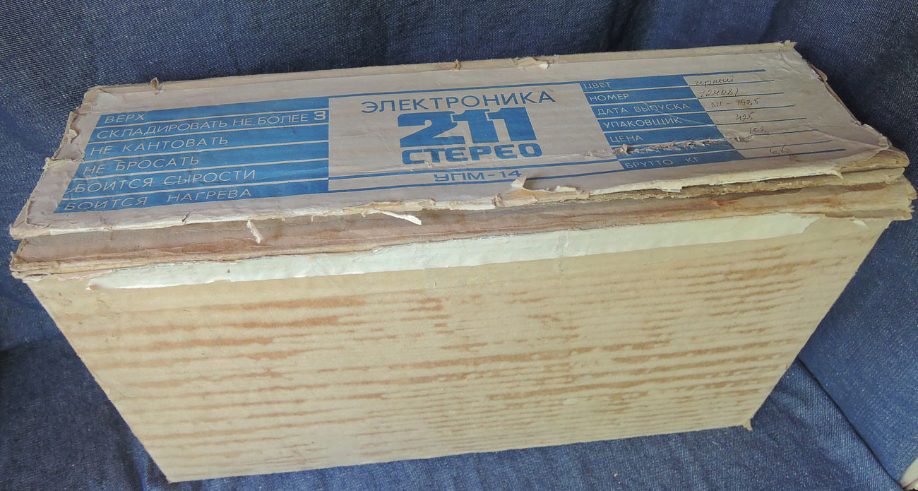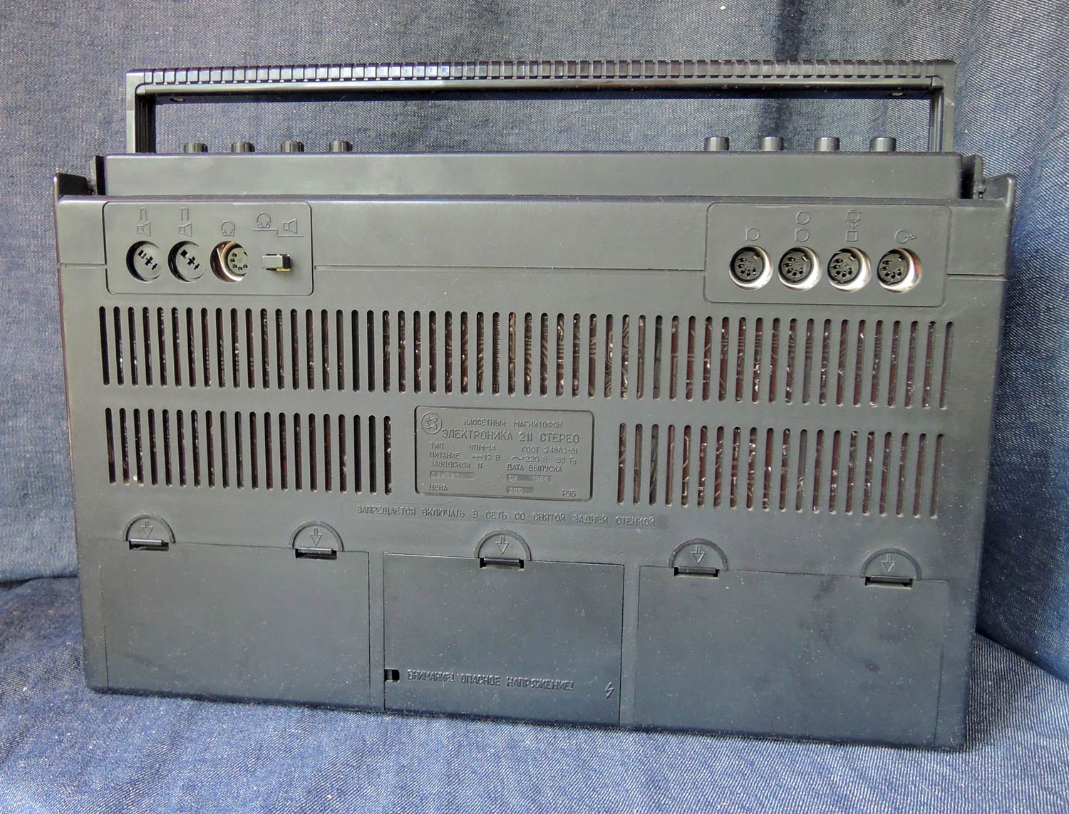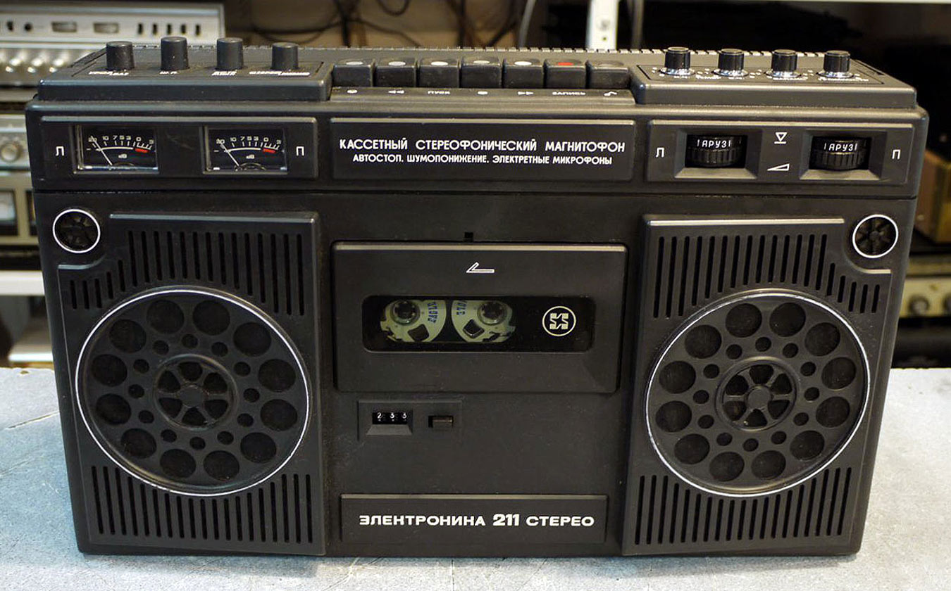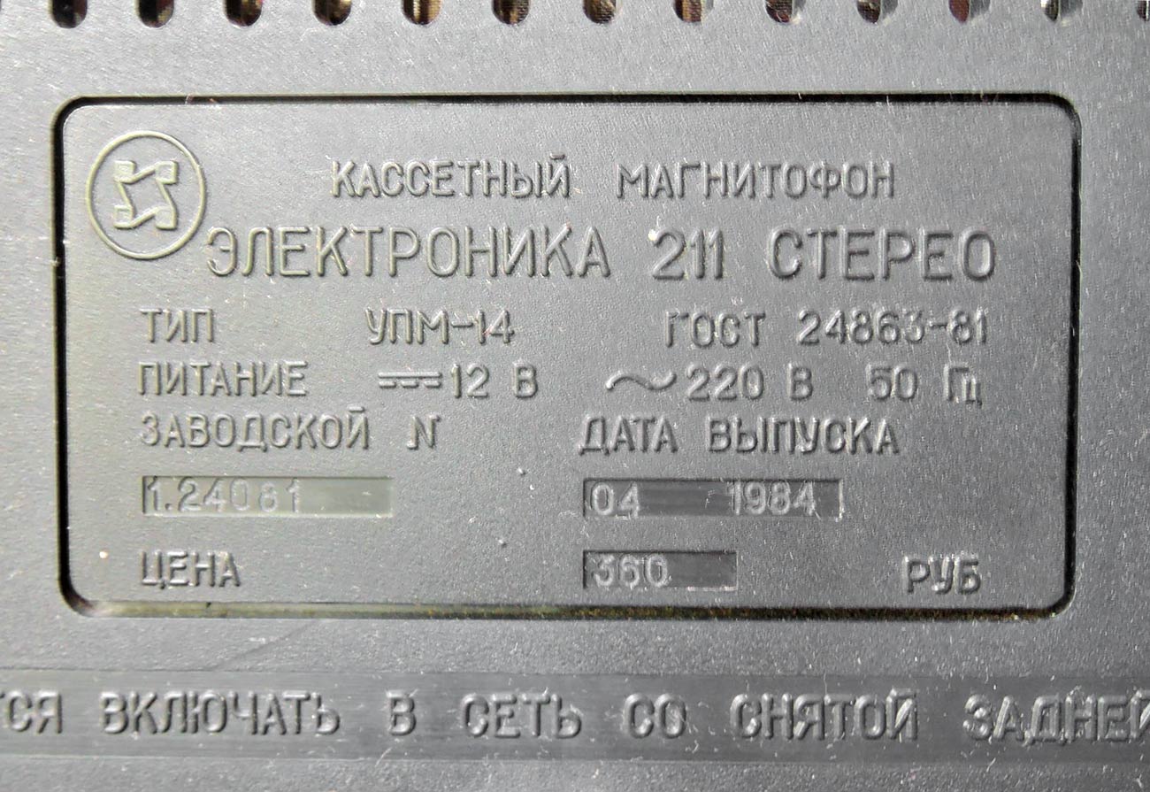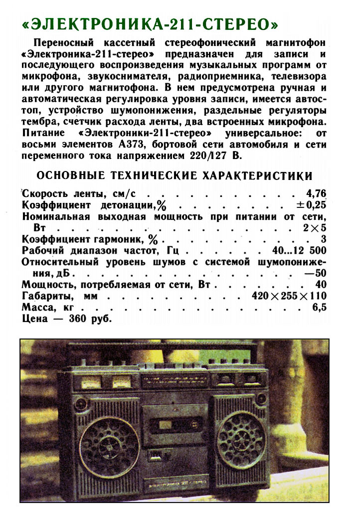 Переносной кассетный магнитофон *Электроника-211-стерео* с 1982 года выпускал Нововоронежский завод *Алиот*. Магнитофон предназначен для записи и воспроизведения звуковых программ с микрофона, приёмника, звукоснимателя, телевизора и другого магнитофона. В магнитофоне предусмотрены ручная и автоматическая регулировка уровня записи, автостоп, устройство шумопонижения, раздельные регуляторы тембра НЧ и ВЧ, счётчик расхода ленты, два микрофона. Питание универсальное: от 8 элементов А-373, бортовой сети автомобиля или от сети переменного тока. Скорость движения ленты 4,76 см/сек. Коэффициент детонации ±0,25%. Номинальная выходная мощность при питании от электросети 2х5 Вт. Коэффициент гармоник 3%. Рабочий диапазон частот на ЛВ - 40...12500 Гц. Относительный уровень шумов с системой ШП -50 дБ. Мощность, потребляемая от сети не более 40 Вт. Габариты магнитофона - 420х255х110 мм. Масса 6,5 кг.